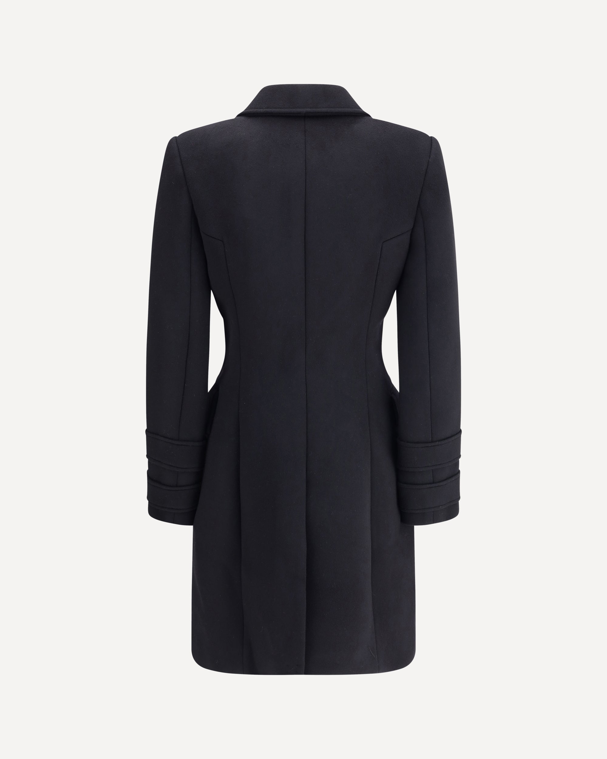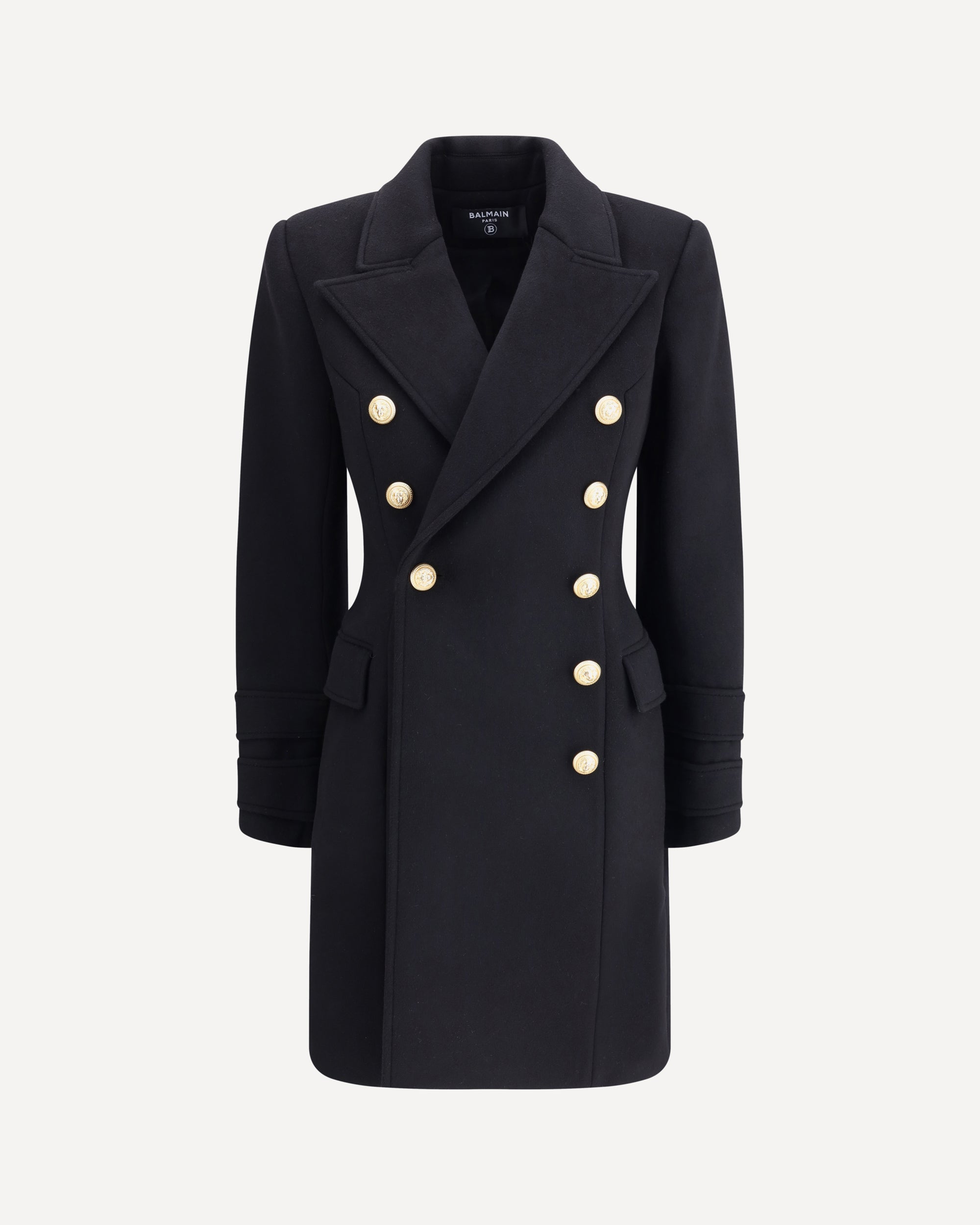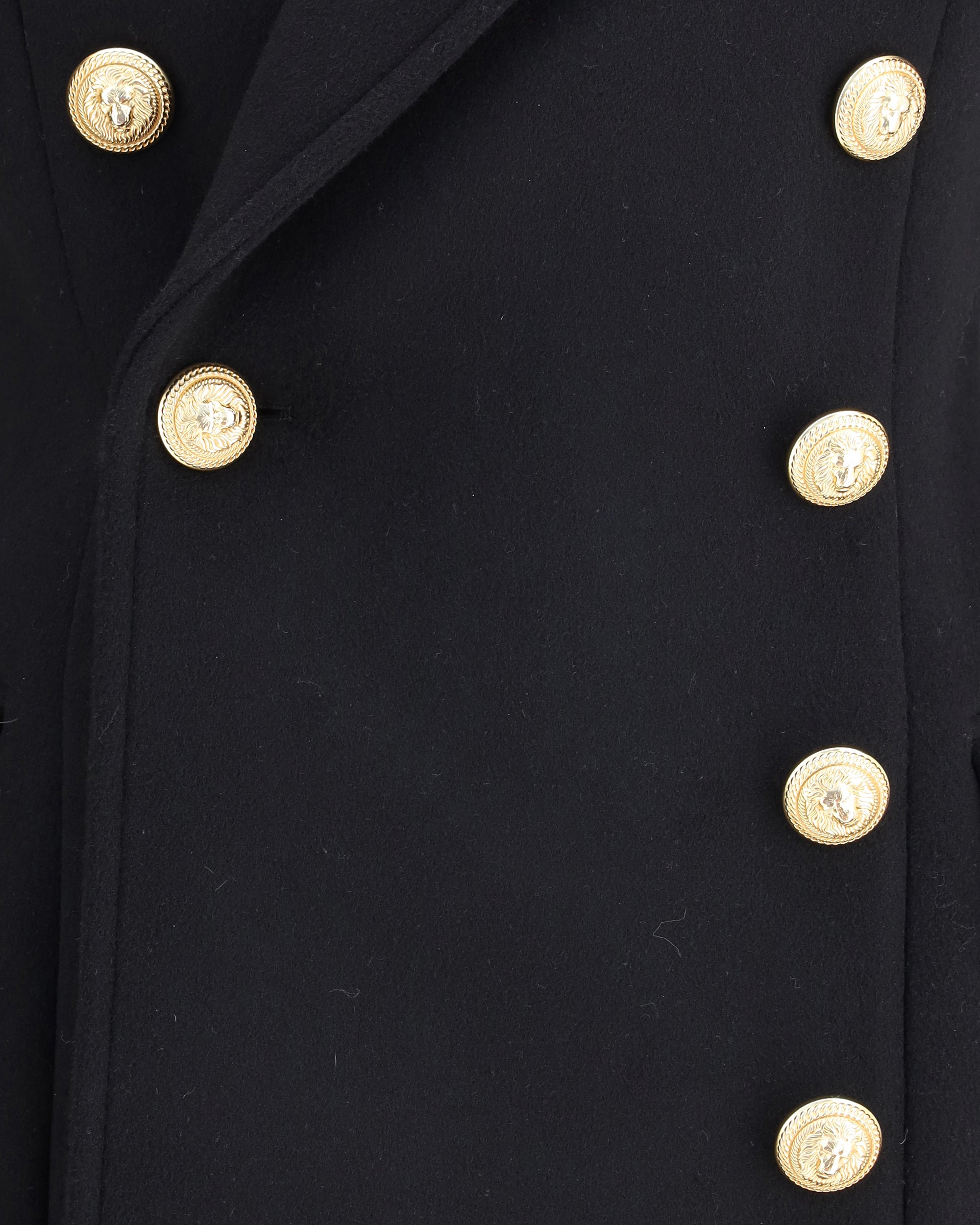 Balmain's wool and cashmere double-breasted coat is a fine tailored piece, featuring a classic Italian collar and structured shoulders that give it a bold profile. Long sleeves with double flaps and two American-style side flap pockets combine functionality and elegance. The double-breasted closure features ten buttons, seven of which are decorative, made of gold metal with the "Lion Chain" motif, the brand's distinctive symbol. Completing the design is an interior American-style buttoned pocket and a serge lining for a straight, midi fit with timeless appeal.