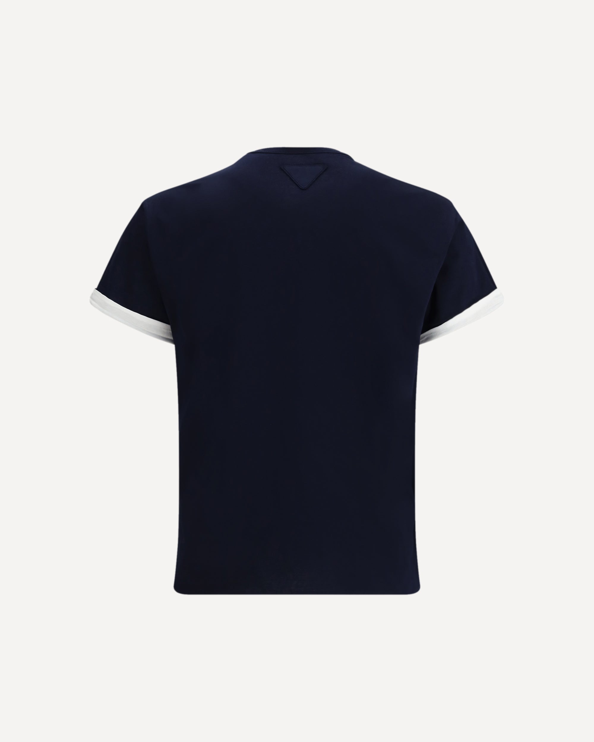 The reversible cotton T-shirt by Prada features a clean, contemporary design with a ribbed neckline, short sleeves, and a boxy fit. Fully reversible, it offers two styling options in one piece, completed by a straight hem and Prada’s signature logo label, adding an iconic finishing touch.