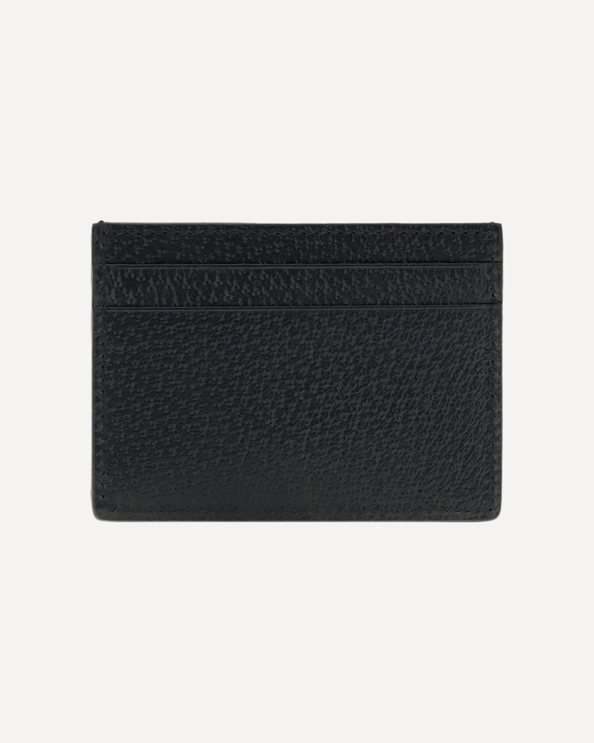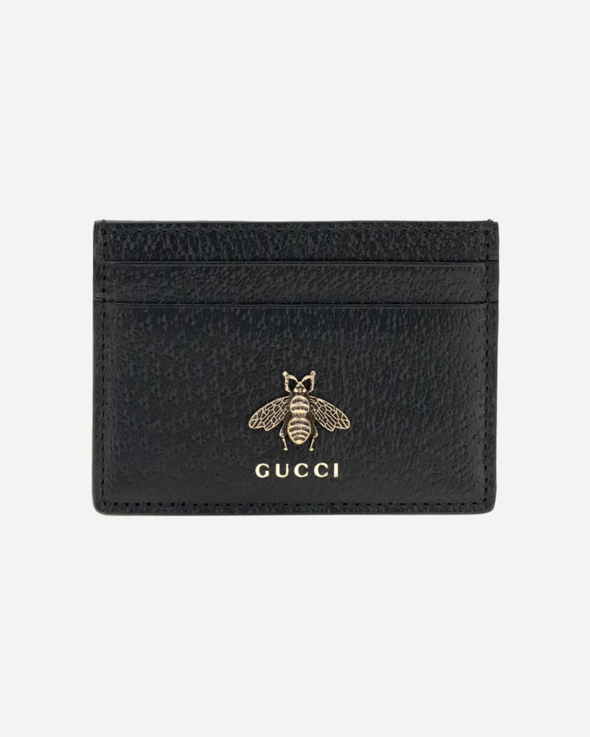 Gucci's Animalier Leather Card Holder is a compact and distinctive accessory, perfect for storing essentials in style. Made of high-quality leather, it is enhanced with gold-tone antiqued trim and the iconic metal Ape logo, accompanied by Gucci's signature on the front. The interior offers four card slots and an open pocket, ideal for receipts or cash. A small luxury item, practical and recognizable.