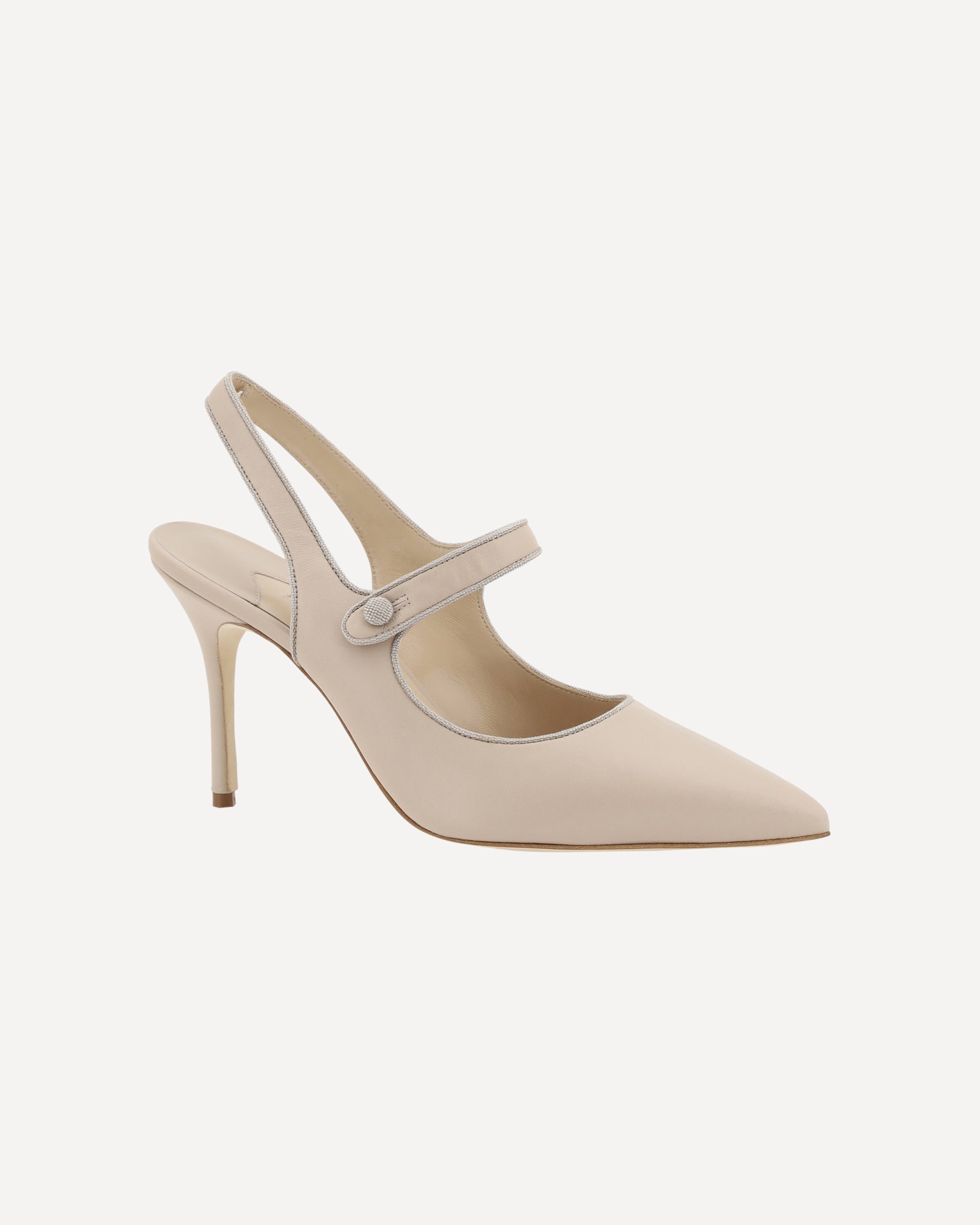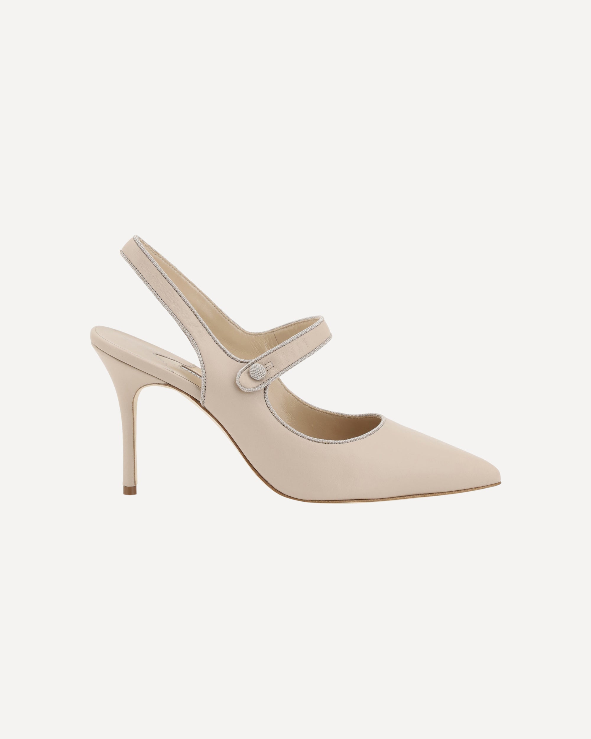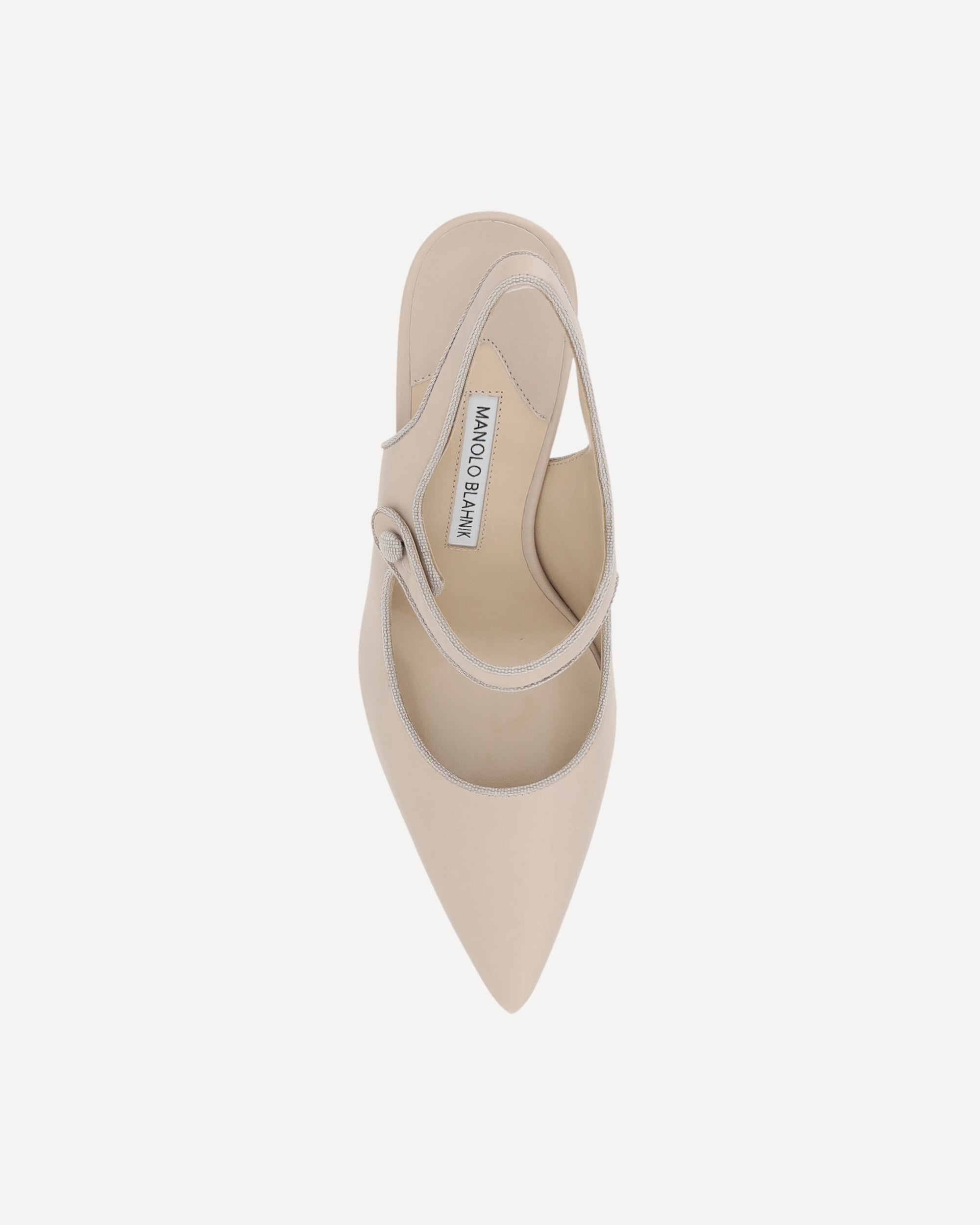Manolo Blahnik's leather Camparisli Pumps feature an elongated toe and leather stiletto heel, enhancing the elegance of the design. The front button closure adds a refined detail, while the contrasting branded insole completes the look with a distinctive and sophisticated touch.