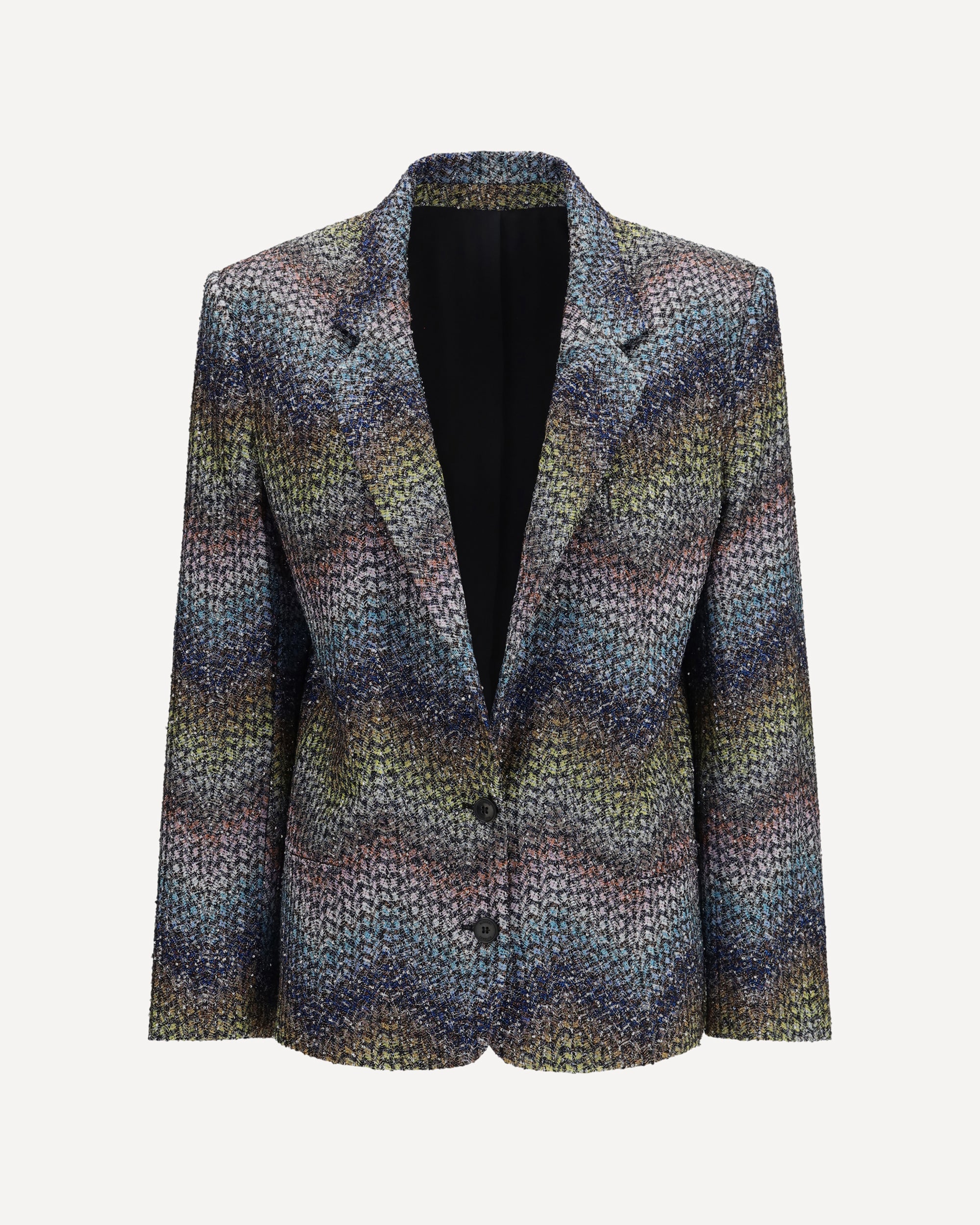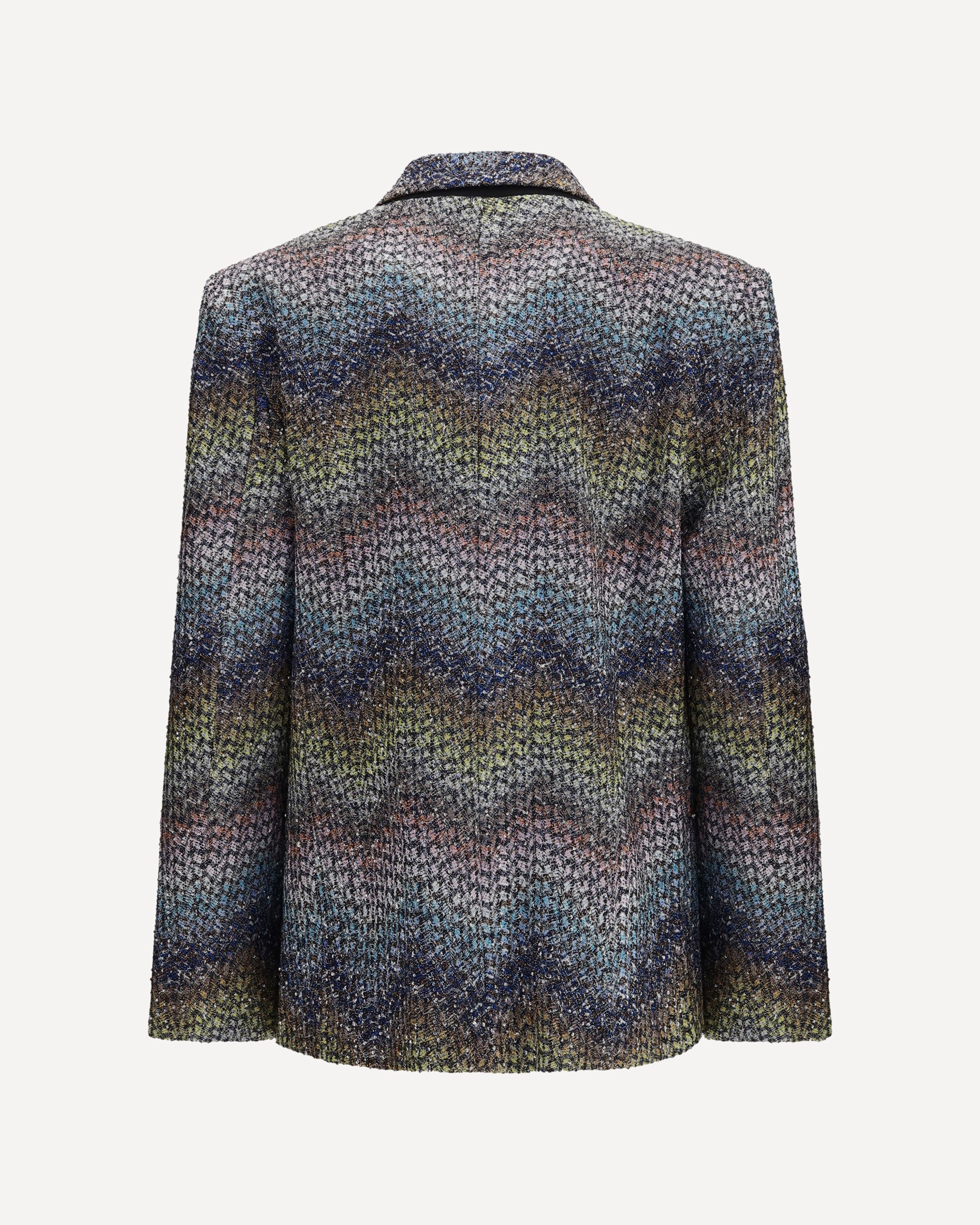 The single-breasted lamé viscose Blazer with sequins by Missoni is an elegant and statement Blazer, featuring an oversized fit and tailored construction. The design is crafted using the Caperdoni loom technique and showcases the iconic zigzag pattern of the brand. The viscose and lamé blend is enhanced with applied sequins that add brightness and movement. Perfect for sophisticated and impactful looks.