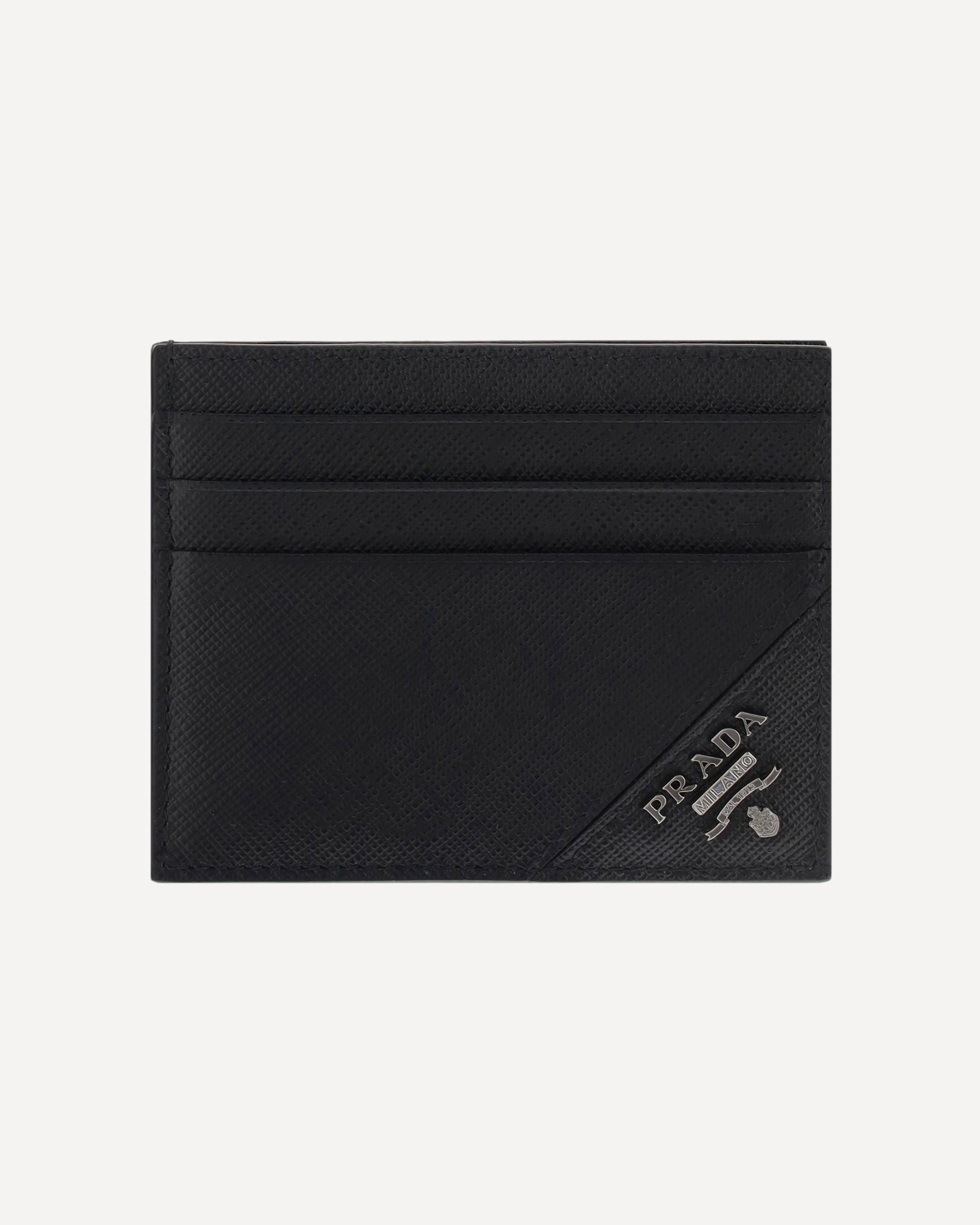 Prada's leather credit Card Holder is a compact and elegant accessory with six card slots distributed on the front and back. It is embellished with a blue leather detail with a metal plaque and logo on the front, while the interior features the printed logo, a symbol of authenticity and style.