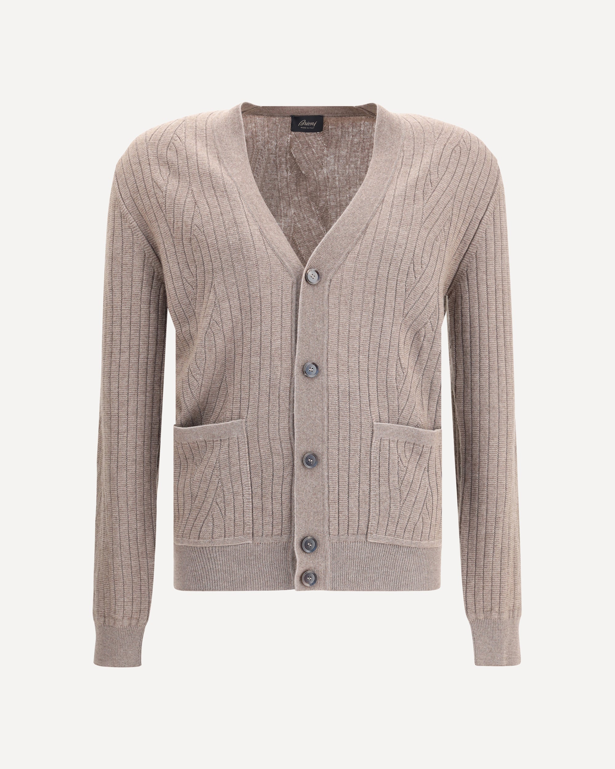 Brioni's wool cardigan is an essential garment with timeless appeal. Featuring a V-neckline and a front button closure, it has two front patch pockets and a refined ribbed design that enhances its texture and quality craftsmanship.