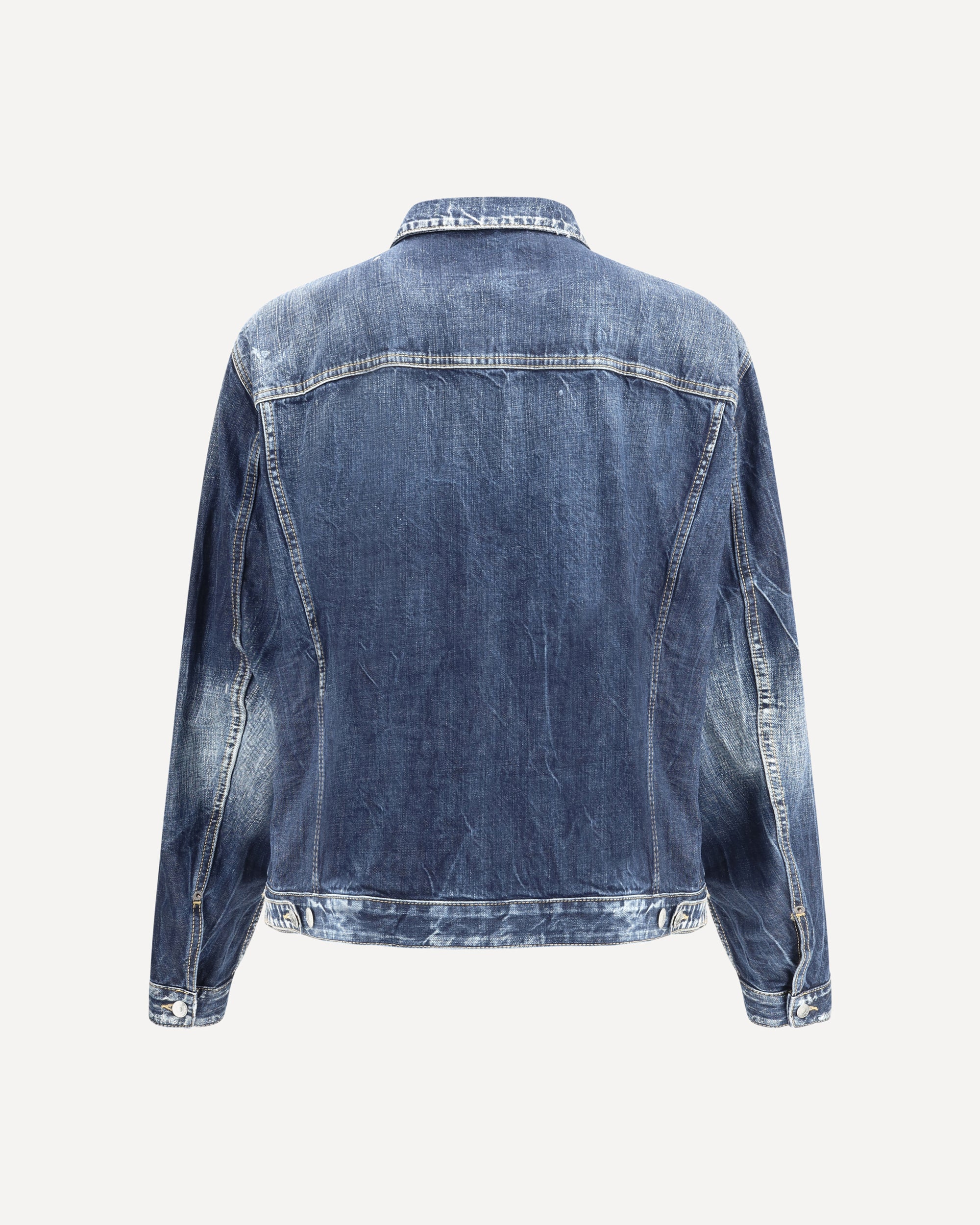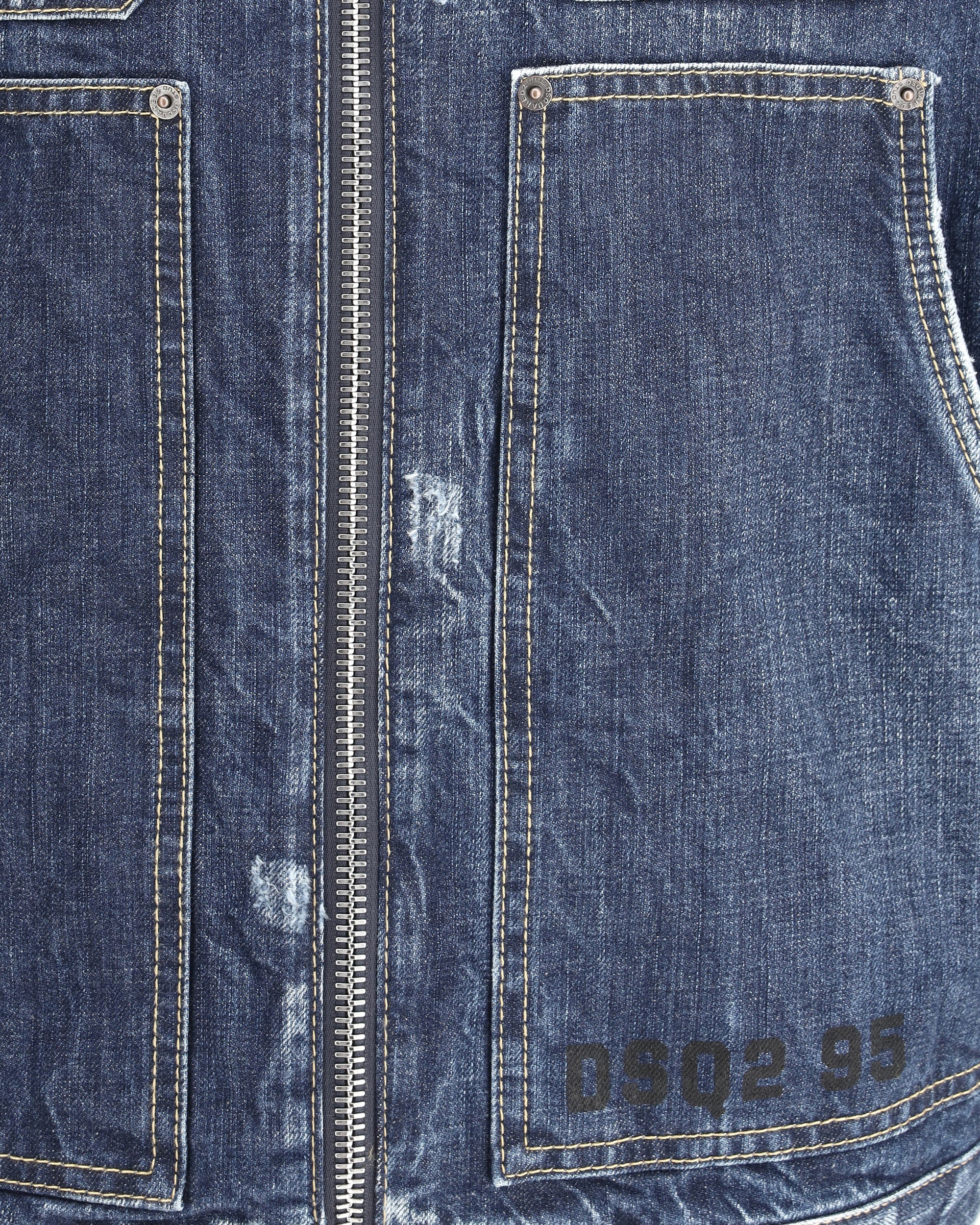 Denim Carpenter Jean jacket from Dsquared2, classic collar, front zipper closure, two maxi patch pockets on front, two patch pockets with flap and buttons on front, worn vintage effect design, brand monogram printed on front.
