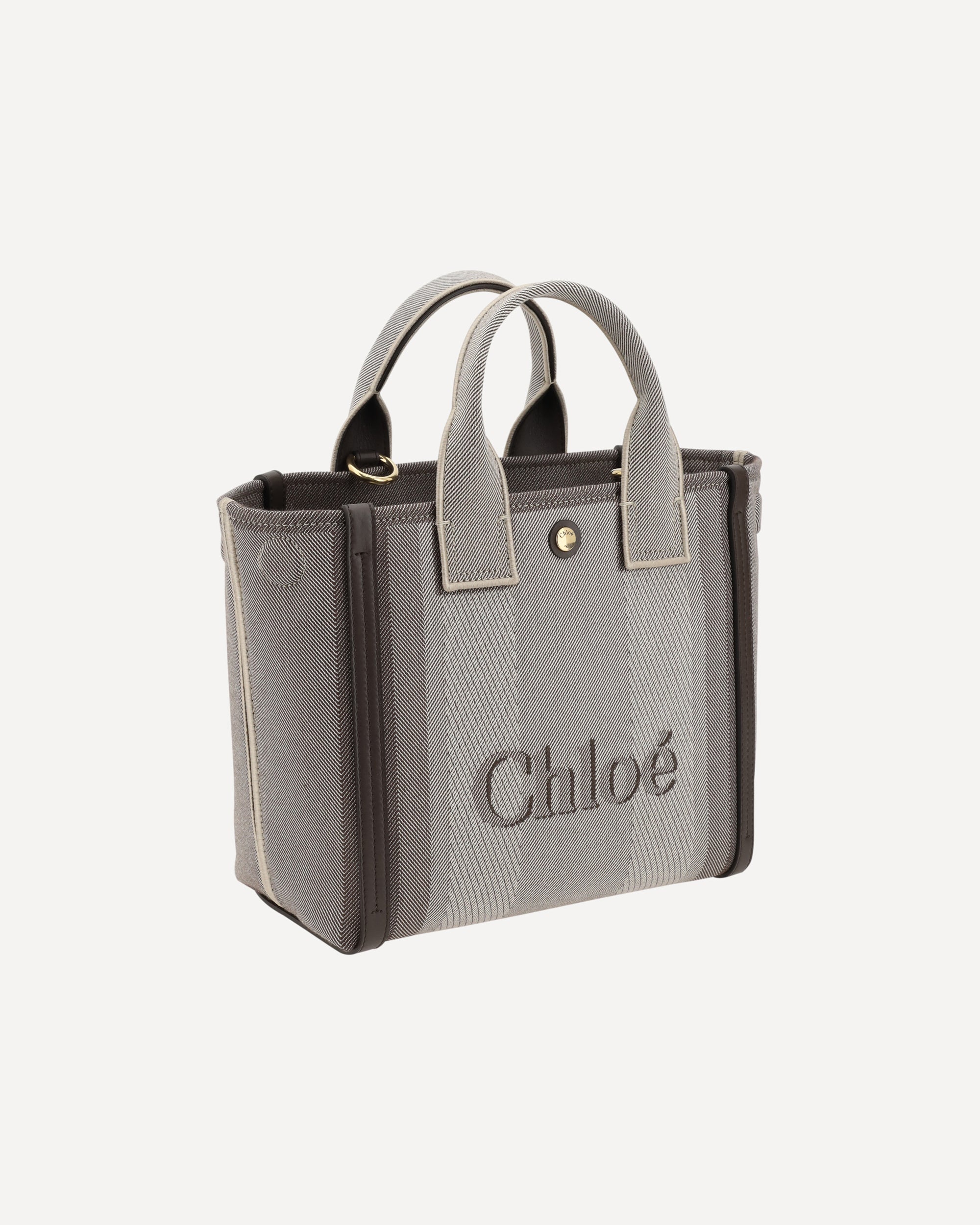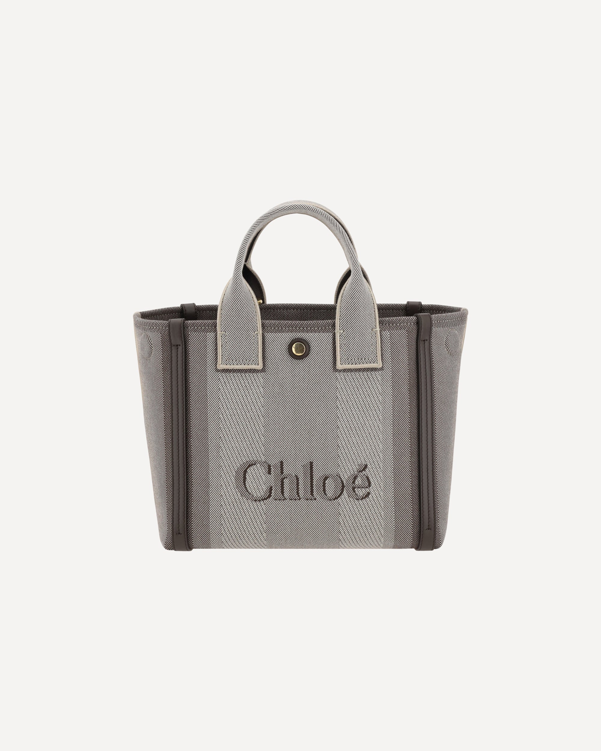 Chloé's Carry Tote Bag is a stylish, multifunctional accessory made of cotton with contrasting leather details that accentuate its sophisticated appeal. Magnetic buttons on the side panels allow you to adjust the width of the bag for added convenience. The snap top closure provides security, while double flat handles and a removable and adjustable leather shoulder strap offer multiple carrying options, perfect for any occasion. The brand's iconic monogram is visible on both the front and back, adding a distinctive touch. Inside, a welt pocket allows you to organize smaller items, while the brand's signature on the side panels enhances the design with an exclusive and refined detail.