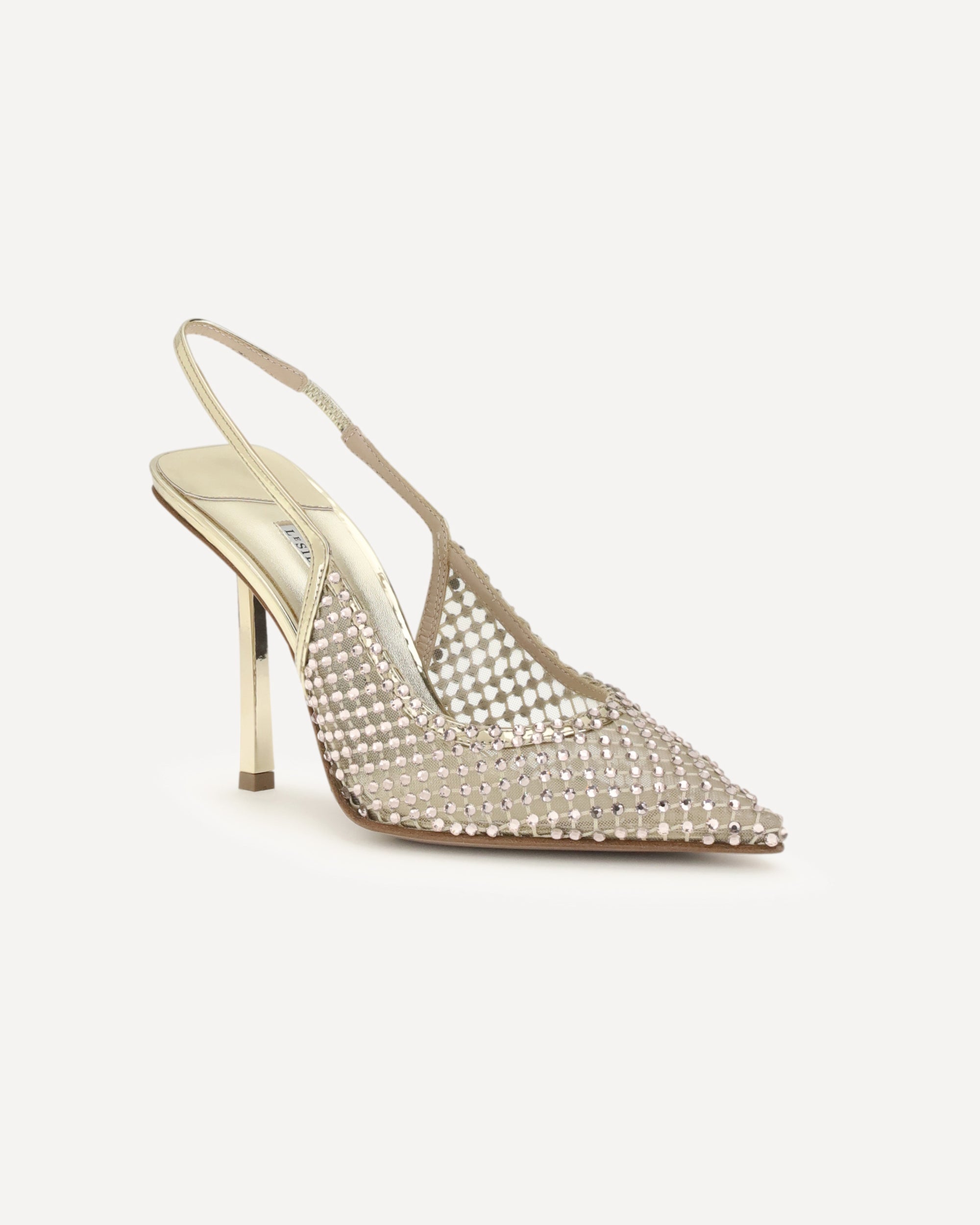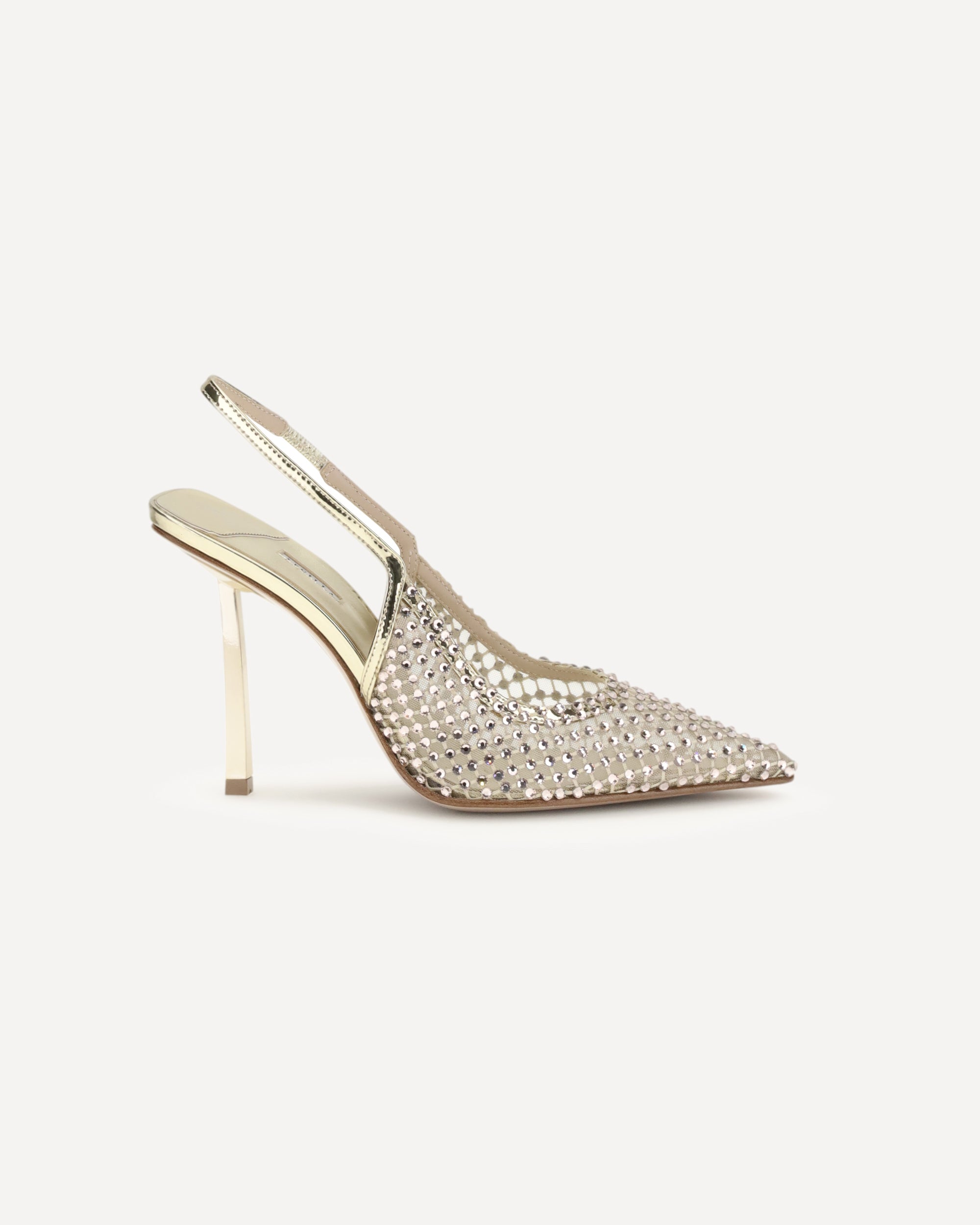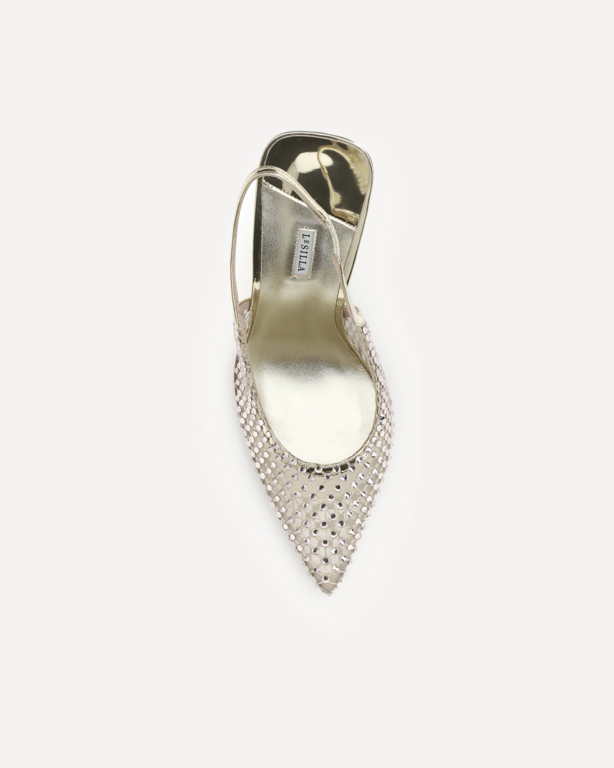 The Gilda Pumps by Le Silla seduce with an upper that alternates shiny satin and stretch mesh, creating a refined play of transparencies that envelops the foot with natural sensuality. Hand-applied crystals catch the light with every movement, giving brilliance and dynamism.The sharp toe and 100mm stiletto heel sculpt a bold and sophisticated silhouette designed to leave an unforgettable impression.