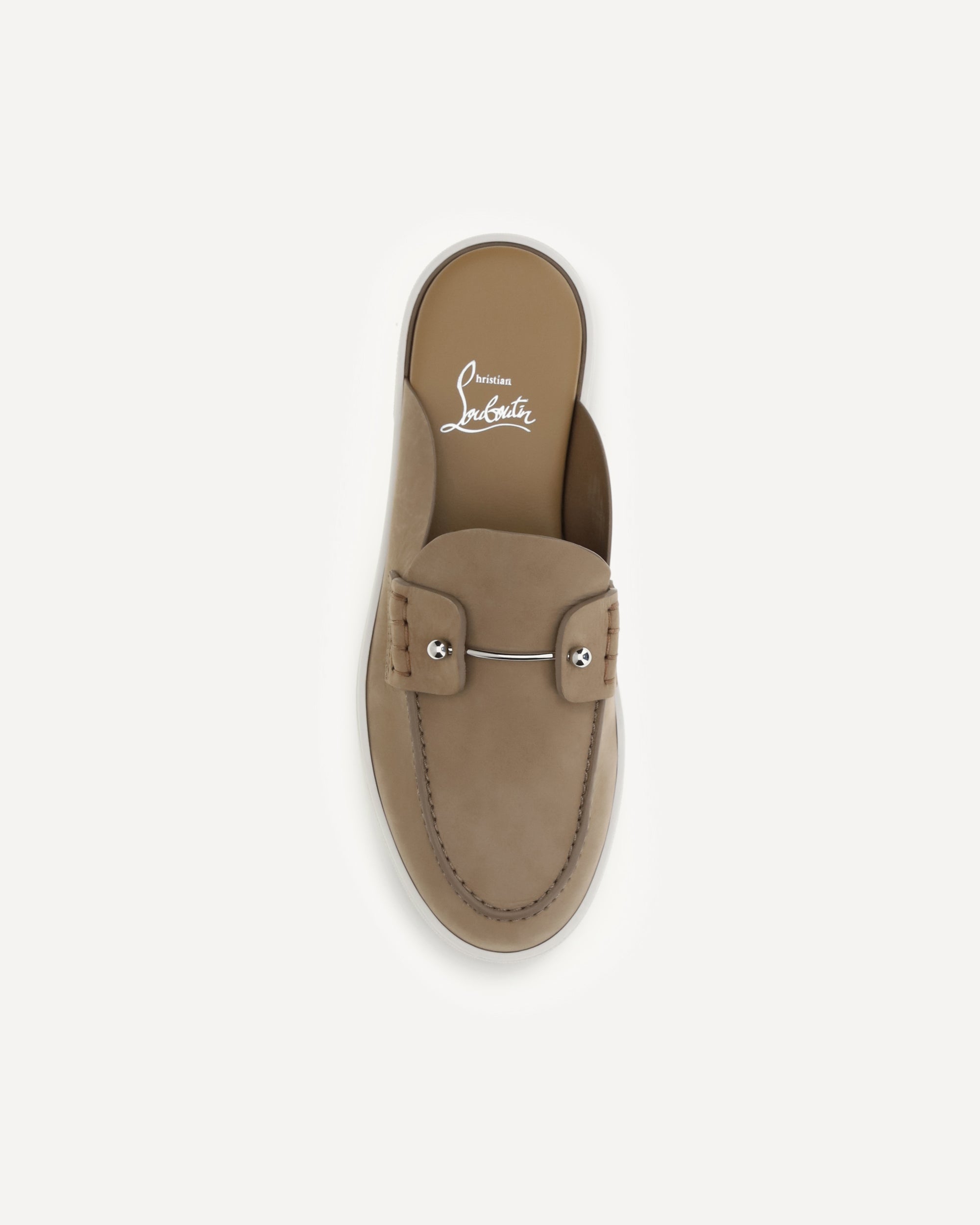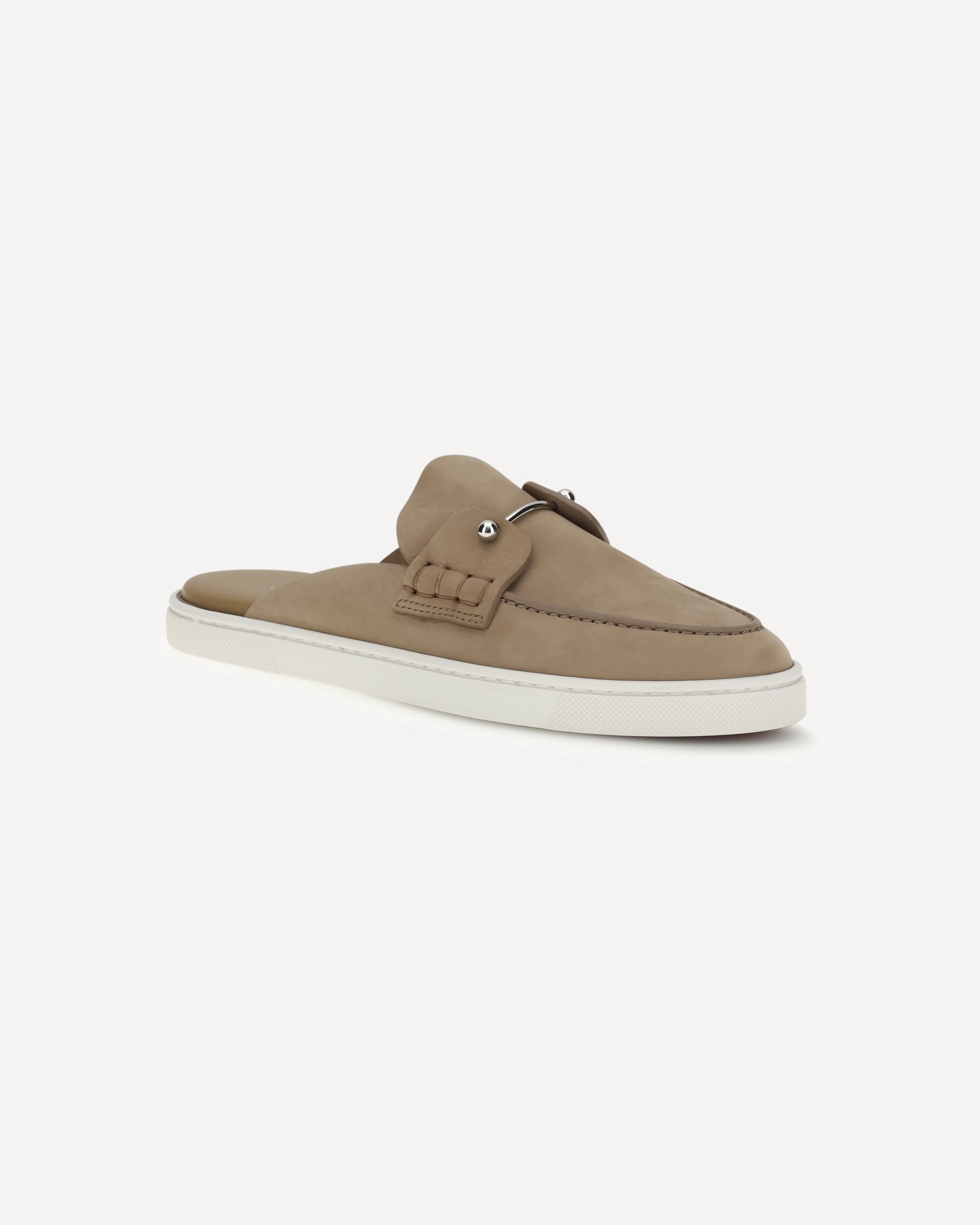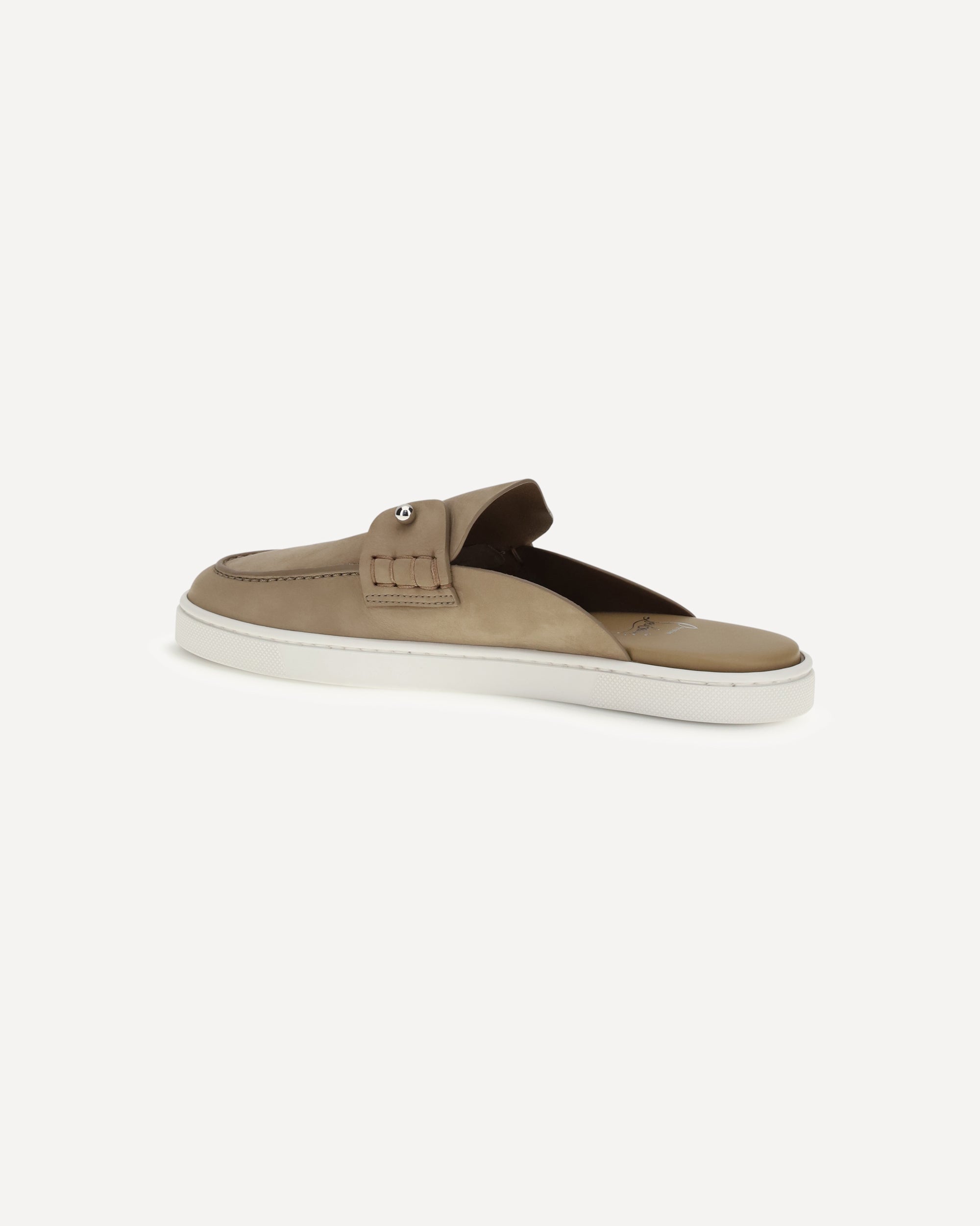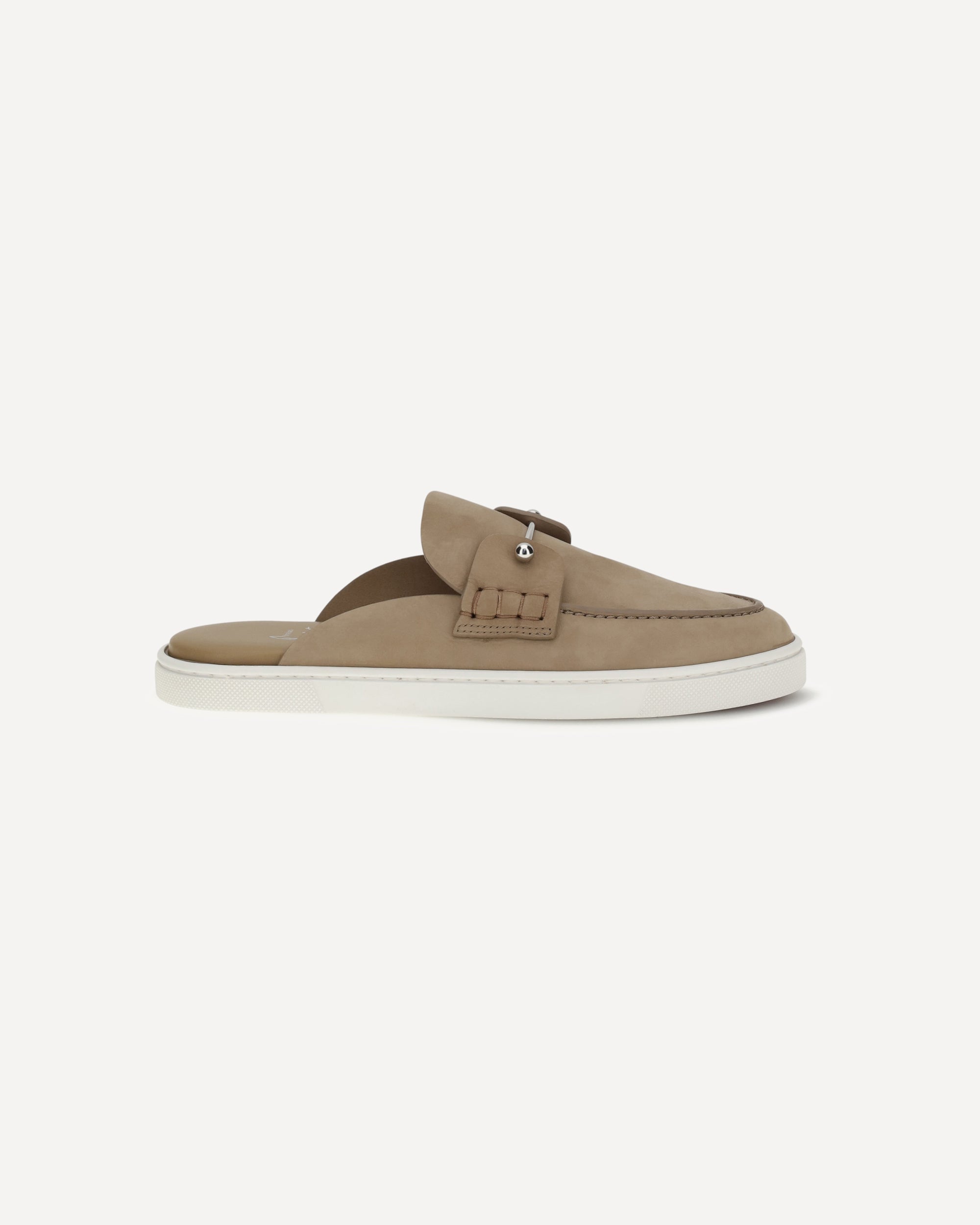 The Chanme Mules Loafers by Christian Louboutin are an elegant open-back style with a soft and refined construction, designed for urban and contemporary elegance. The tongue is embellished with a hand-stitched banner and a metal pin on the collar, details that express the Maison's creative touch. Crafted from beige Lionne reverse calfskin, lightweight and flexible, they are finished with a white rubber sole for comfort and everyday practicality.