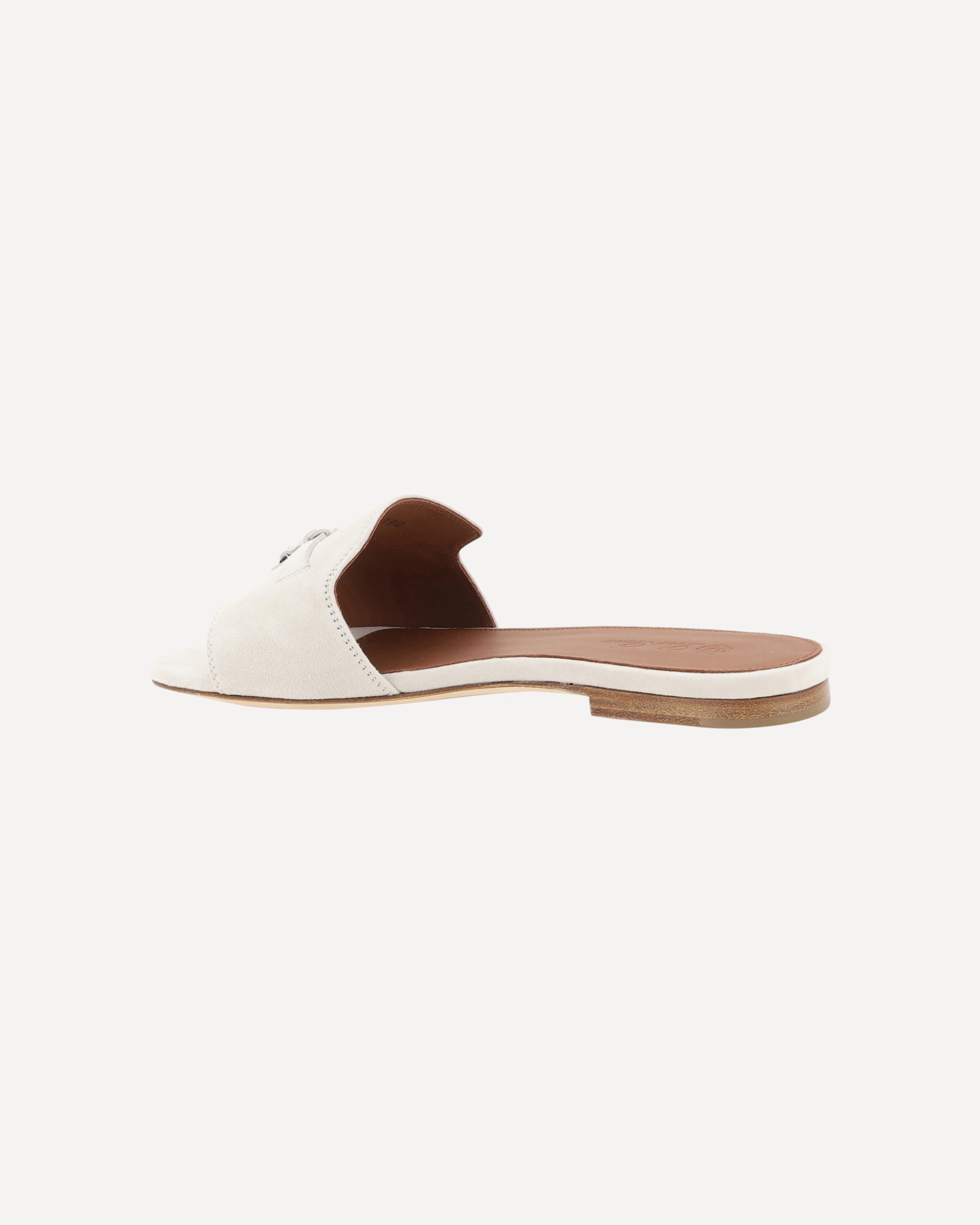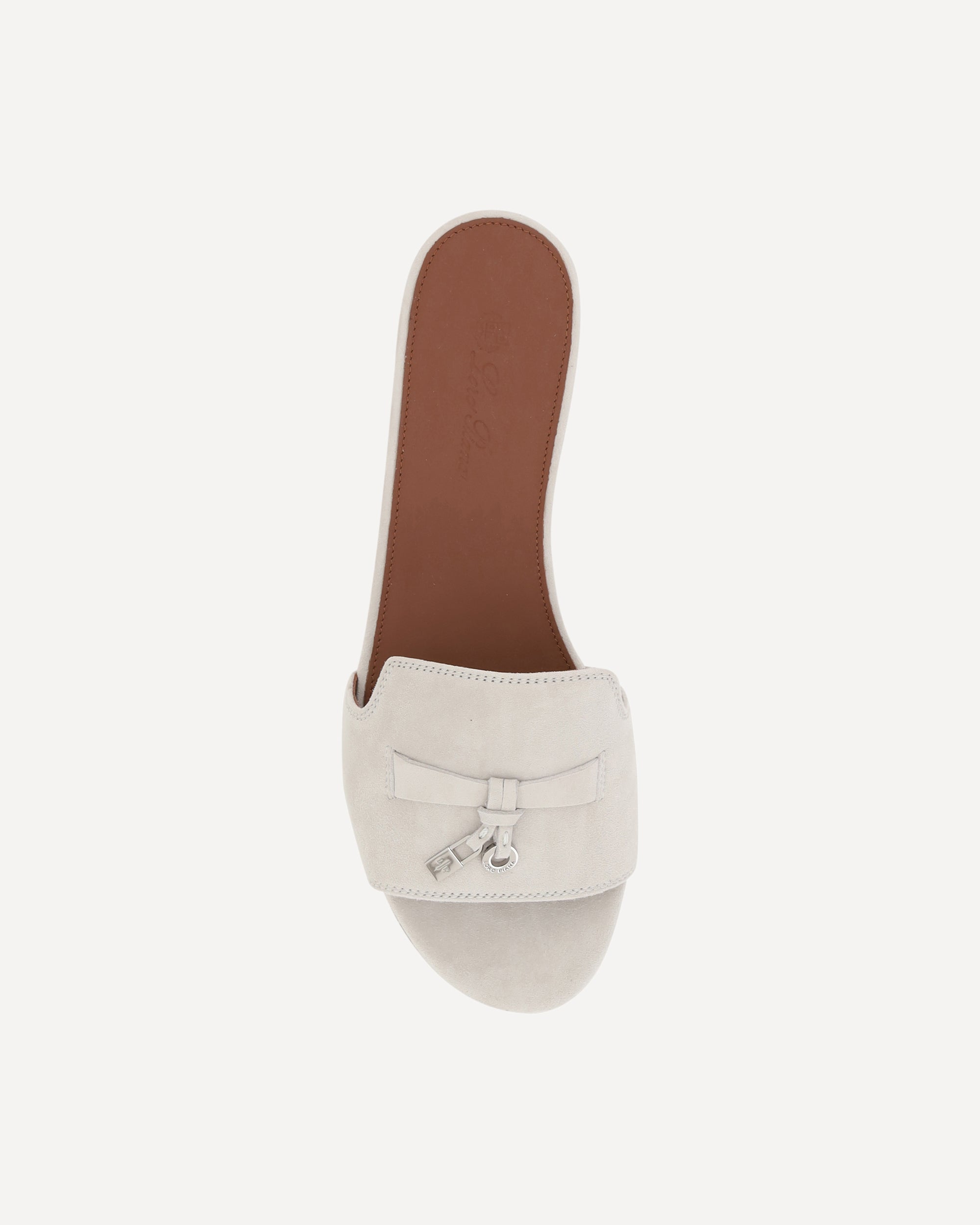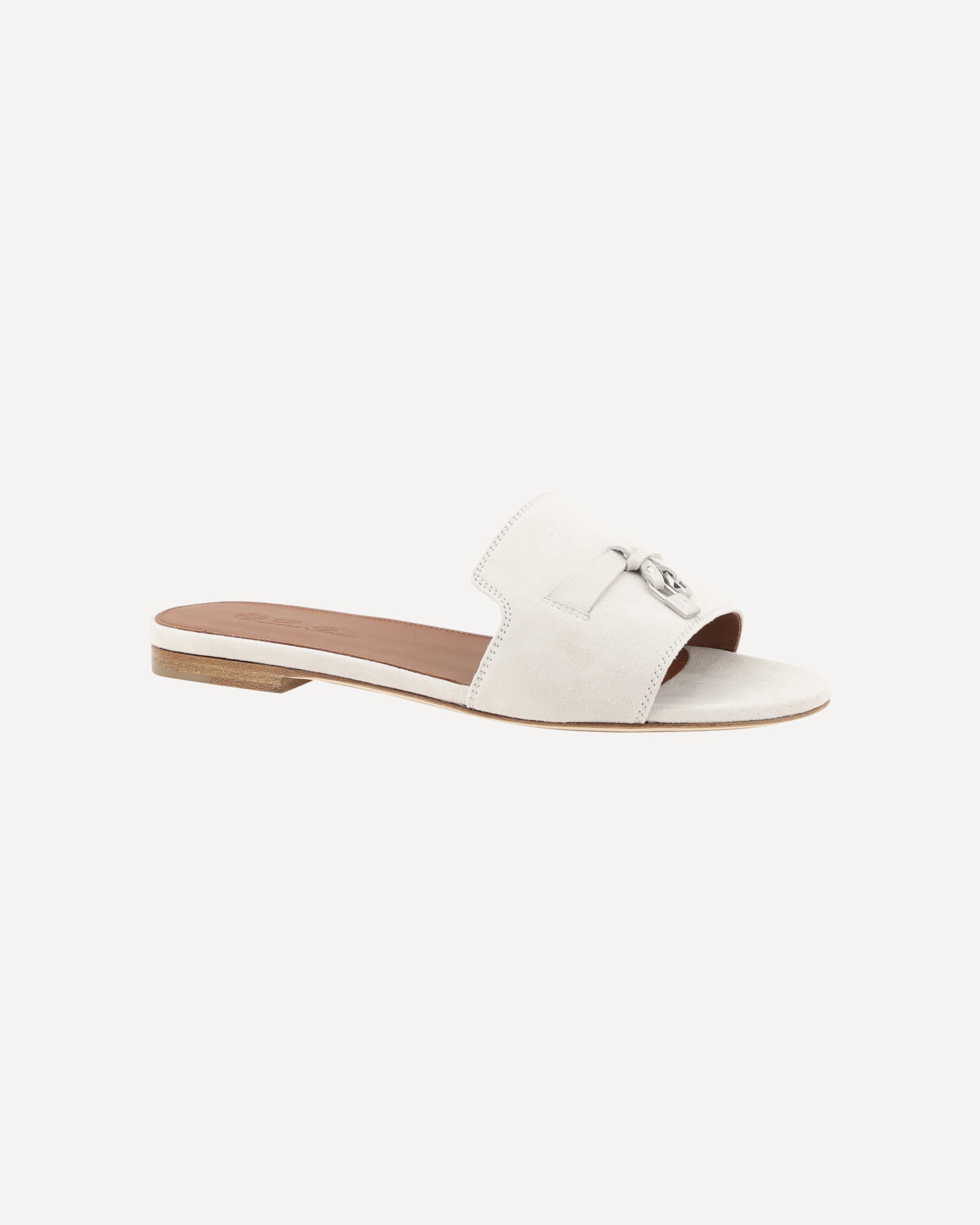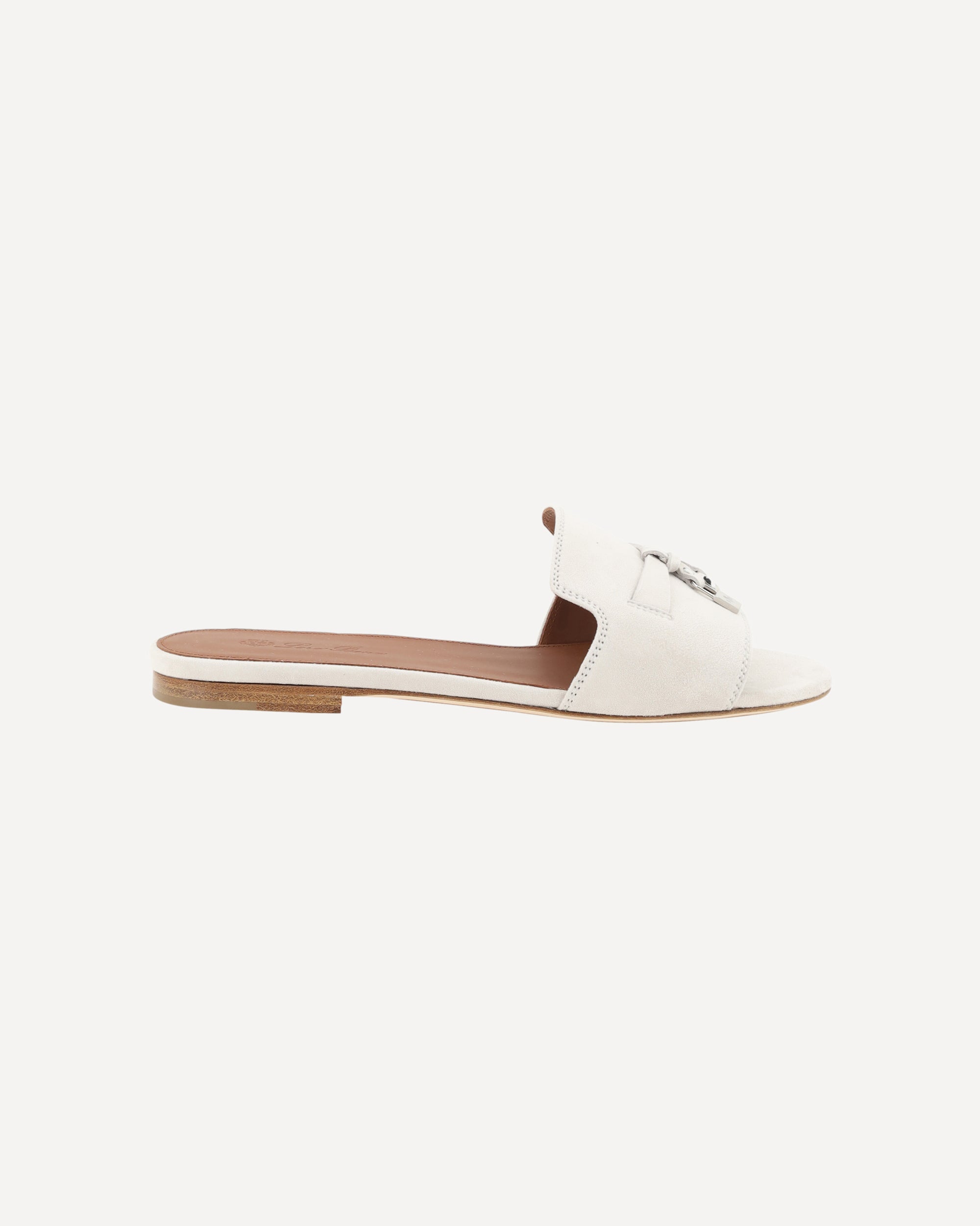 The leather Charms Sandals by Loro Piana are an elegant and refined accessory, ideal for a sophisticated summer look. The flat sole ensures comfort, while the slightly elongated toe adds a touch of understated elegance. The suede front band is embellished with an appliqué detail featuring the brand's engraved monogram, giving it a distinctive and recognizable touch. The branded insole completes the design with an additional luxury detail.