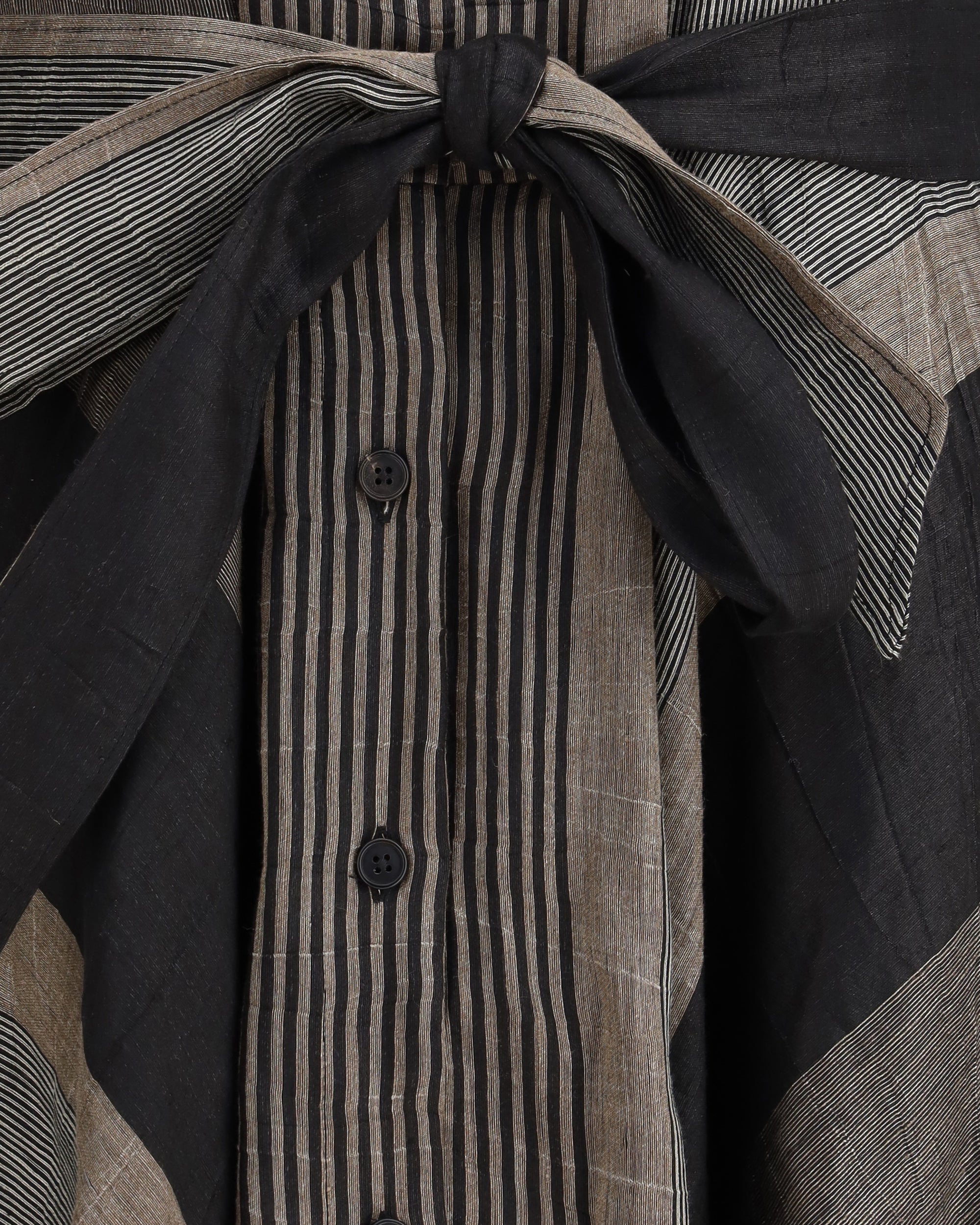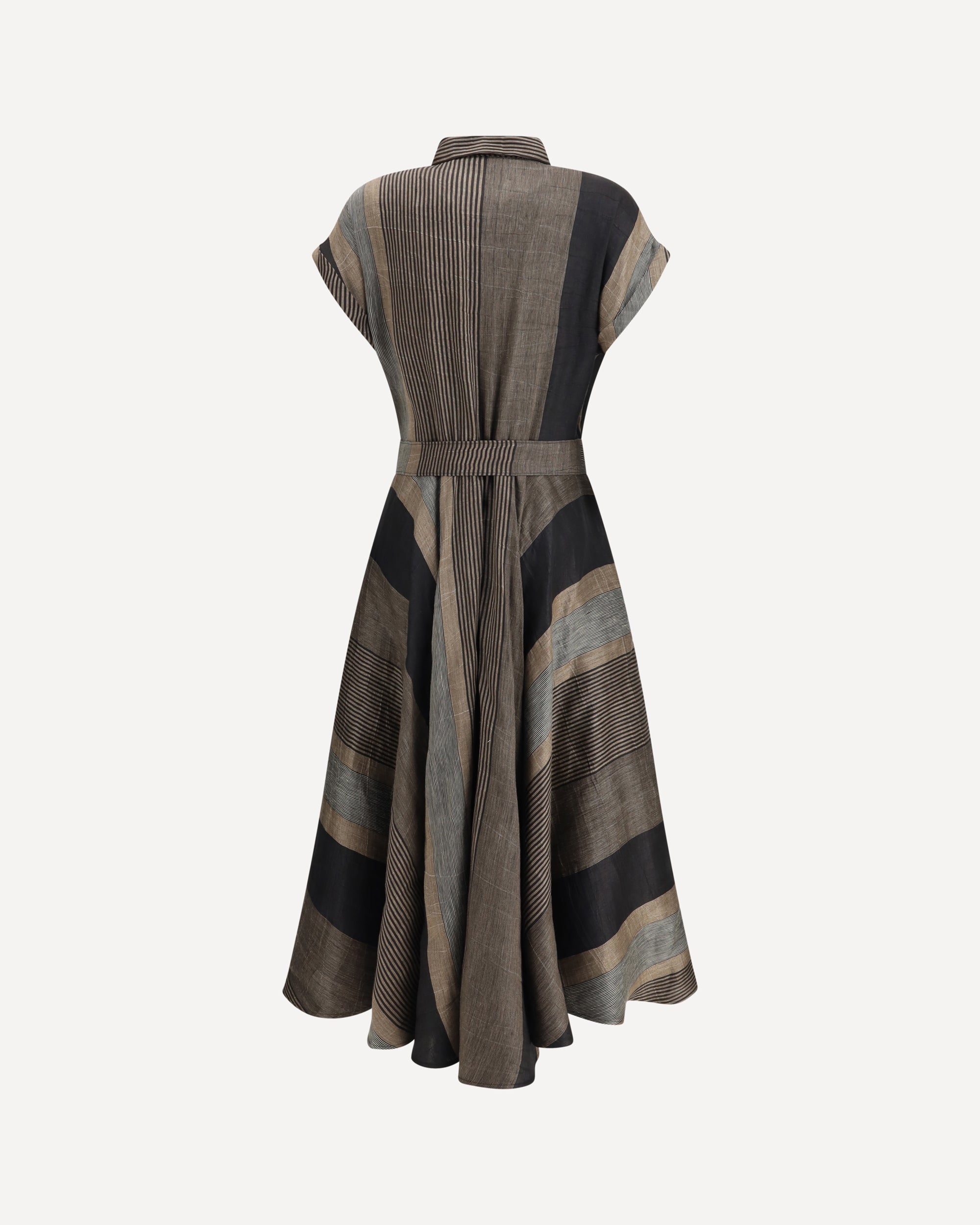 Sara Roka's Chemisier Dress captivates with its striped patchwork pattern and fresh, feminine design. Featuring short sleeves, a classic collar and front button closure, it is complemented by a matching removable knotted belt that enhances the silhouette with elegance and versatility.