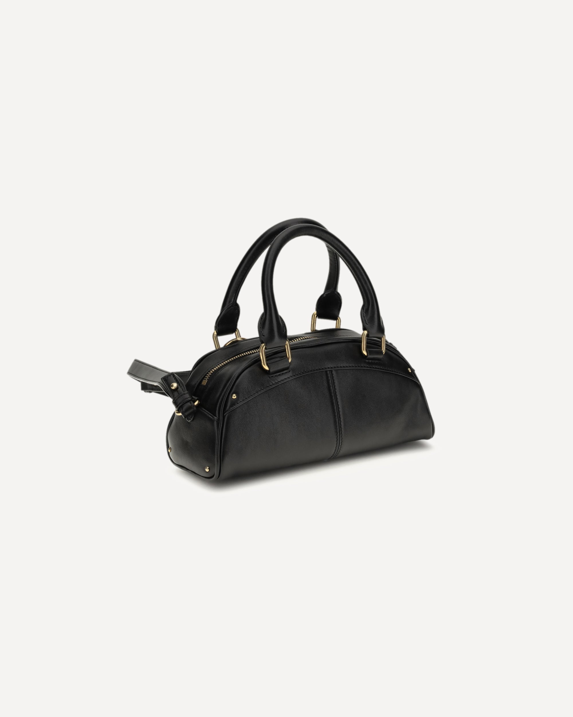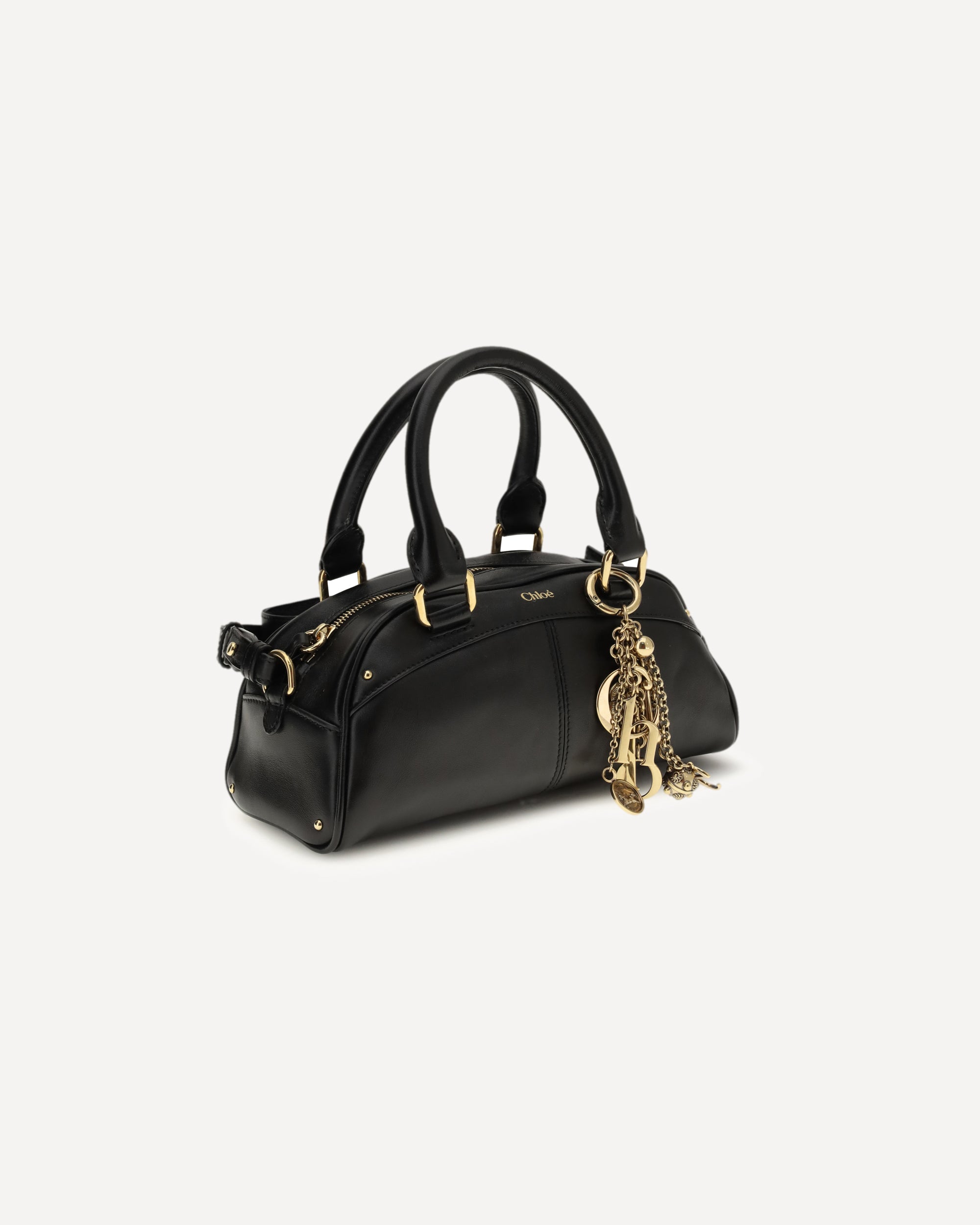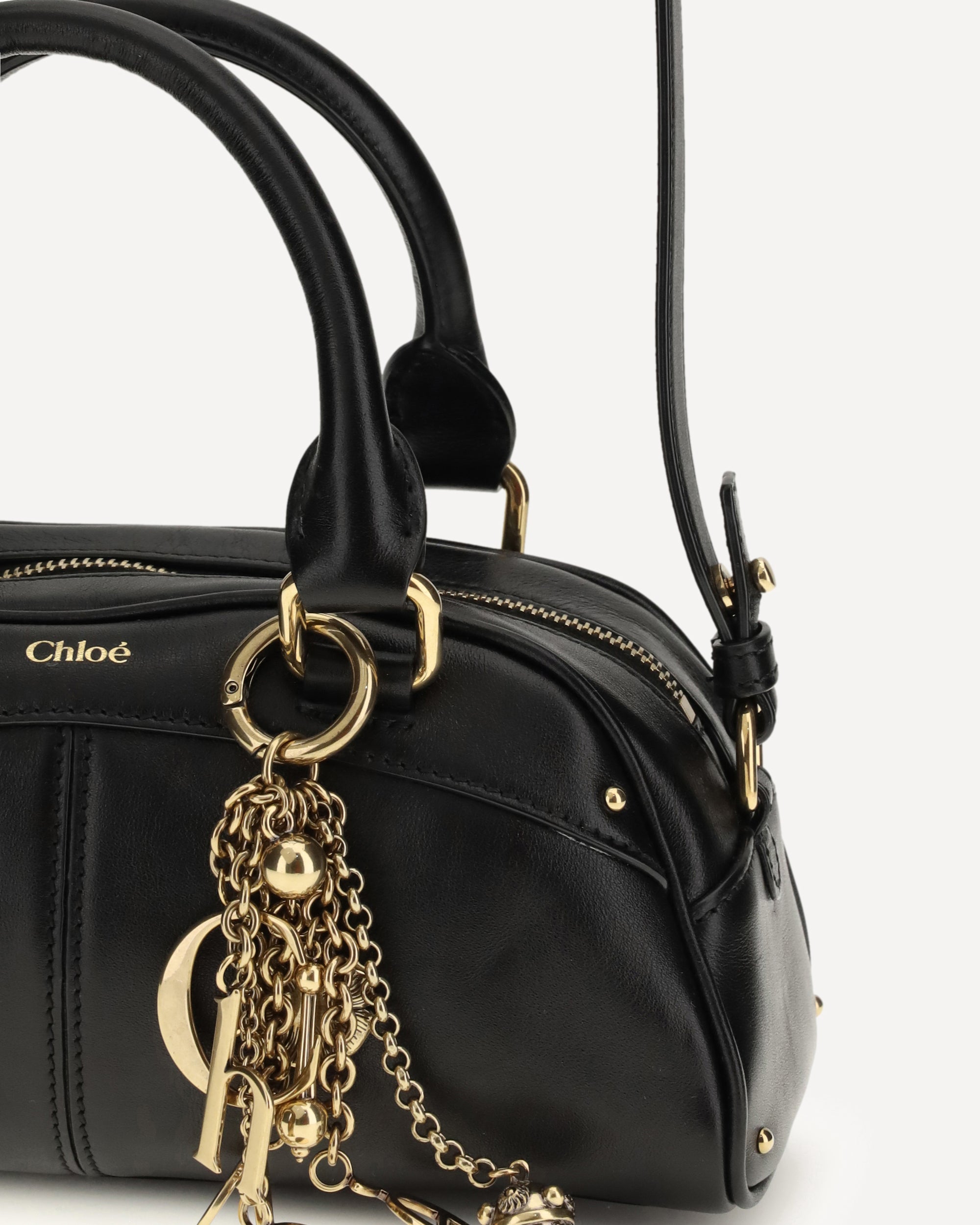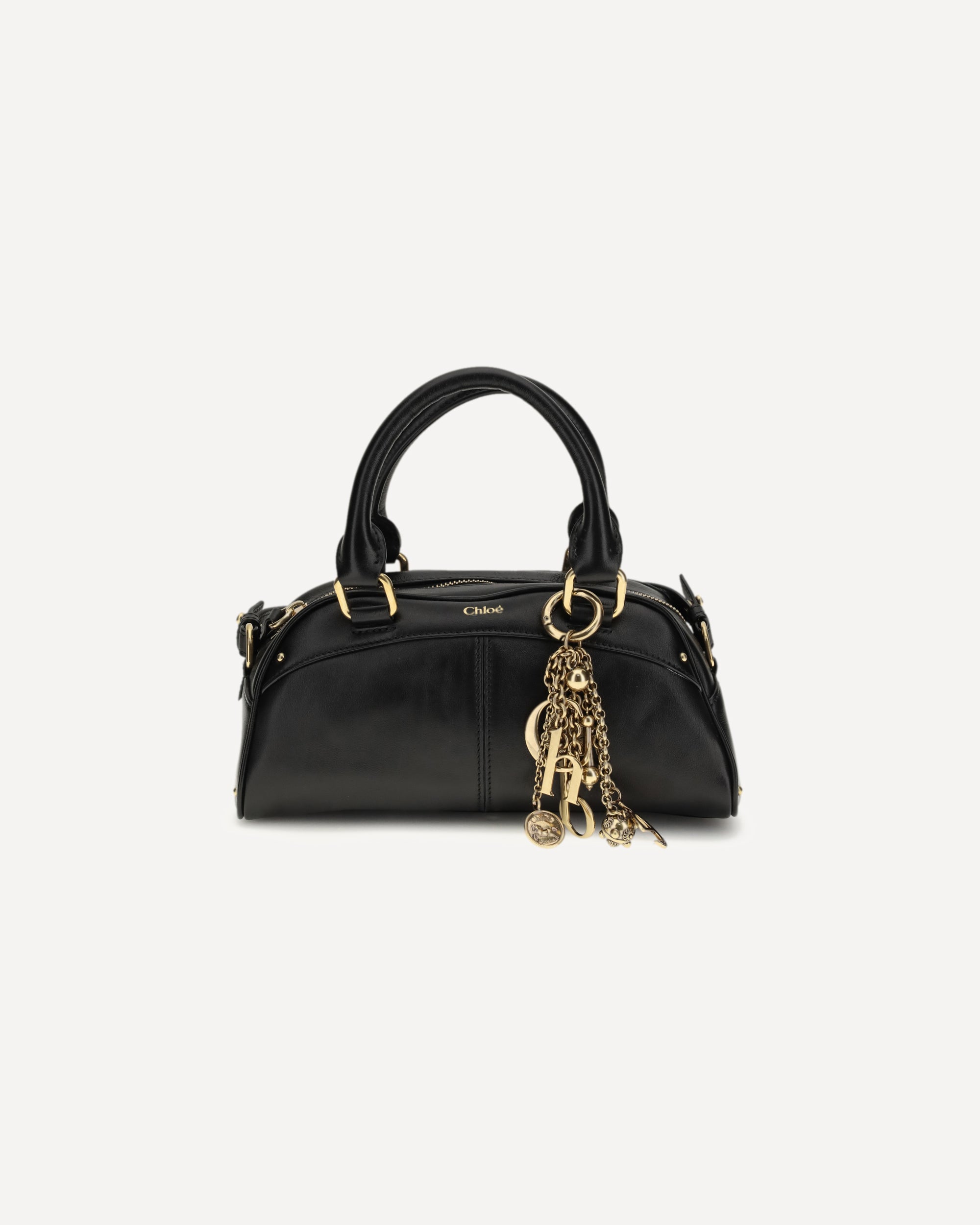 The small Bowling Handbag by Chloé is crafted from soft calfskin and combines a structured, rounded silhouette with sturdy top handles. The removable gold-colored keychain, with pendants and Chloé letters, pays homage to the Maison's tradition. It can be carried by hand or over the shoulder thanks to the adjustable leather shoulder strap.