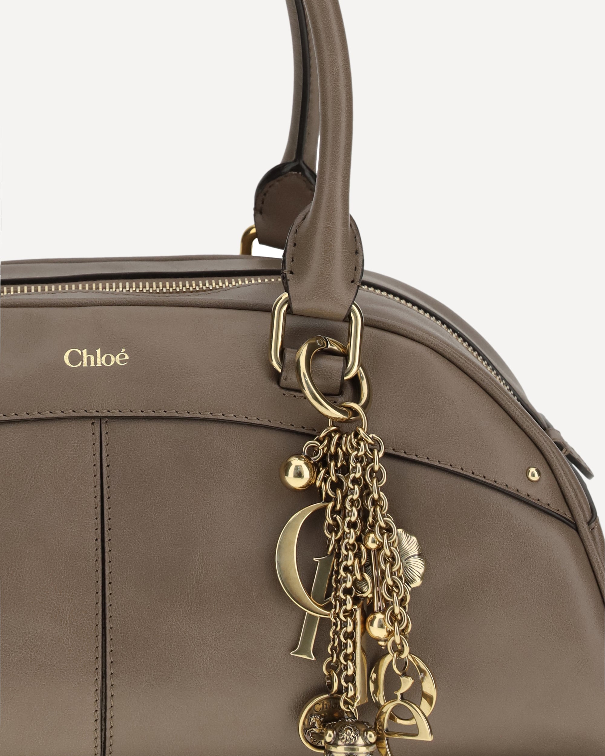 The Bowling Handbag by Chloé, crafted from smooth calfskin leather, features a structured, rounded silhouette with sturdy top handles. The interior includes a large main compartment and flat pocket, while the zipper closure provides convenience and security. The removable golden key ring, embellished with dangling charms and the letters Chloé, adds a distinctive touch and celebrates the elegance of the Maison's heritage.