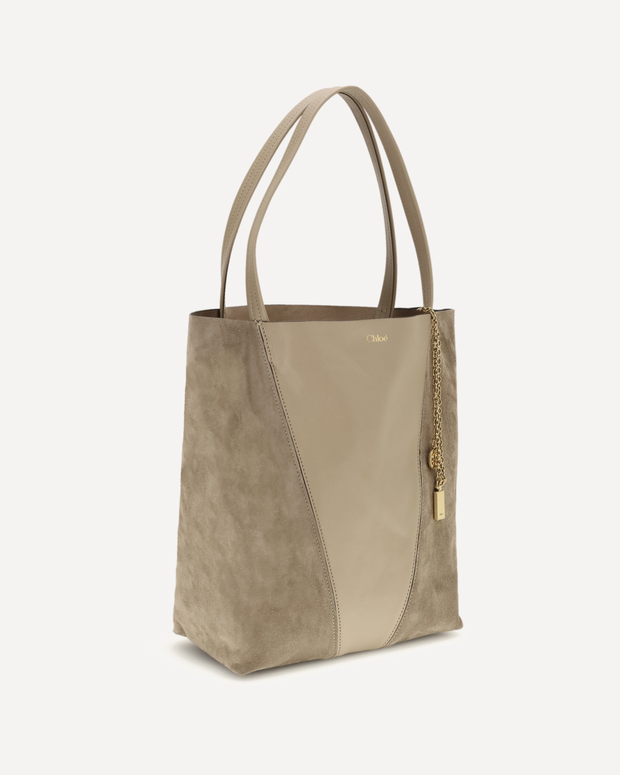 The Spin Shoulder Bag by Chloè captures the effortless elegance of the French Maison. Crafted from a refined combination of grained leather and suede, it features a subtle laminated logo on the front. Two flat leather handles enhance its everyday functionality, while a removable chain with charms lends a jewelry-inspired accent. Lightweight and unlined, it is the perfect companion for a day-to-evening look with timeless appeal.
