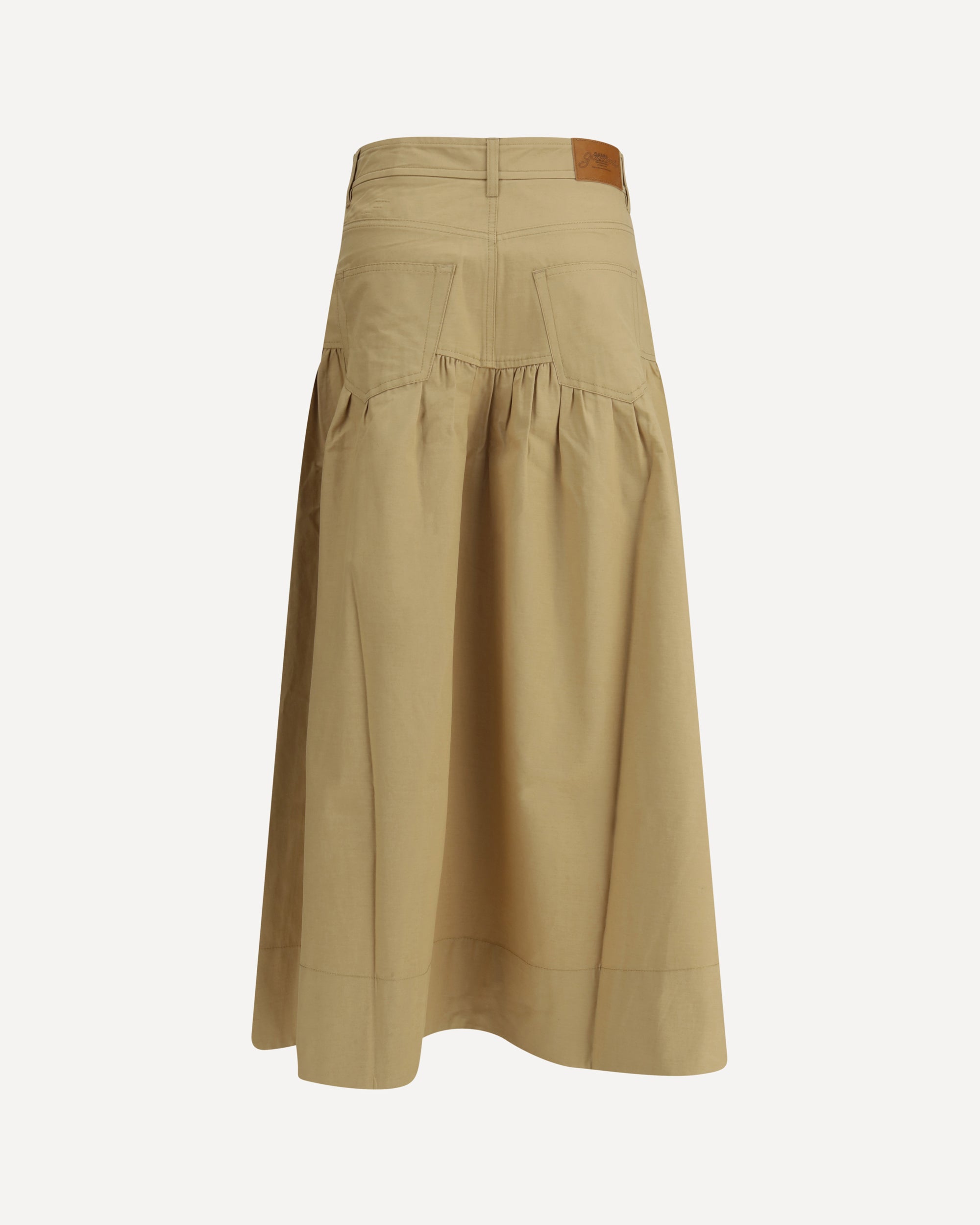 Cotton Skirt by Ganni features a design inspired by the classic five-pocket style. It features a front zipper and button closure, belt loops at the waist and a wide silhouette that gives movement and comfort. A versatile and contemporary piece, perfect for completing casual looks with a feminine and casual touch.