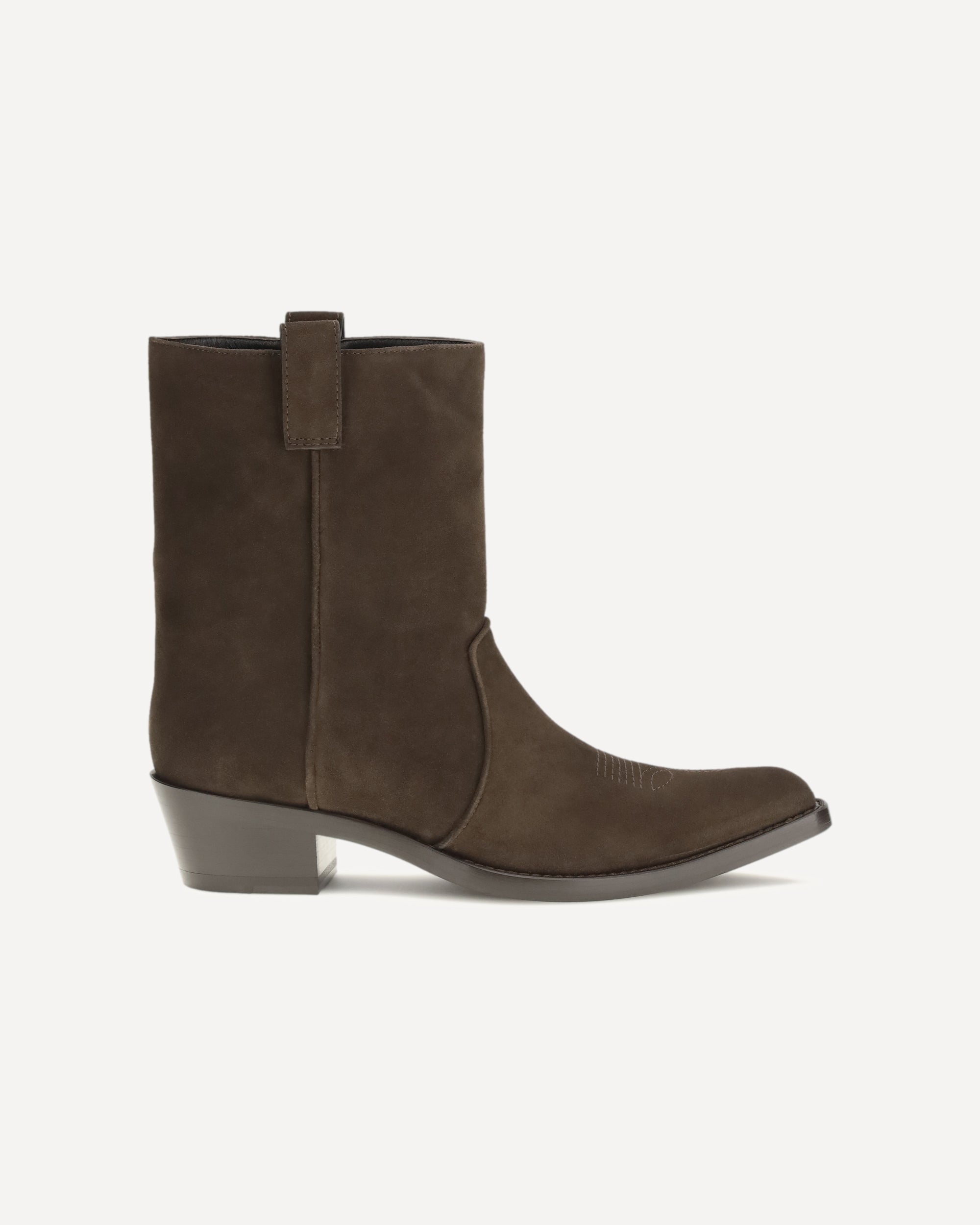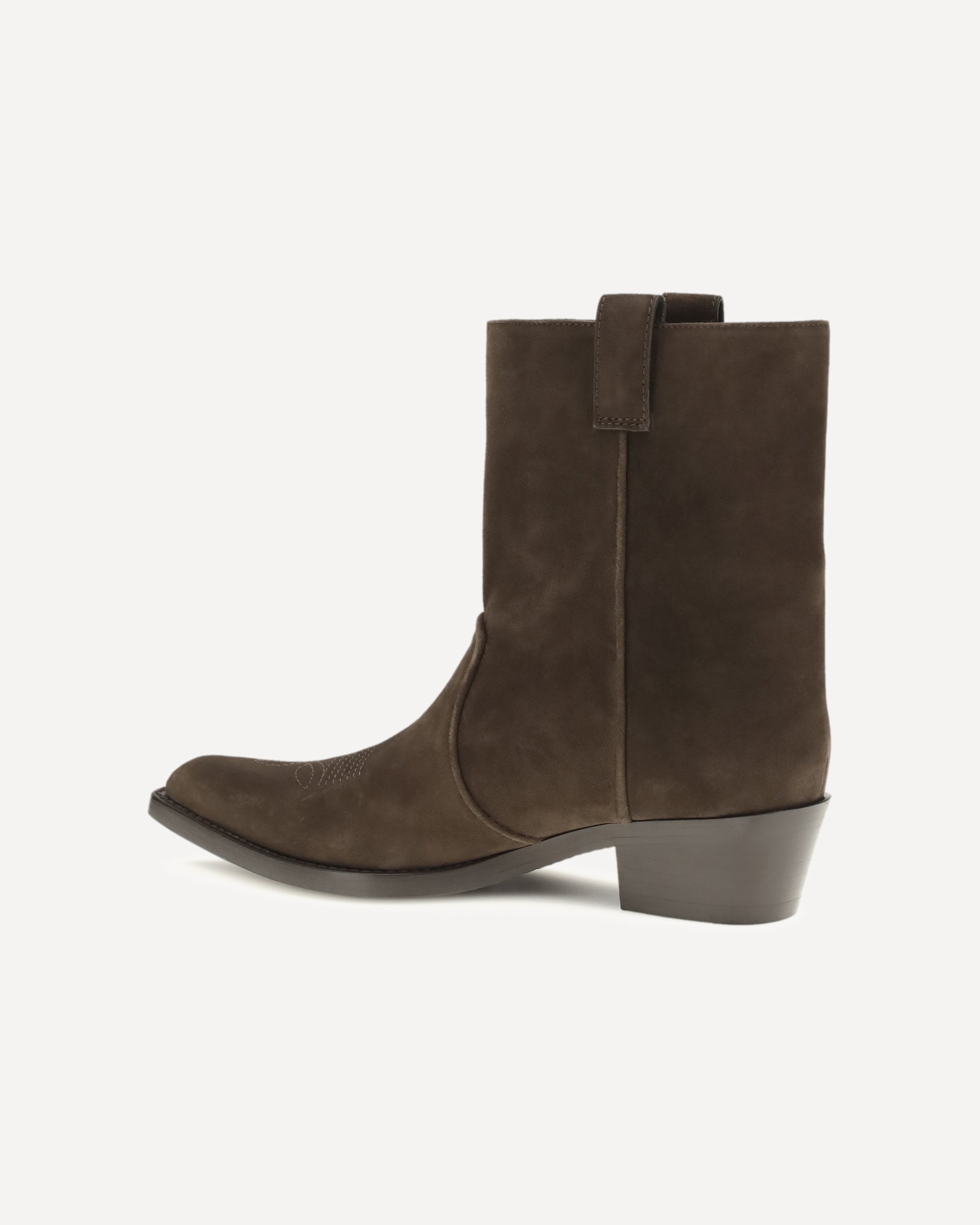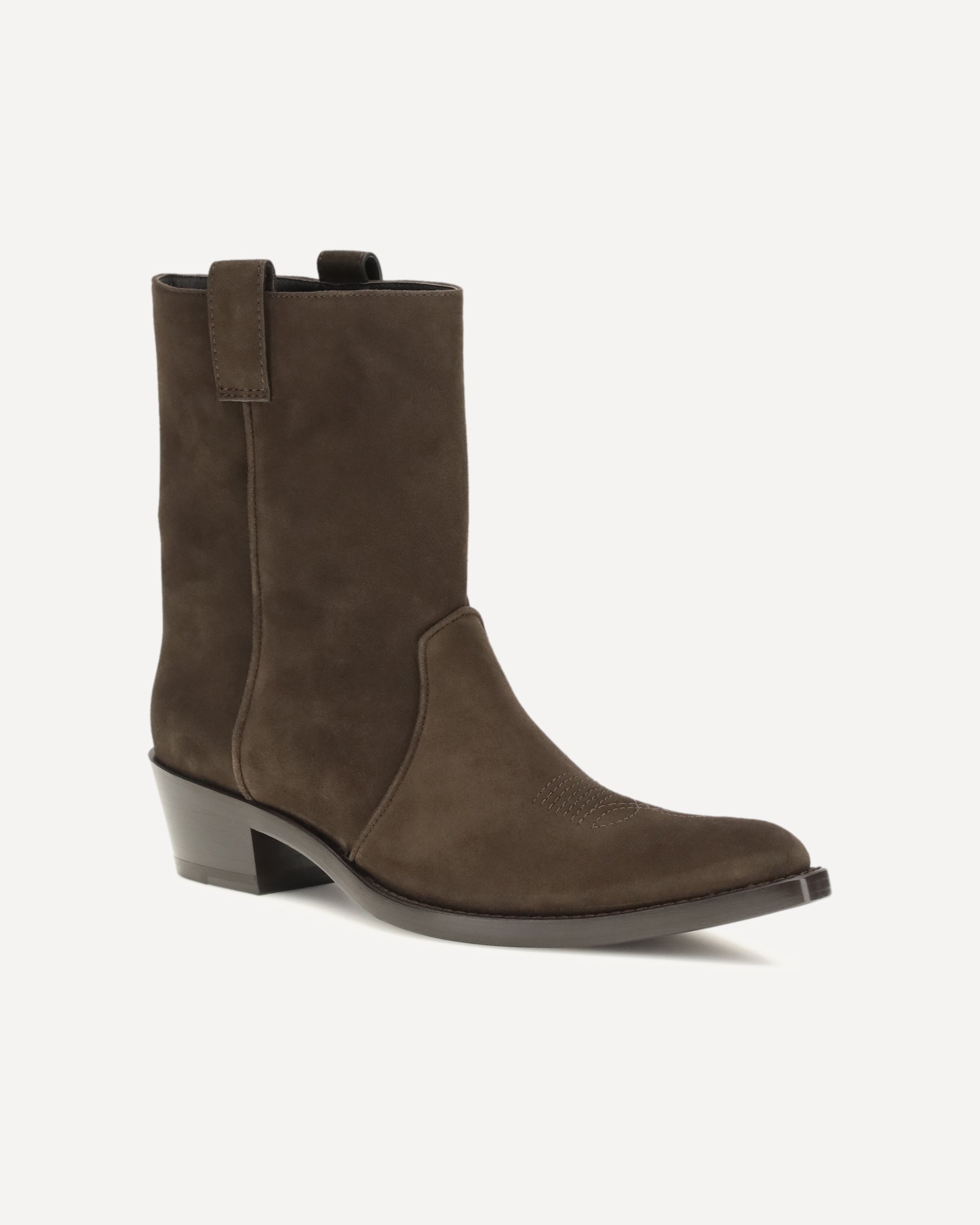 The Clive Ankle Boots by Khaite are a perfect blend of rustic elegance and modern design. With an ankle silhouette and a blunt toe, these boots are inspired by classic worn-in western boots but are designed for everyday wear. The deliberately slanted upper in soft suede adds a distinctive touch, while the stitched welt and layered heel in patinated leather add a refined, artisanal detail. A sophisticated take on the western look, ideal for a wide variety of outfits.