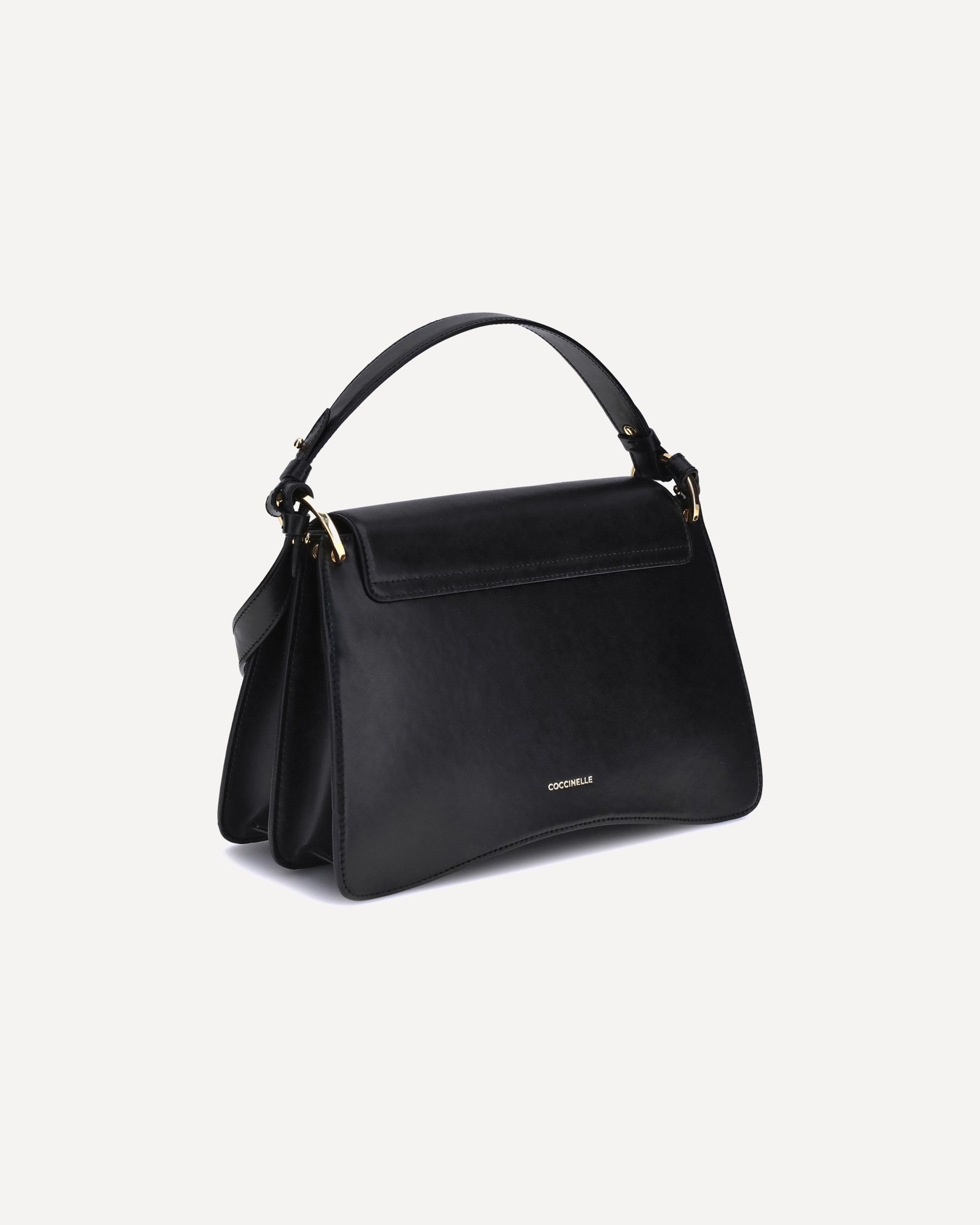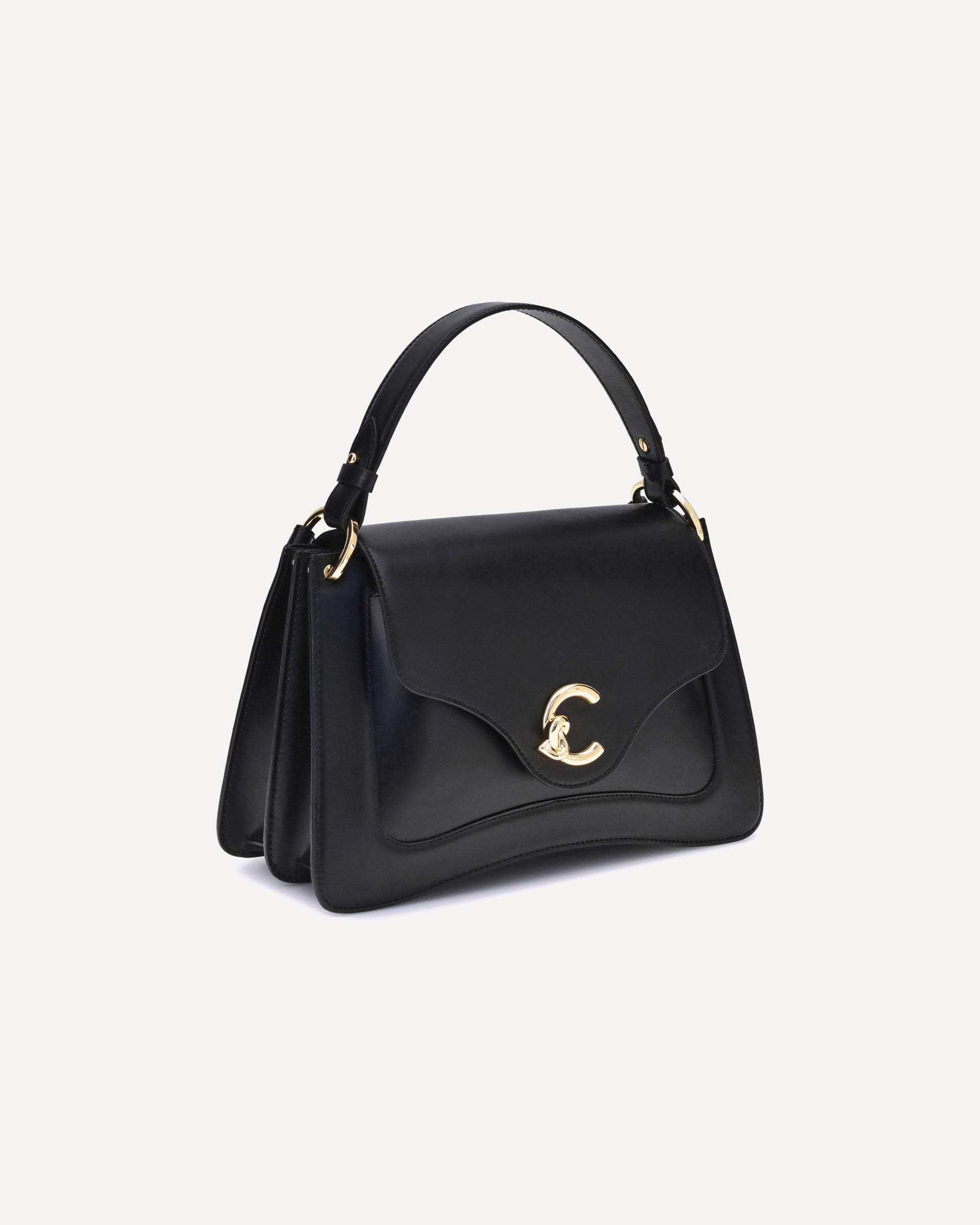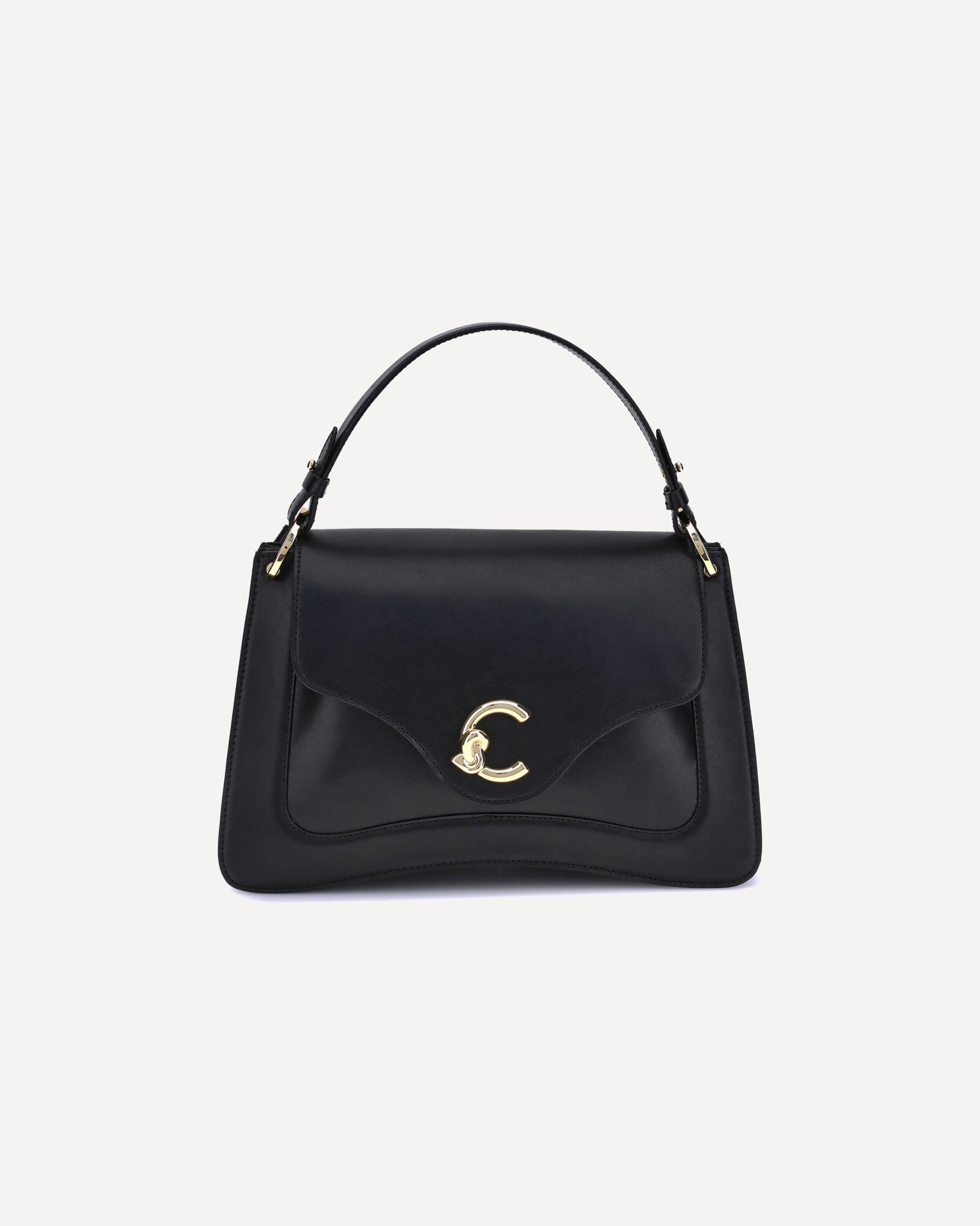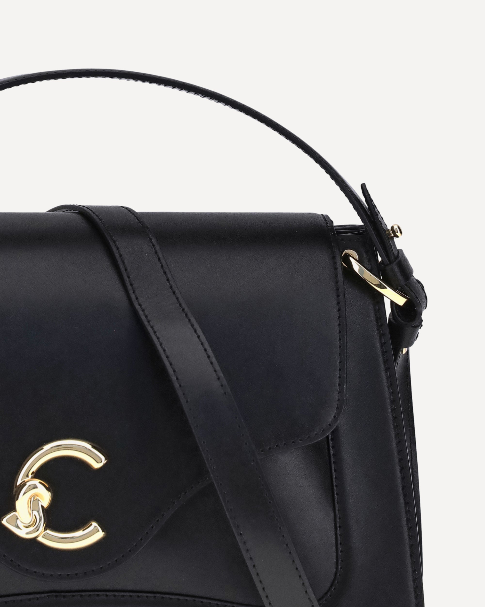 The medium C-Me Handbag by Coccinelle, made of smooth leather, combines functionality and essential style. Featuring the distinctive C-Me logo in gold metal, it has a magnetic closure and a gusset design that provides structure and capacity. The removable handle allows for versatile portability, while the adjustable leather shoulder strap allows you to wear it on the shoulder or crossbody. Equipped with a front pocket, three internal compartments and a zipped partition, it guarantees excellent organization. The embossed gold logo completes with discreet elegance an accessory designed to accompany you every day in style.