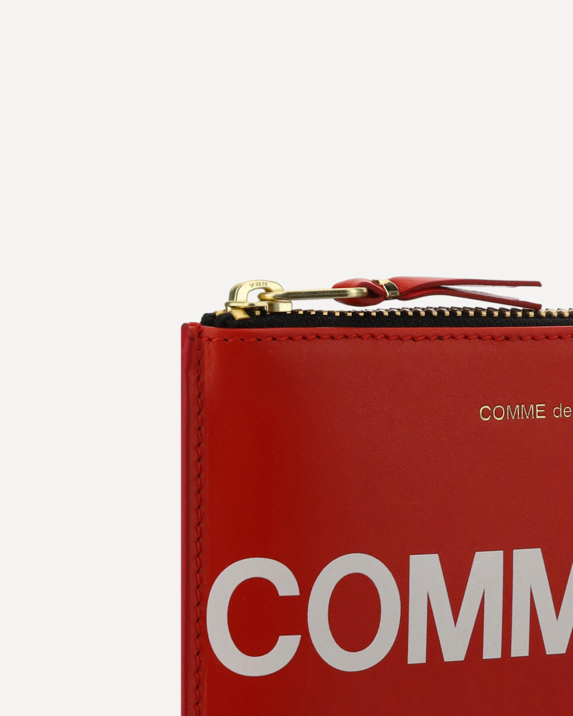 Calfskin Coin Purse by Comme des Garçons, contrasting printed logo on front following on back, engraved gold logo on front, zipper closure with one internal compartment.