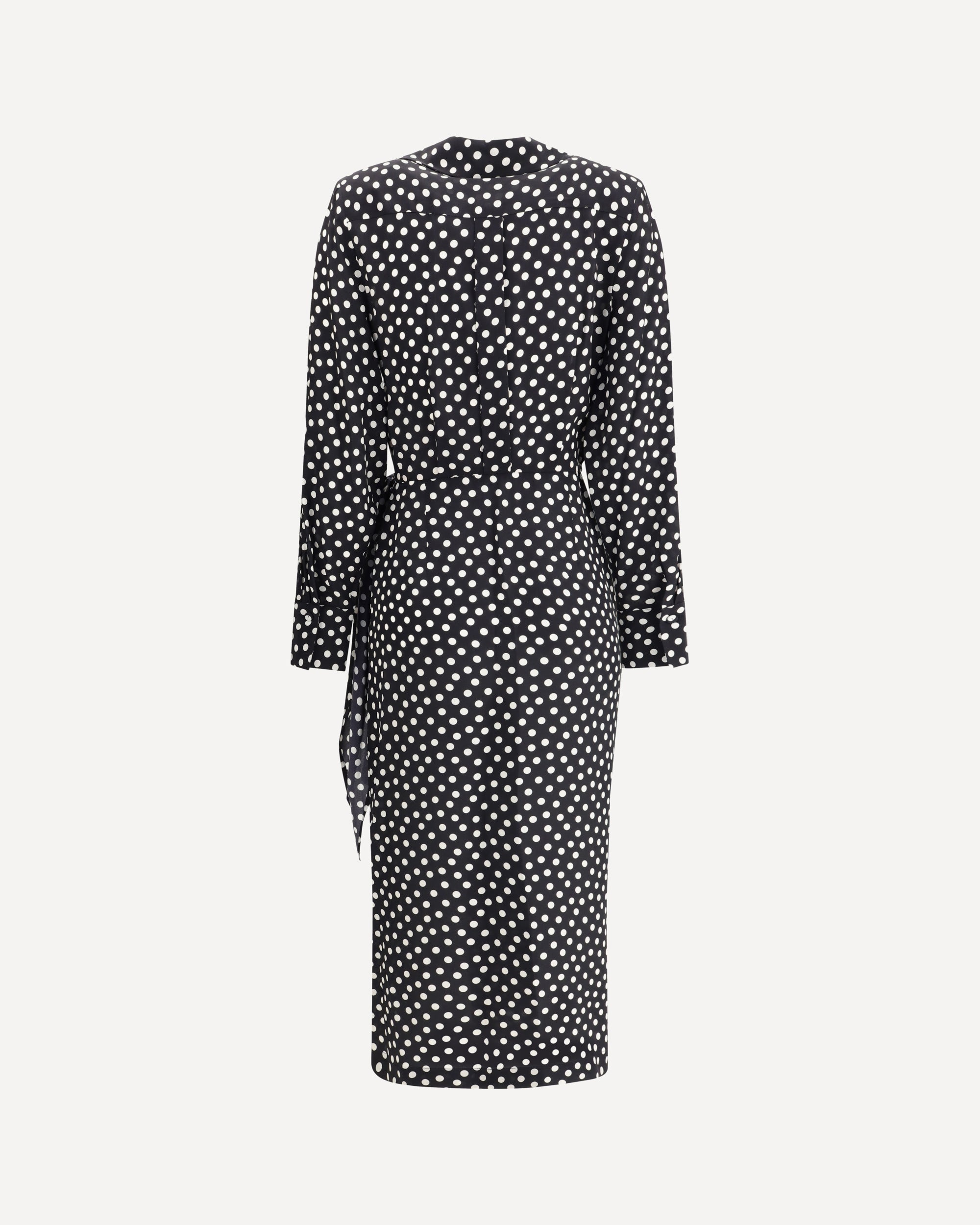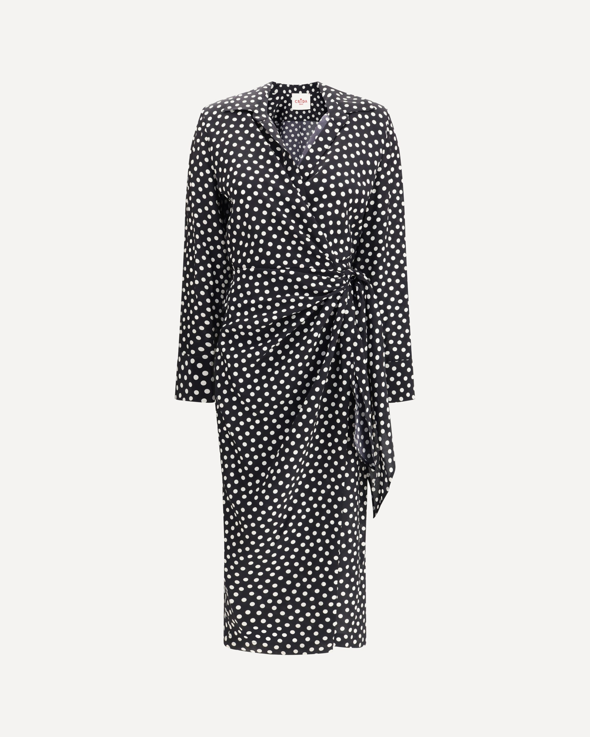 The Como Dress in Crêpe de chine by Crida Milano is a garment with sophisticated and feminine appeal. The wrap model, with its draping on the front, creates a fluid and enveloping effect that enhances the figure. The V-neckline adds a touch of sensuality, while the polka dot pattern gives a playful yet elegant character. The tie bow on the left hip introduces an element of originality, gently emphasizing the silhouette. An elegant drape created by a side stop at the waist gives the dress an unprecedented and refined note, making it perfect for special occasions or a sophisticated daytime look. The crepe de chine fabric adds a touch of luxury and comfort, making this dress a true classy wardrobe piece.