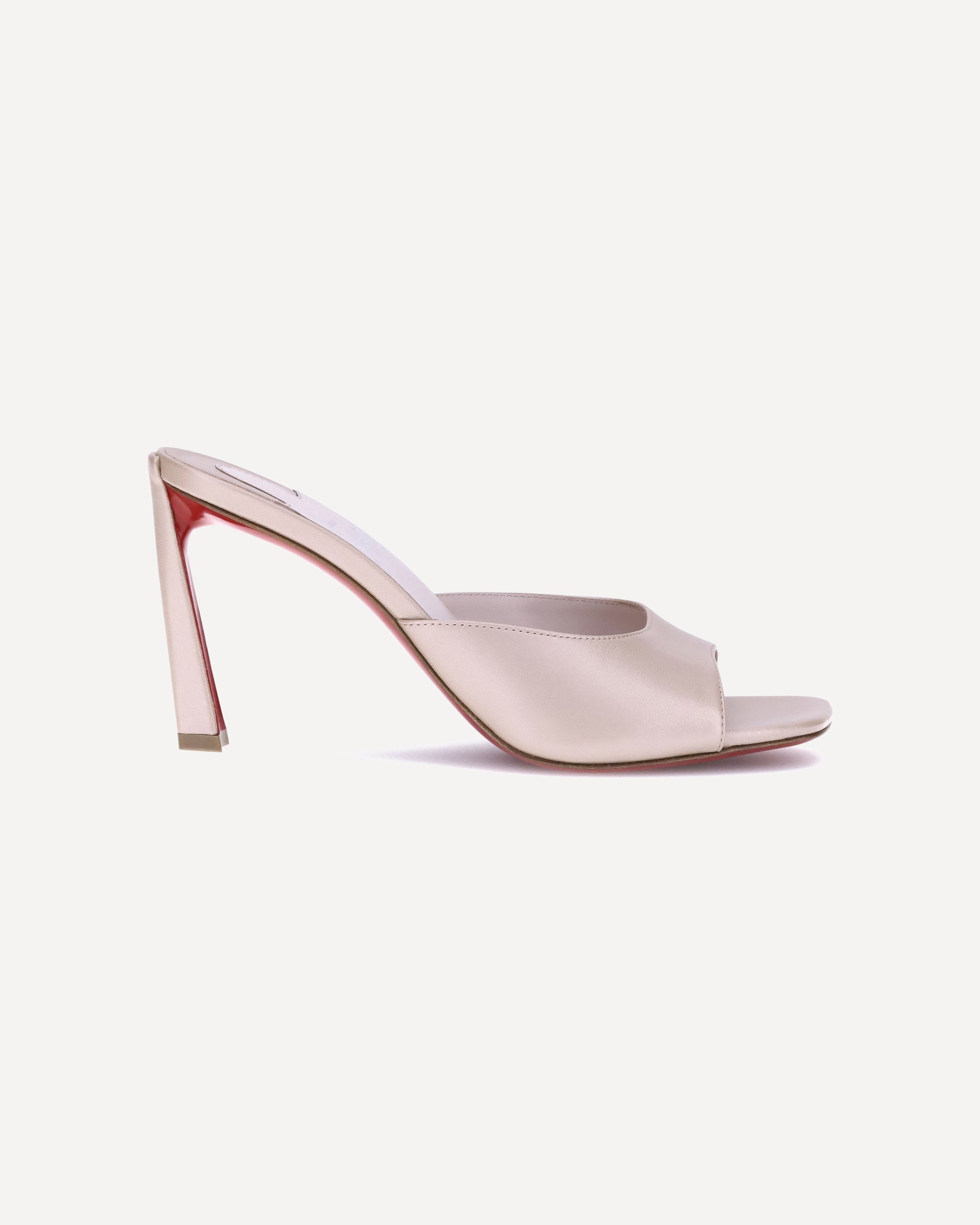 Christian Louboutin's Condora mules Sandals combine sensuality, graphic design and excellent craftsmanship. Made of soft lambskin nappa leather with a satin finish, they are distinguished by an essential yet striking silhouette, enhanced by a square toe and a low neckline that slims the foot. The angled heel adds an architectural and modern touch, in perfect balance with the model's elegance. Completing the design is the iconic red sole, the house's unmistakable signature.