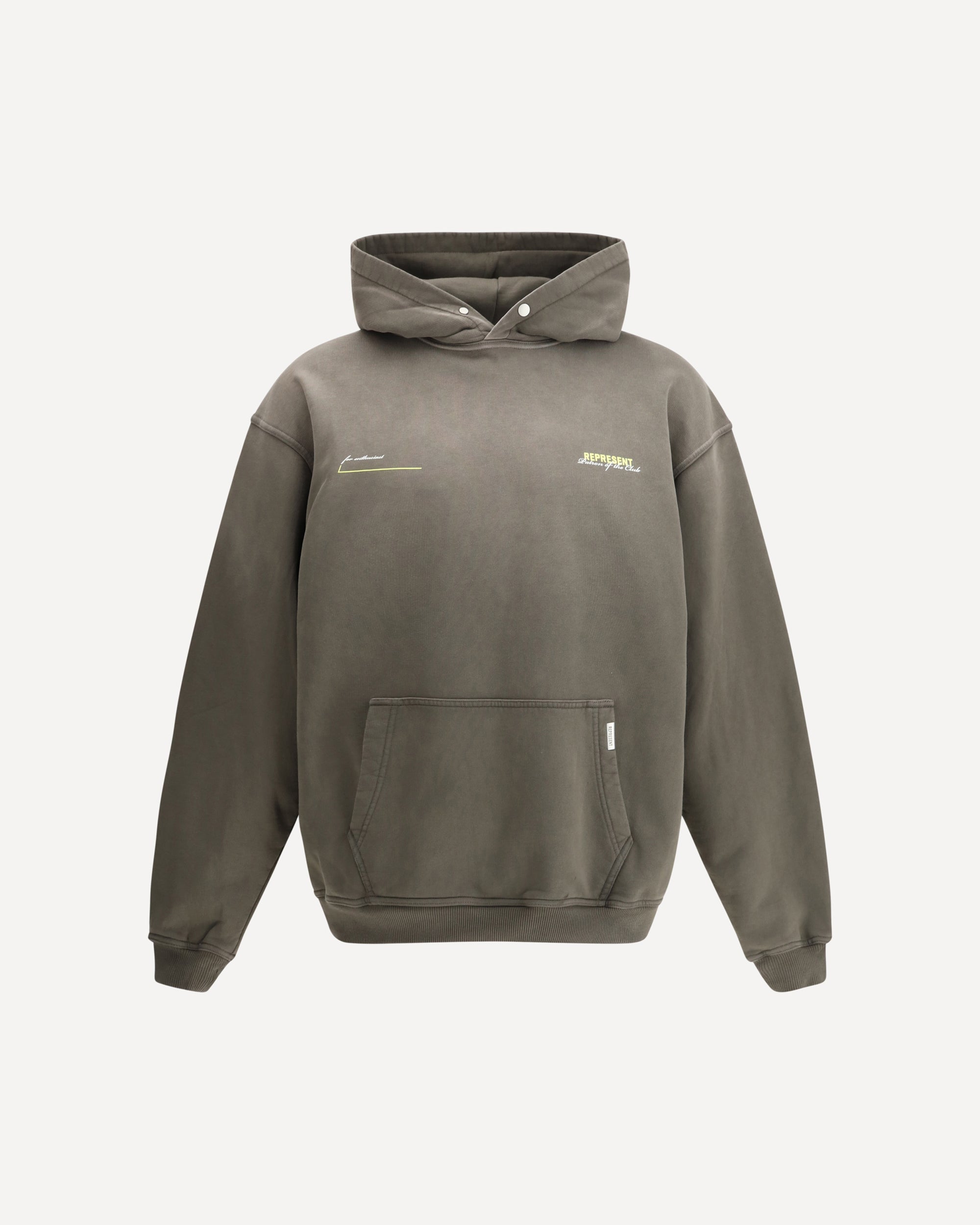 The cotton Hoodie by Represent is a casual garment with a modern design. It features an adjustable hood with magnetic button closure, ribbed cuffs and a ribbed hem for a comfortable fit. The front kangaroo pocket adds practicality, while the brand's iconic monogram, printed in contrast on the front and back, enhances its identity. The regular fit makes it versatile and perfect for any streetwear look.
