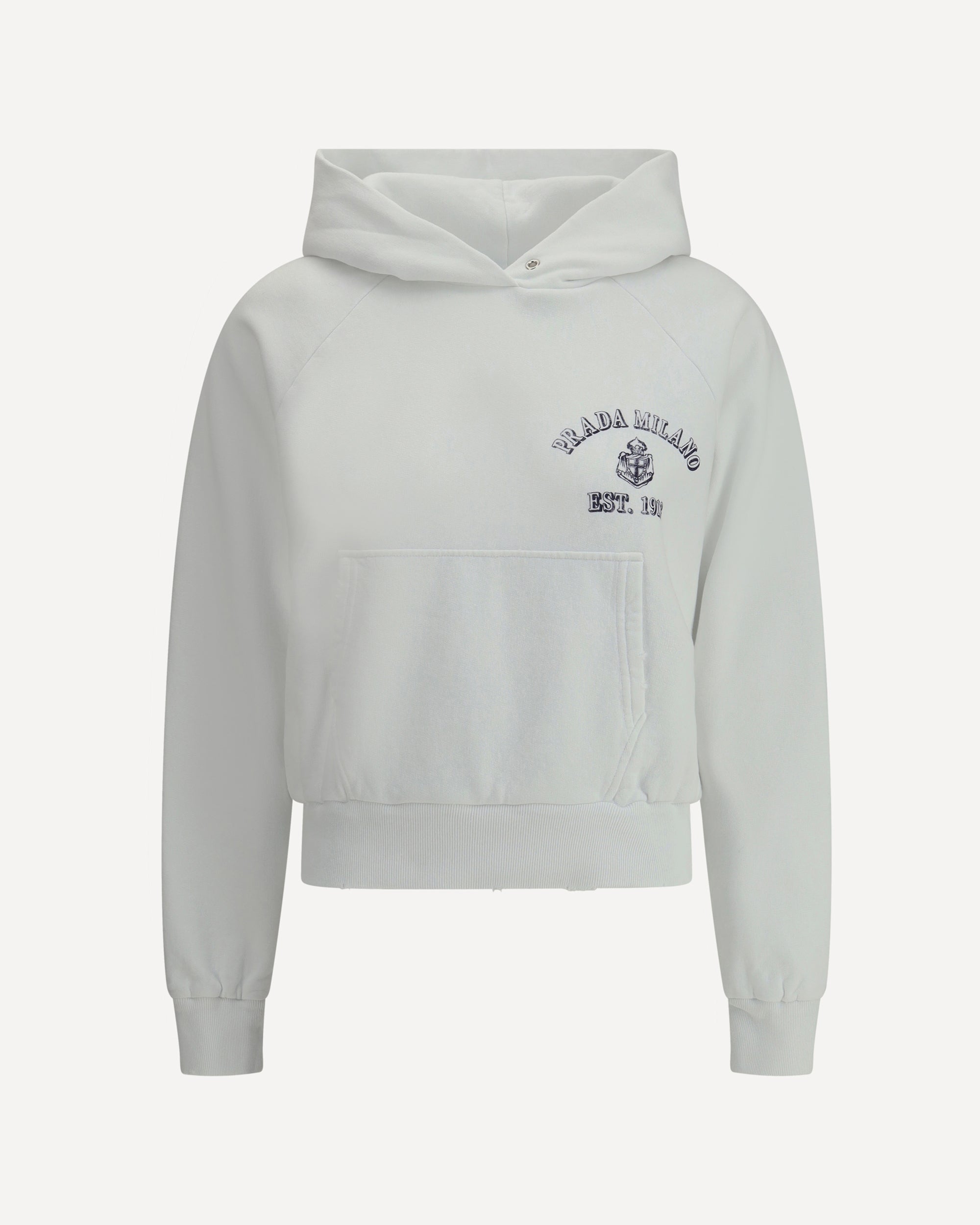 Prada's cotton Hoodie features a hood, front kangaroo pocket that offers functionality and comfort, while the brand's iconic contrasting embroidered monogram adds a distinctive touch. Ribbed cuffs and hem complete the design, ensuring a perfect fit. A casual and sophisticated garment, ideal for a relaxed yet stylish look.