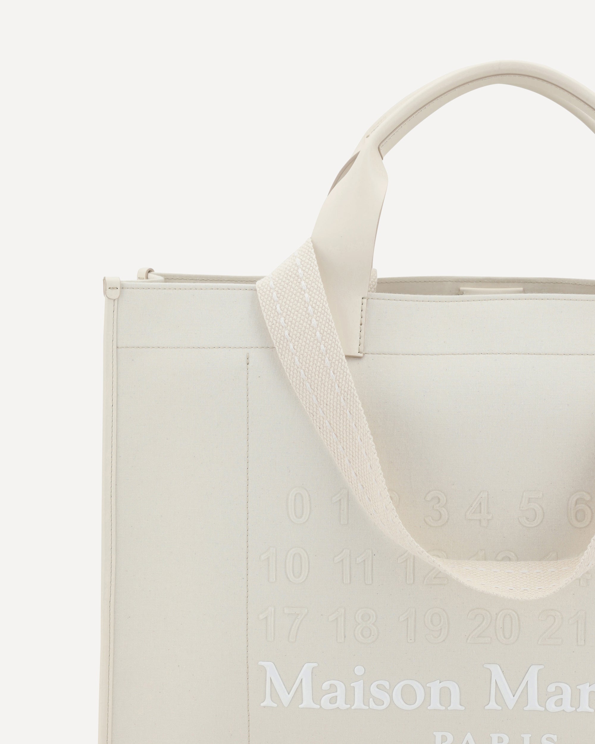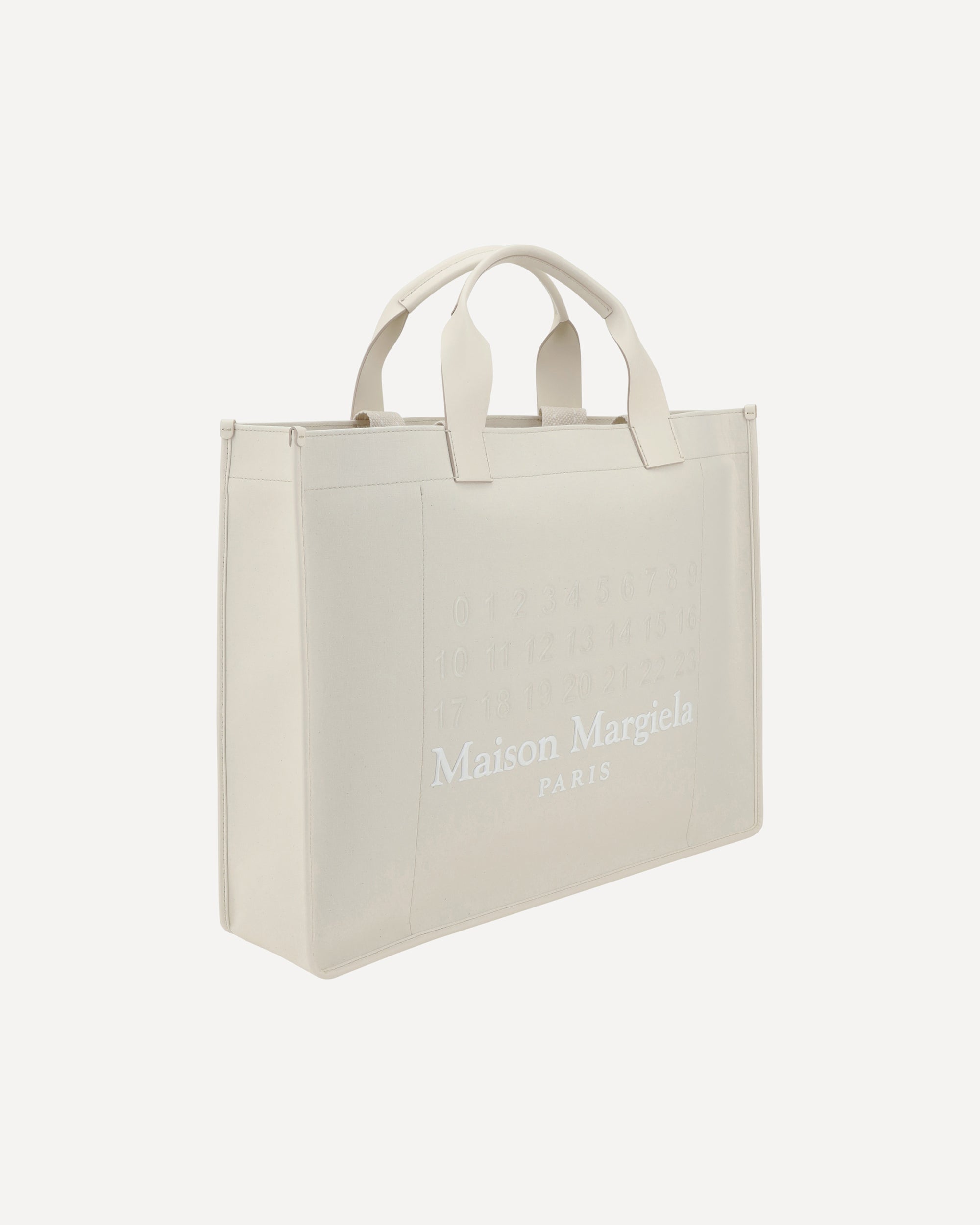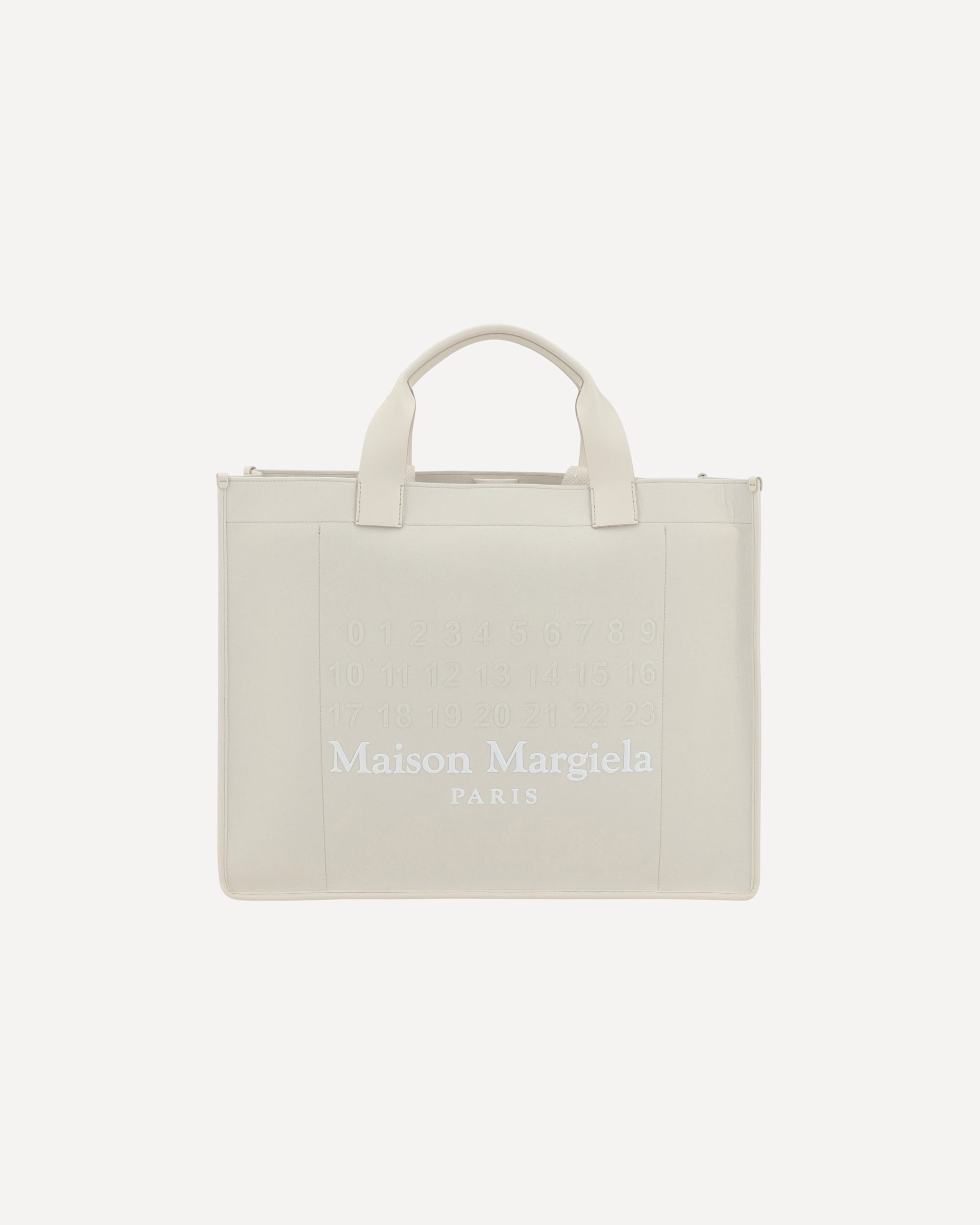 Margiela's Tote Bag is made of cotton, a lightweight and durable material. It features two leather top handles, allowing it to be carried comfortably by hand, and a flat shoulder strap, ideal for wearing it over the shoulder. The closure is magnetic, making it easy to open and close the bag. Inside, there is a single compartment with welt pockets, perfect for keeping smaller items tidy. The design is completed by the iconic numbered logo on the front, a hallmark of Maison Margiela.