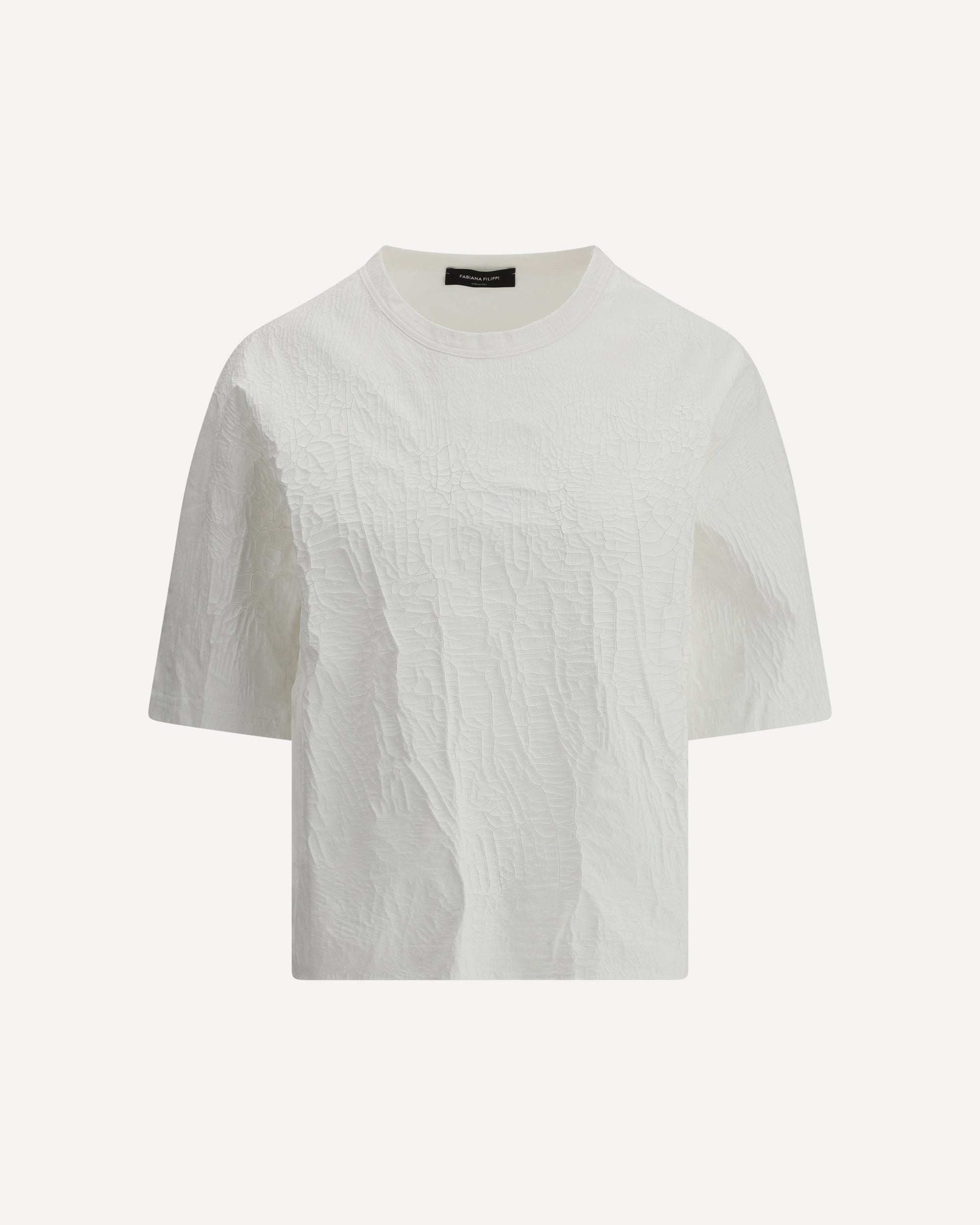 Fabiana Filippi's cotton T-Shirt features a crackle effect design that covers the entire surface, creating a unique and interesting visual effect. The monochrome pattern gives the garment an elegant and versatile look that can be easily combined with various styles. The cotton fabric ensures comfort and freshness, making this T-shirt ideal for a casual-chic look, with a touch of originality thanks to the crackle effect.