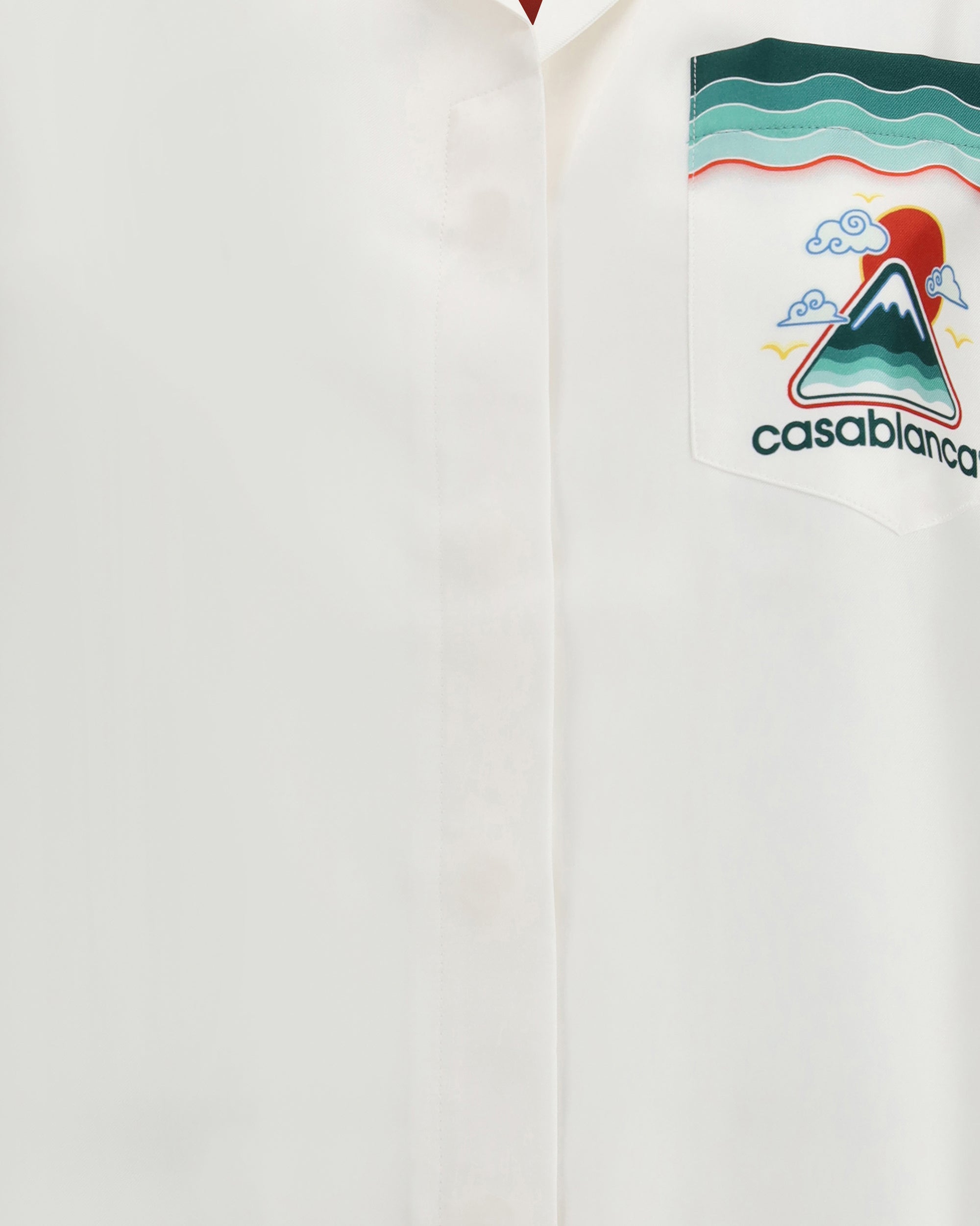 The all-over print silk Montagne Ondulée shirt, inspired by Japanese iconography, features a Cuban collar, hidden CC buttons and Memphis stripe detailing.