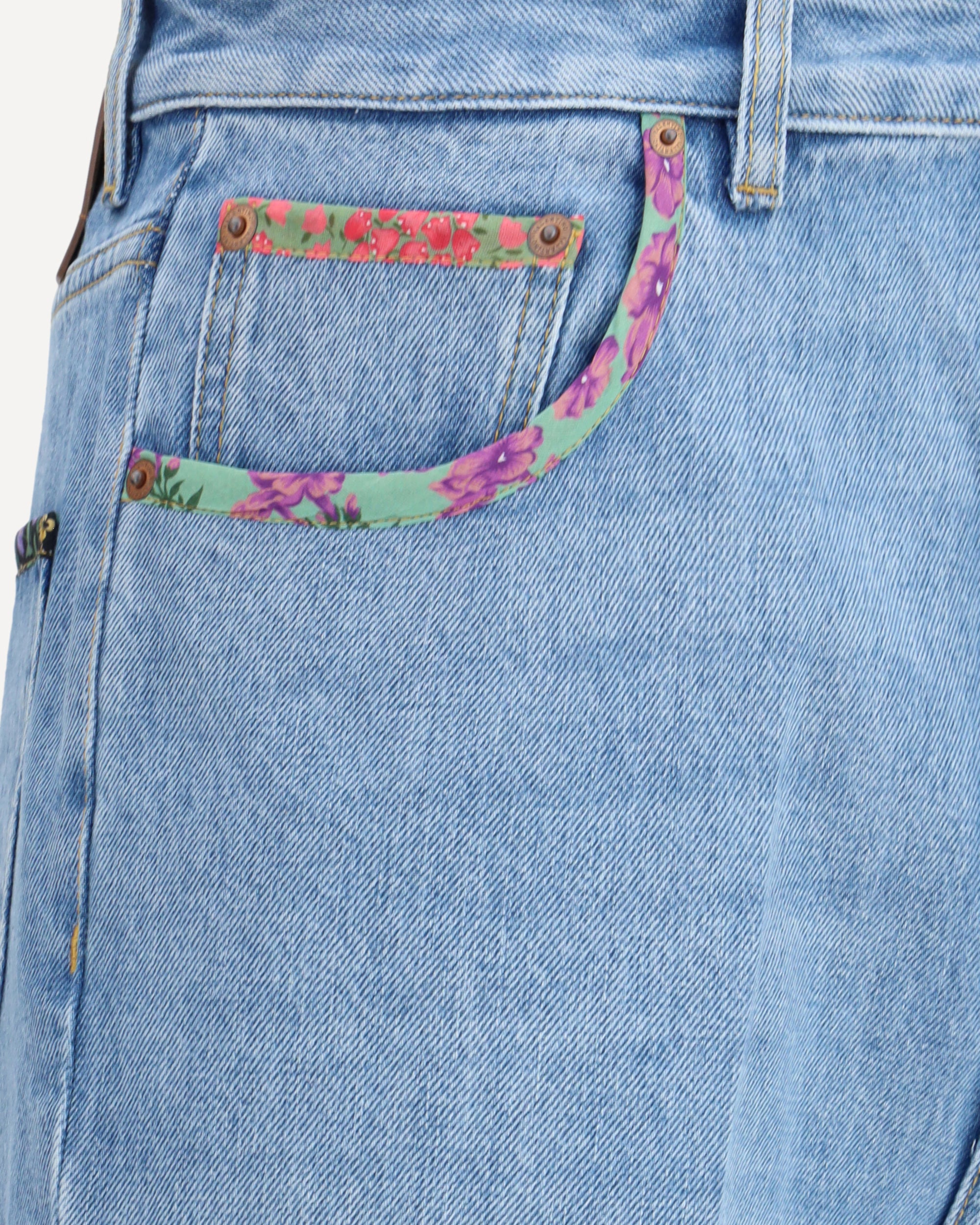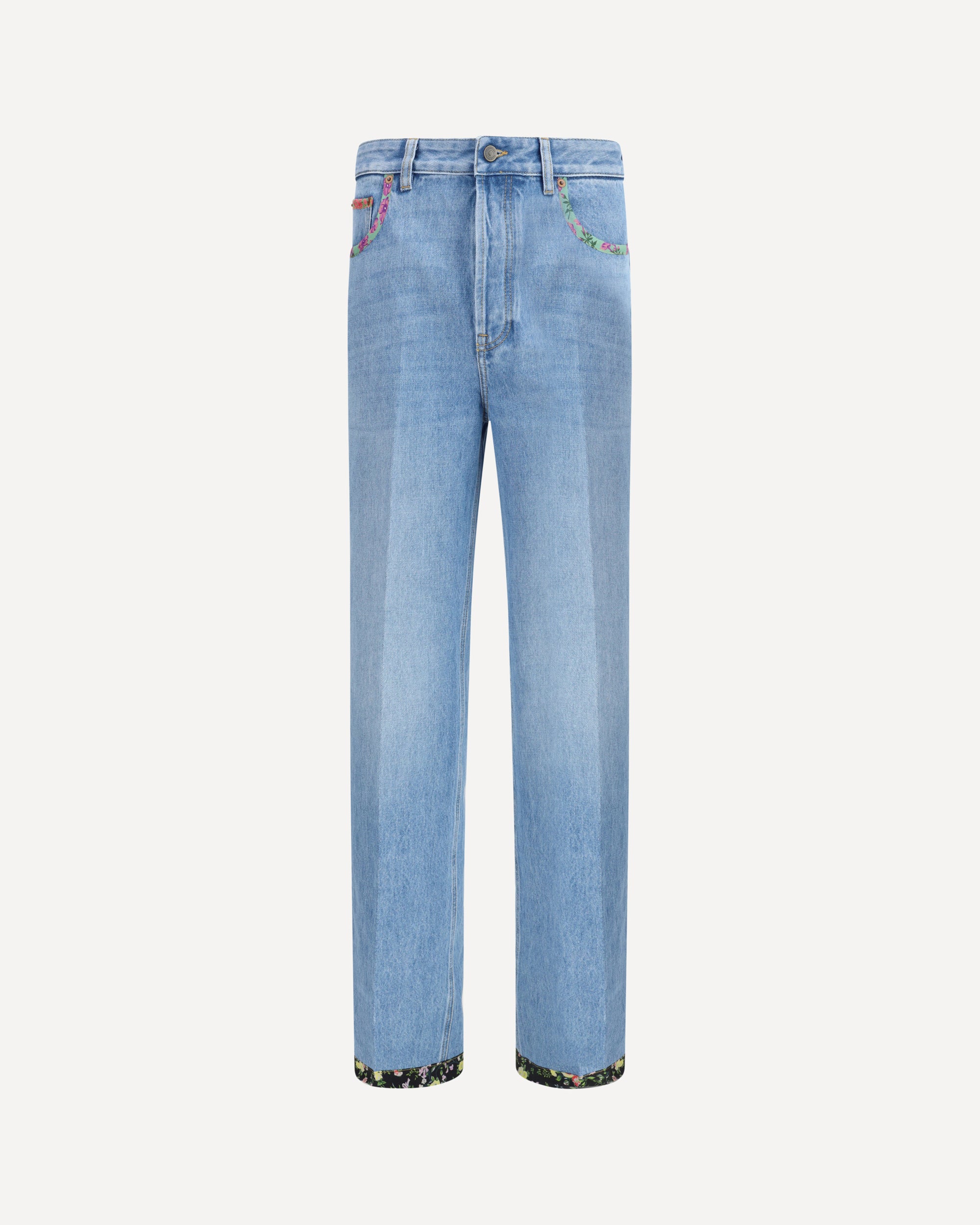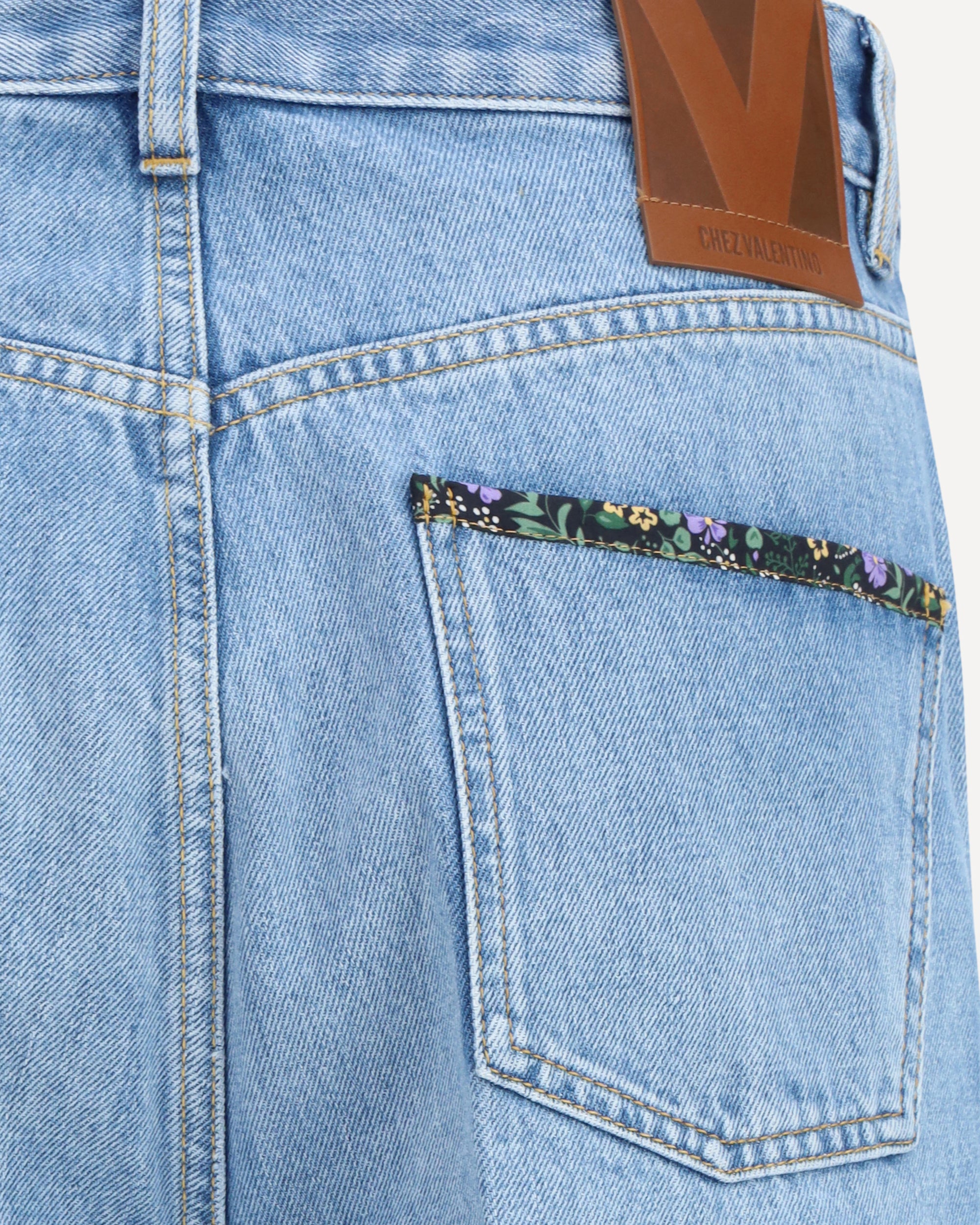 Valentino's cotton Jeans combine classic denim with a romantic and sophisticated touch. The model features a medium waist and a five-pocket construction, with a front button closure. The distinctive element is the refined floral fabric inserts applied on the pockets and hem, which give the garment an original and contemporary elegance. Perfect for those who want to stand out in style even in the most casual looks.