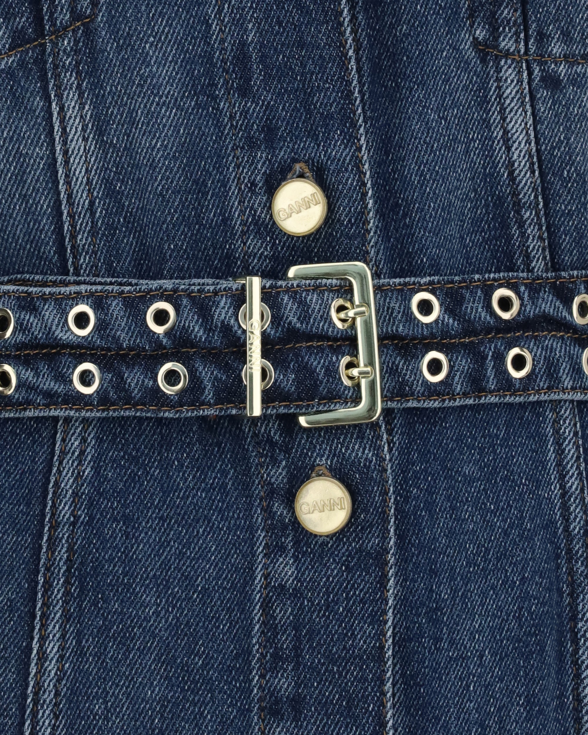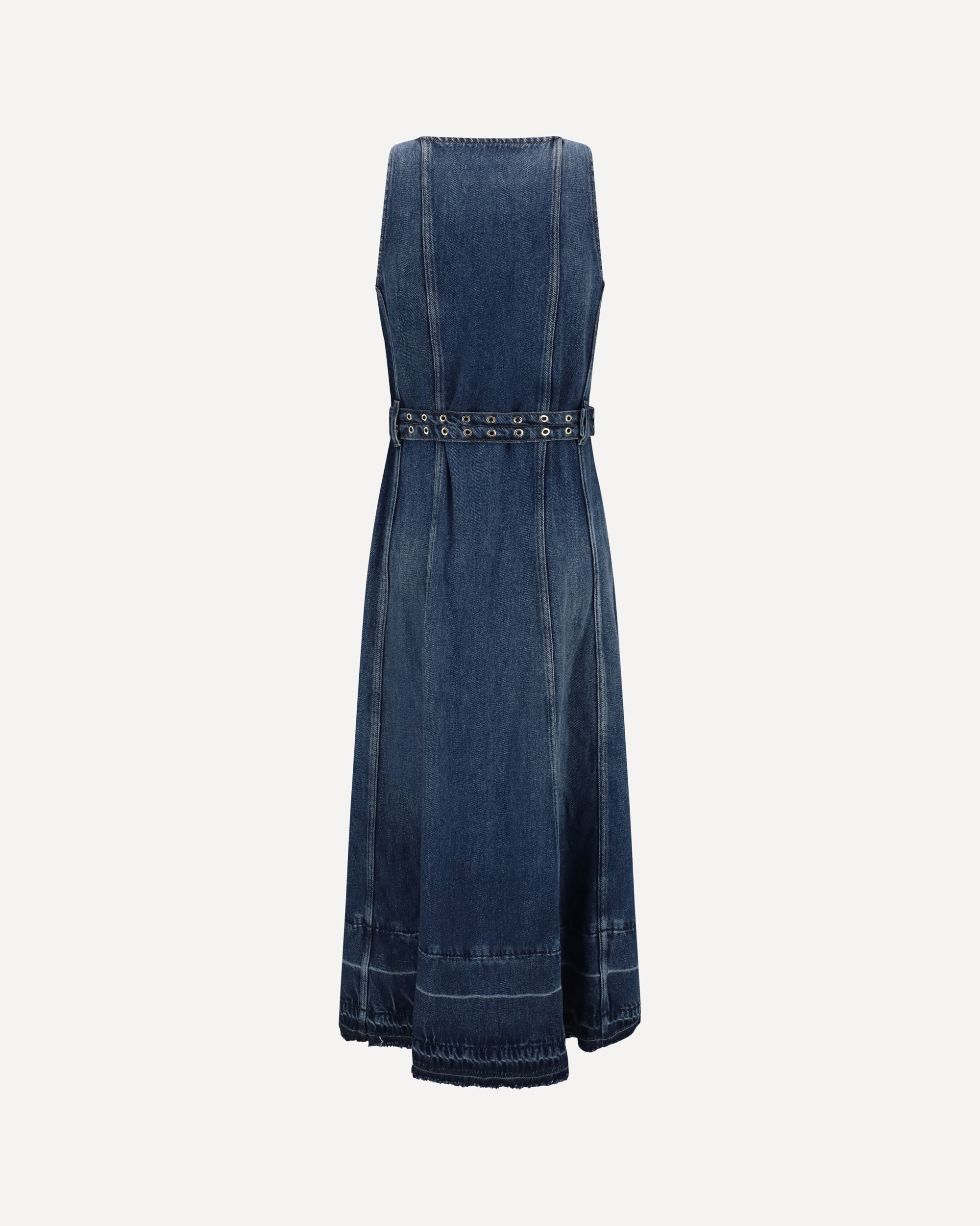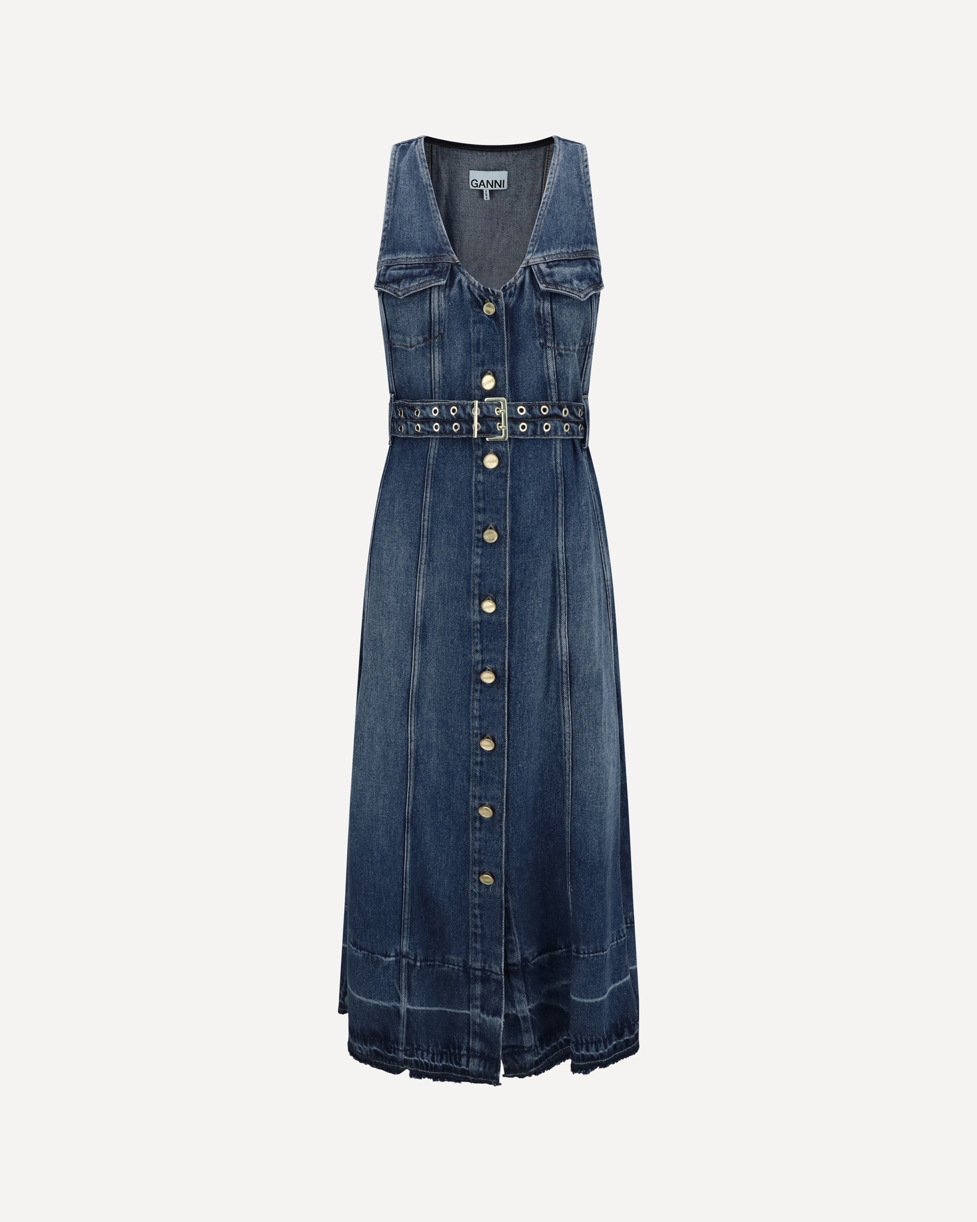 Ganni's denim midi Dress is a sleek, contemporary piece featuring a V-neckline and a sleeveless style. The front button closure and chest patch pockets add functionality, while the matching belt with metal eyelets completes the look with a distinctive and sophisticated detail.