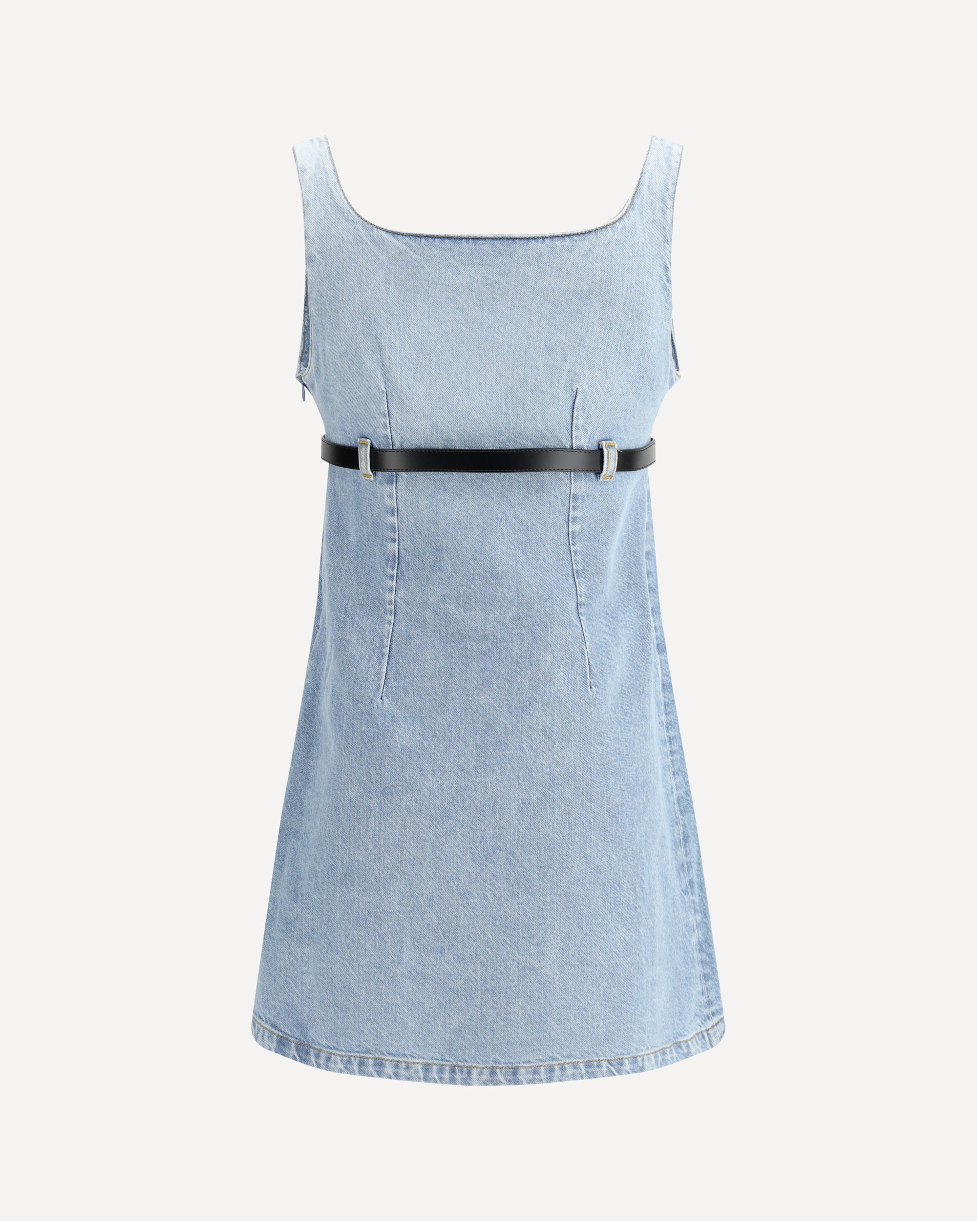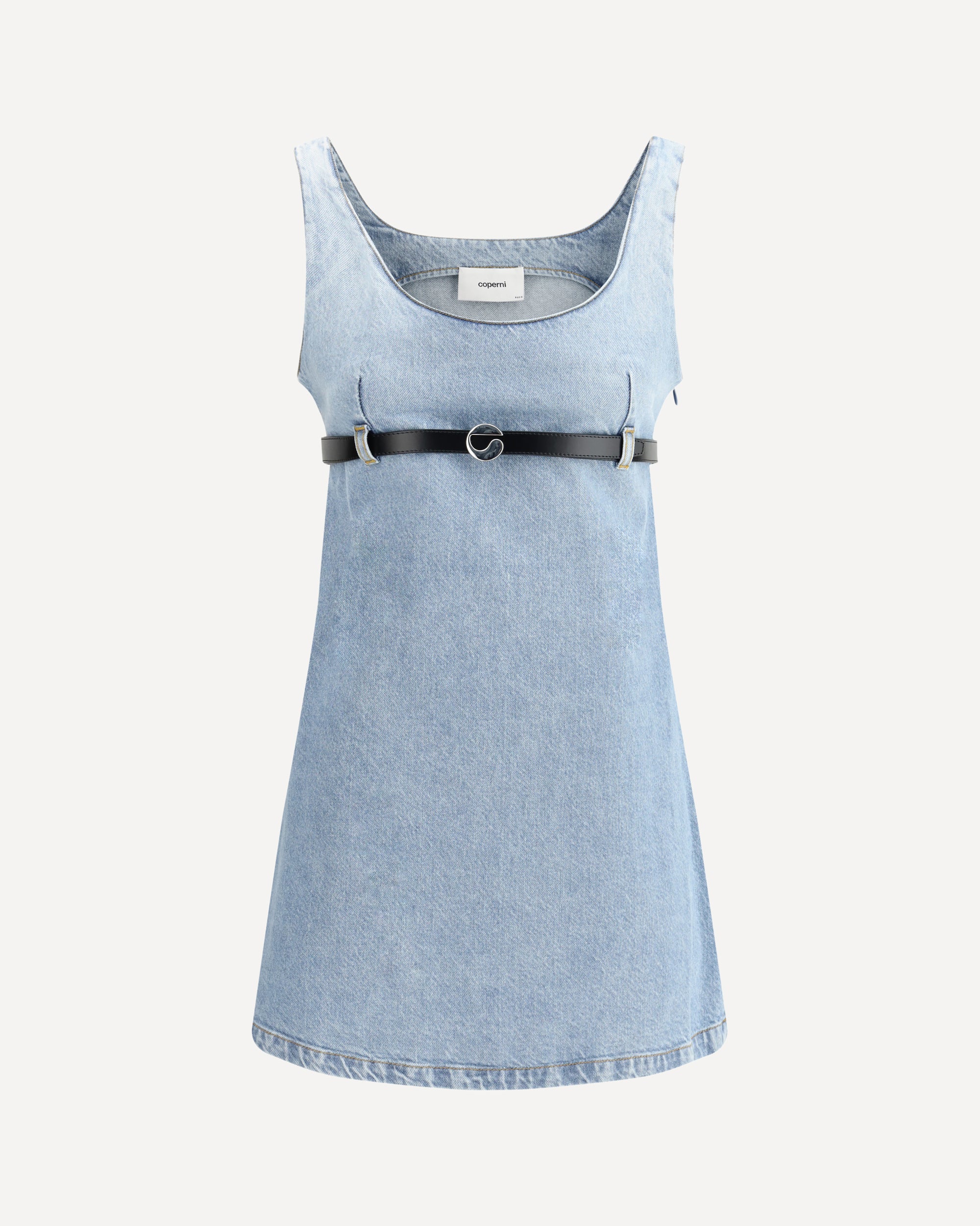 Coperni's denim short Dress is a bold and contemporary design, perfect for those seeking a chic and distinctive look. The sleeveless design with a wide round neckline gives a fresh, modern look, while the side zipper closure ensures a perfect fit. Belt loops on the waistband offer the ability to further customize the fit, while the built-in leather adjustable belt with brand logo buckle adds a touch of sophistication and recognition. This belt is also removable, allowing the dress to be adapted to different styles