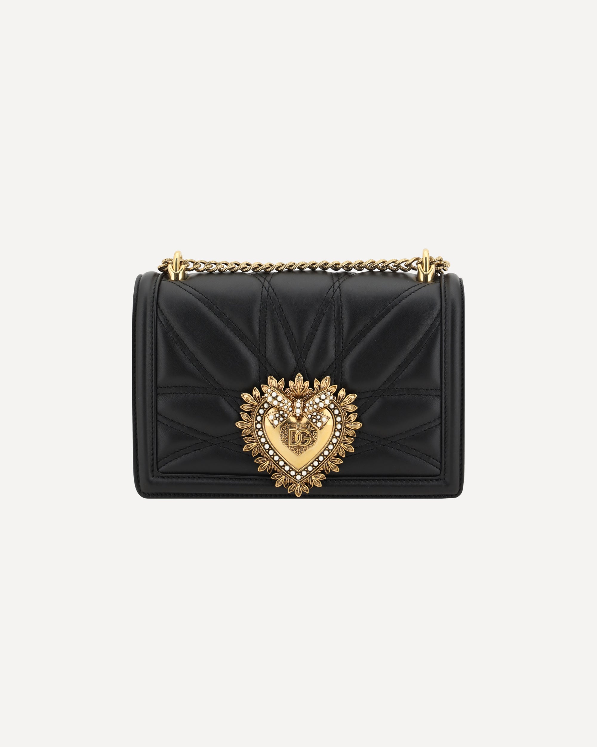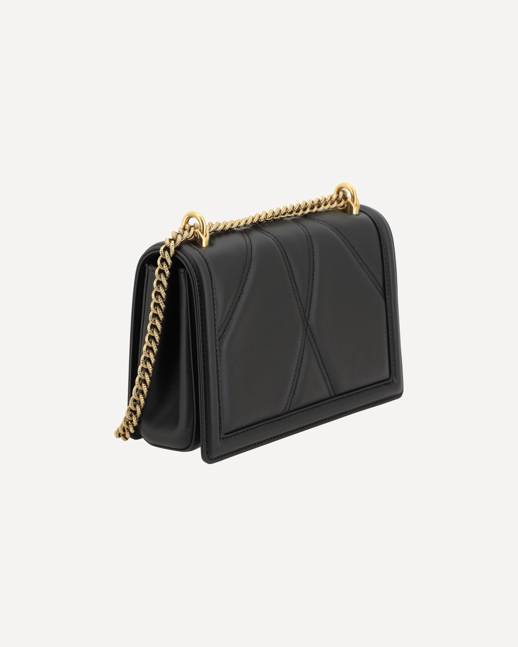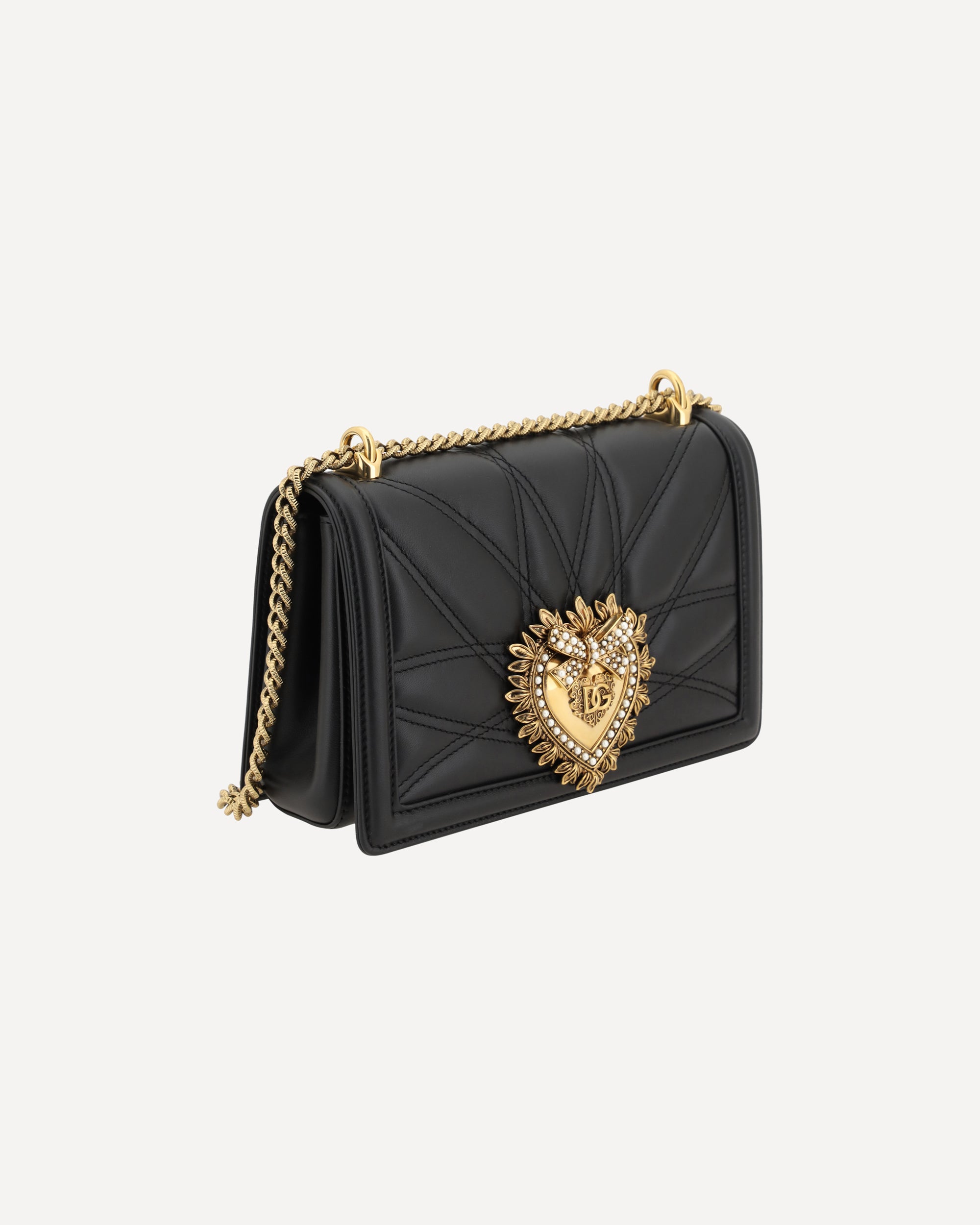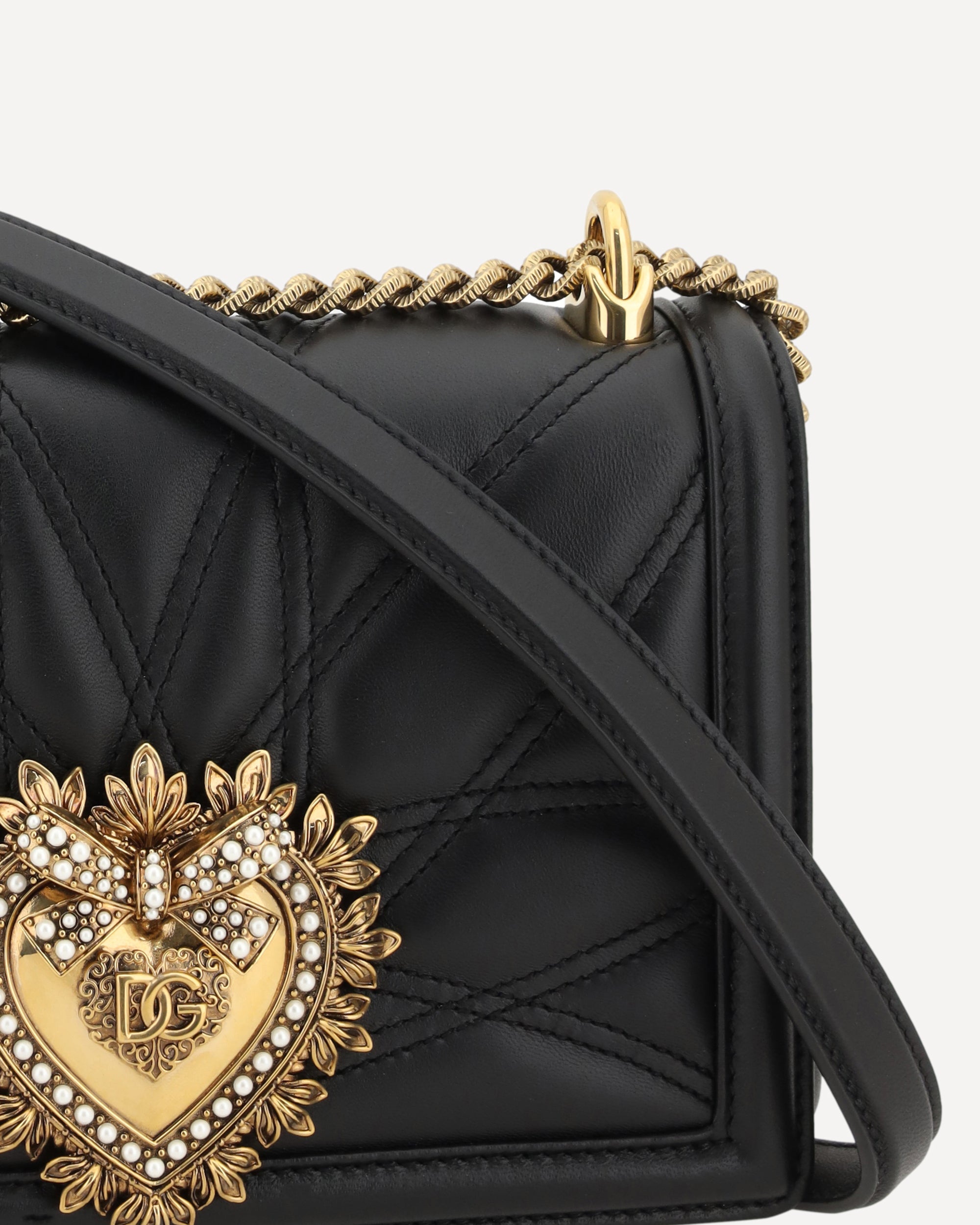 Leather Devotion Shoulder Bag by Dolce&Gabbana, front closure via magnetic flap, jewel-embellished closure with iconic D&G plaque applied in contrast at front, sliding chain shoulder strap, padded and quilted design.