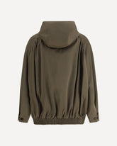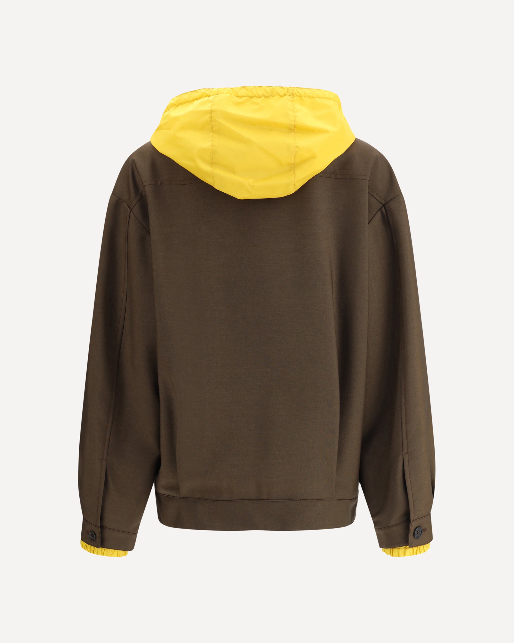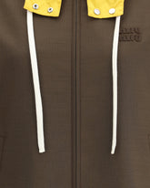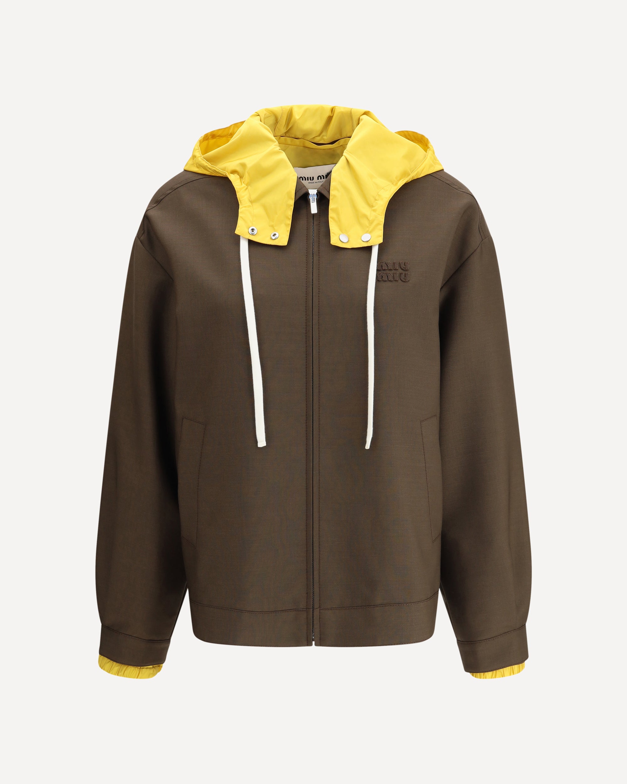 Miu Miu's hooded bomber Jacket combines a tailored silhouette with contrasting details, such as sleeves and detachable hood in technical fabric. It features buttoned cuffs, a drawstring in the hood and a zipper closure. Completing the design are welt pockets and an embroidered logo for the perfect balance of sporty style and sophistication.