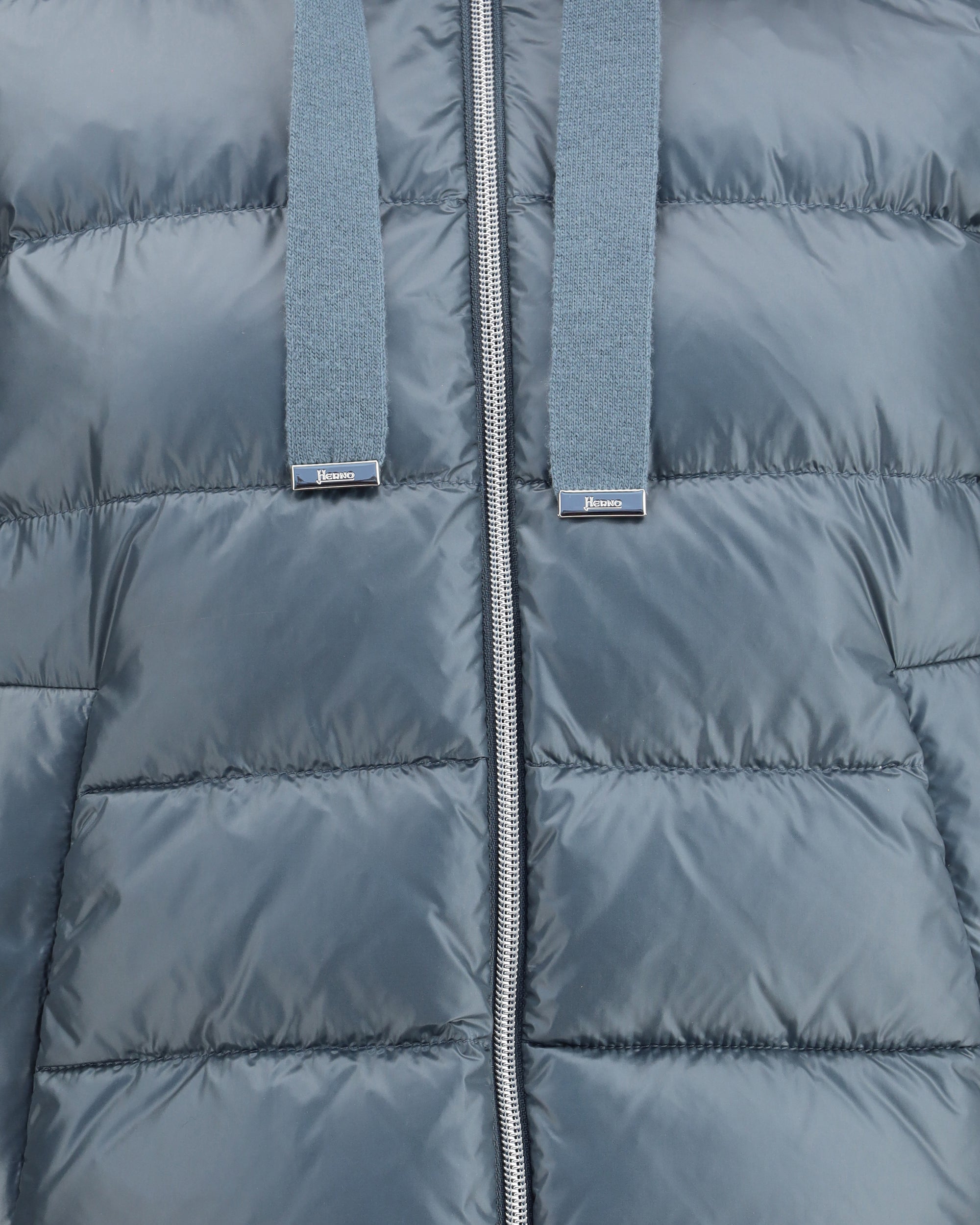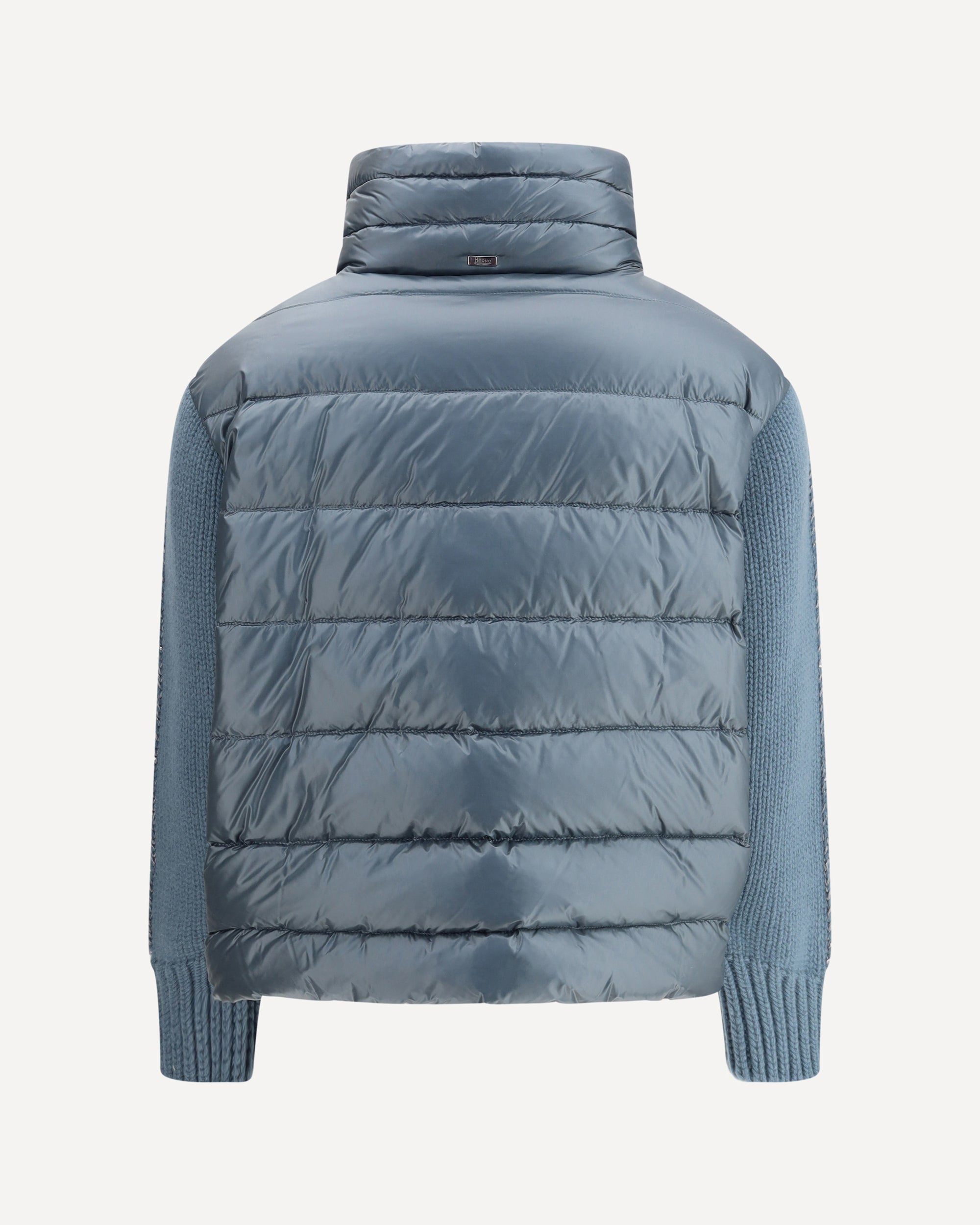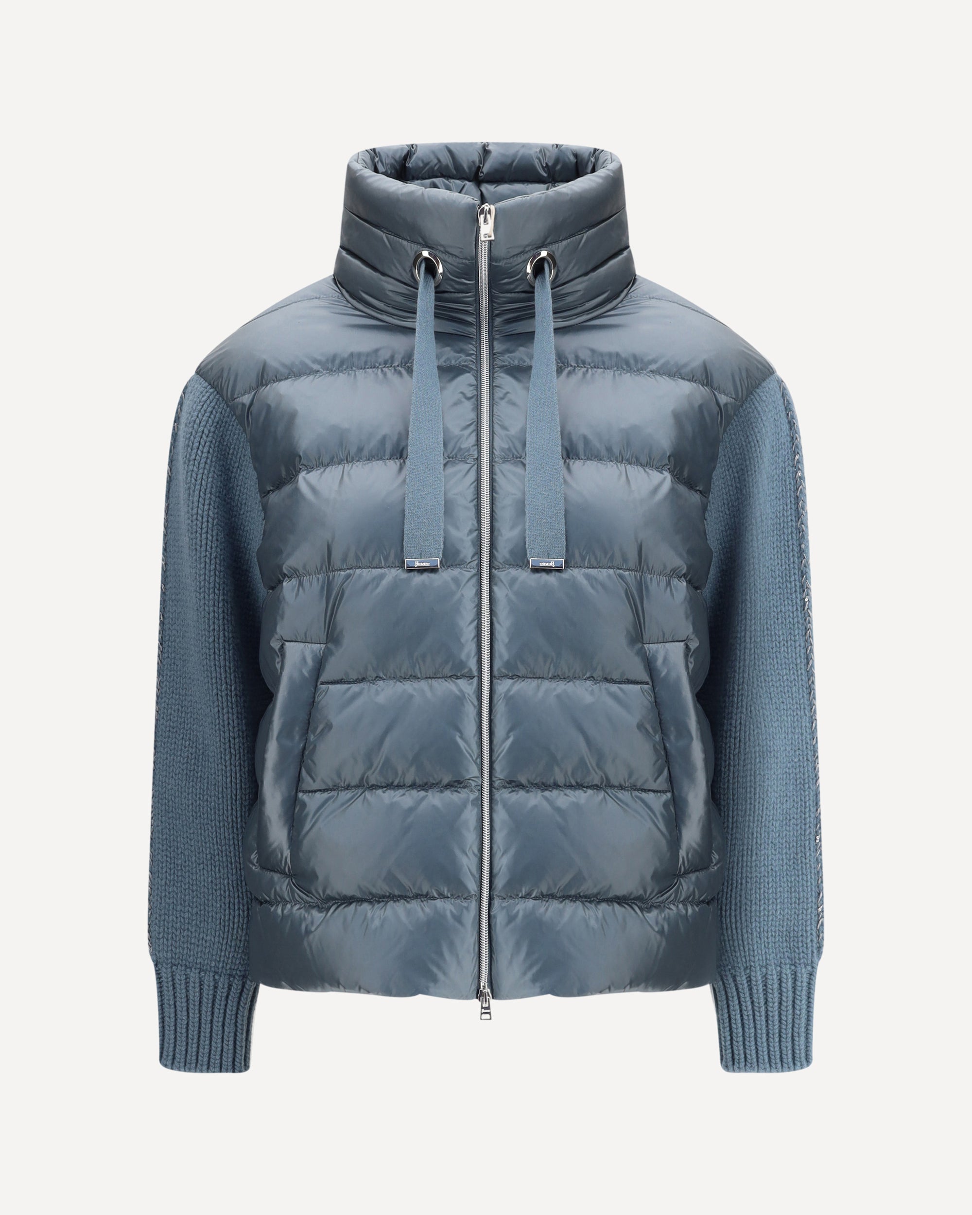 Herno's Down Jacket features wool sleeves with ribbed cuffs for a touch of warmth and comfort. The high collar is adjustable via drawstring, while the front closure with a double-slider zipper ensures practicality and versatility. Two side welt pockets and an adjustable hem with internal drawstring complete the design for a customized fit and optimal protection from the cold