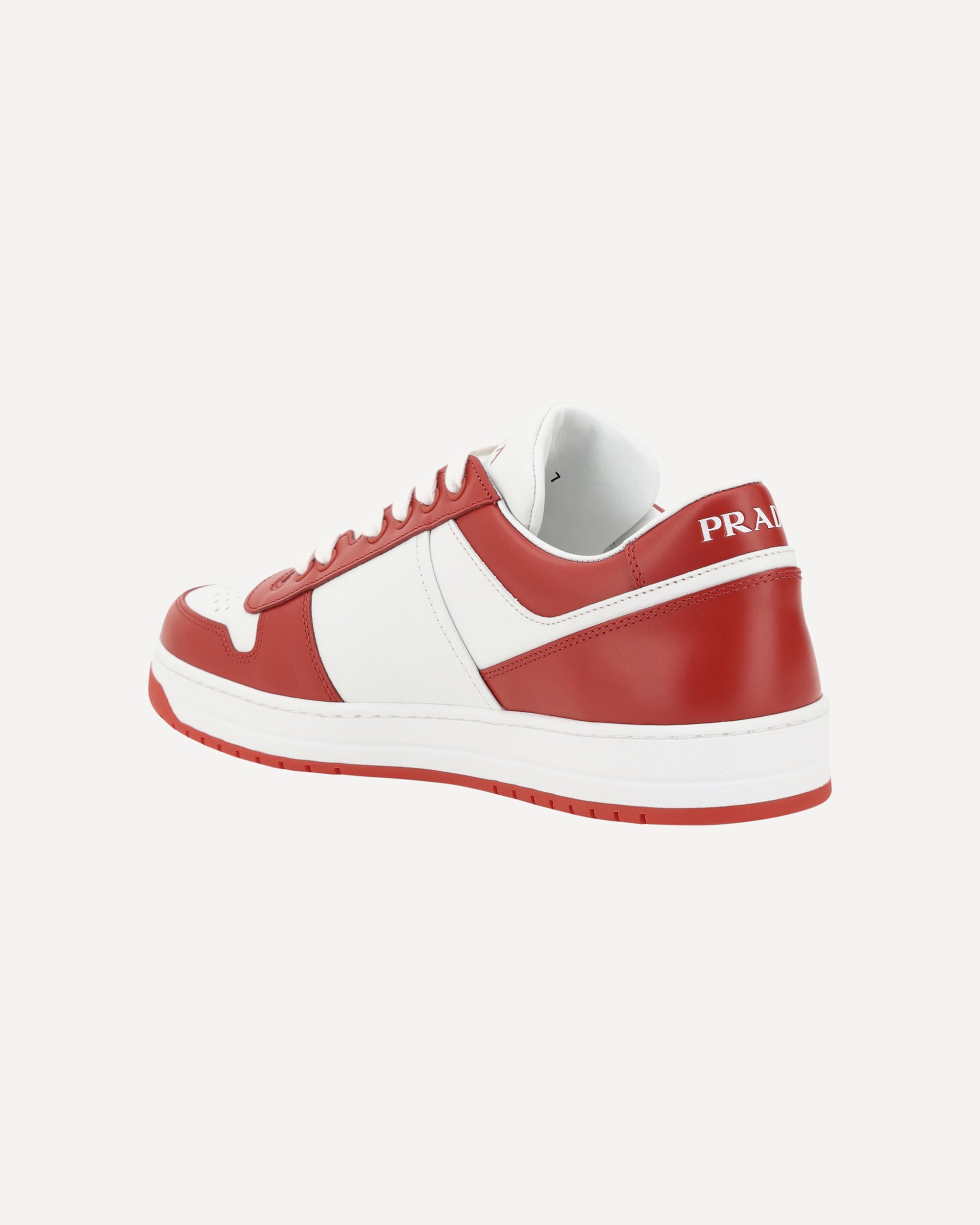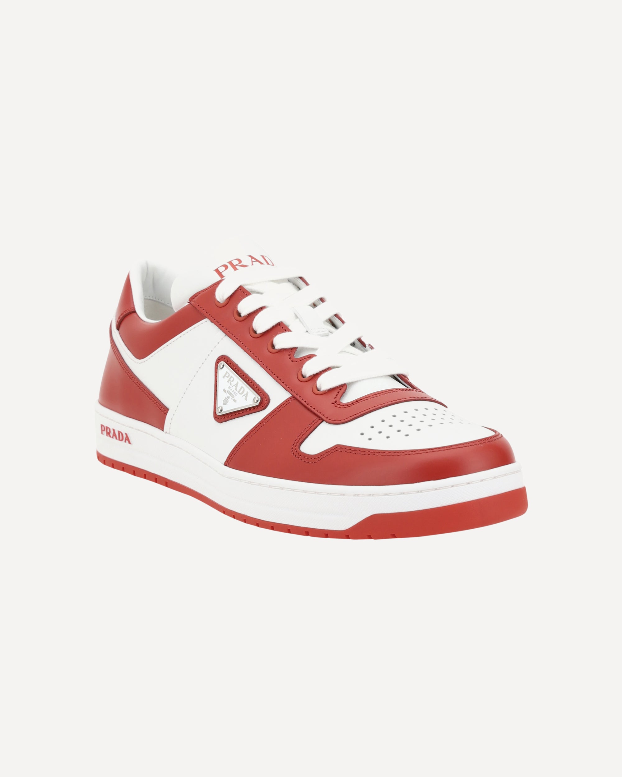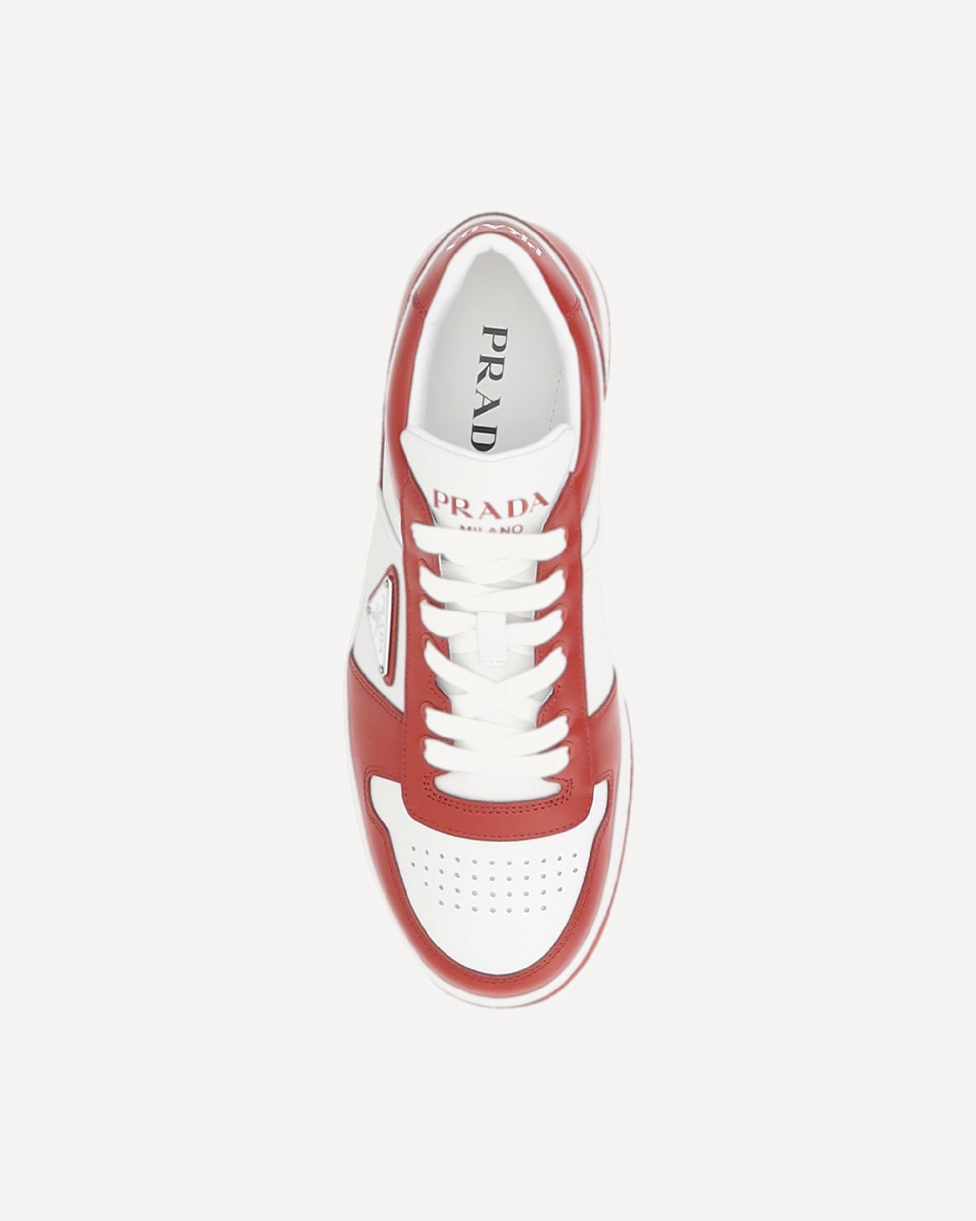 The Downtown leather Sneakers by Prada combine sporty style with refined details. They feature a lace-up front closure, perforated round toe and iconic triangular glazed plaque with the brand's signature on the side panel. The contrasting logo on the heel completes the design, making them perfect for a contemporary and distinctive look.