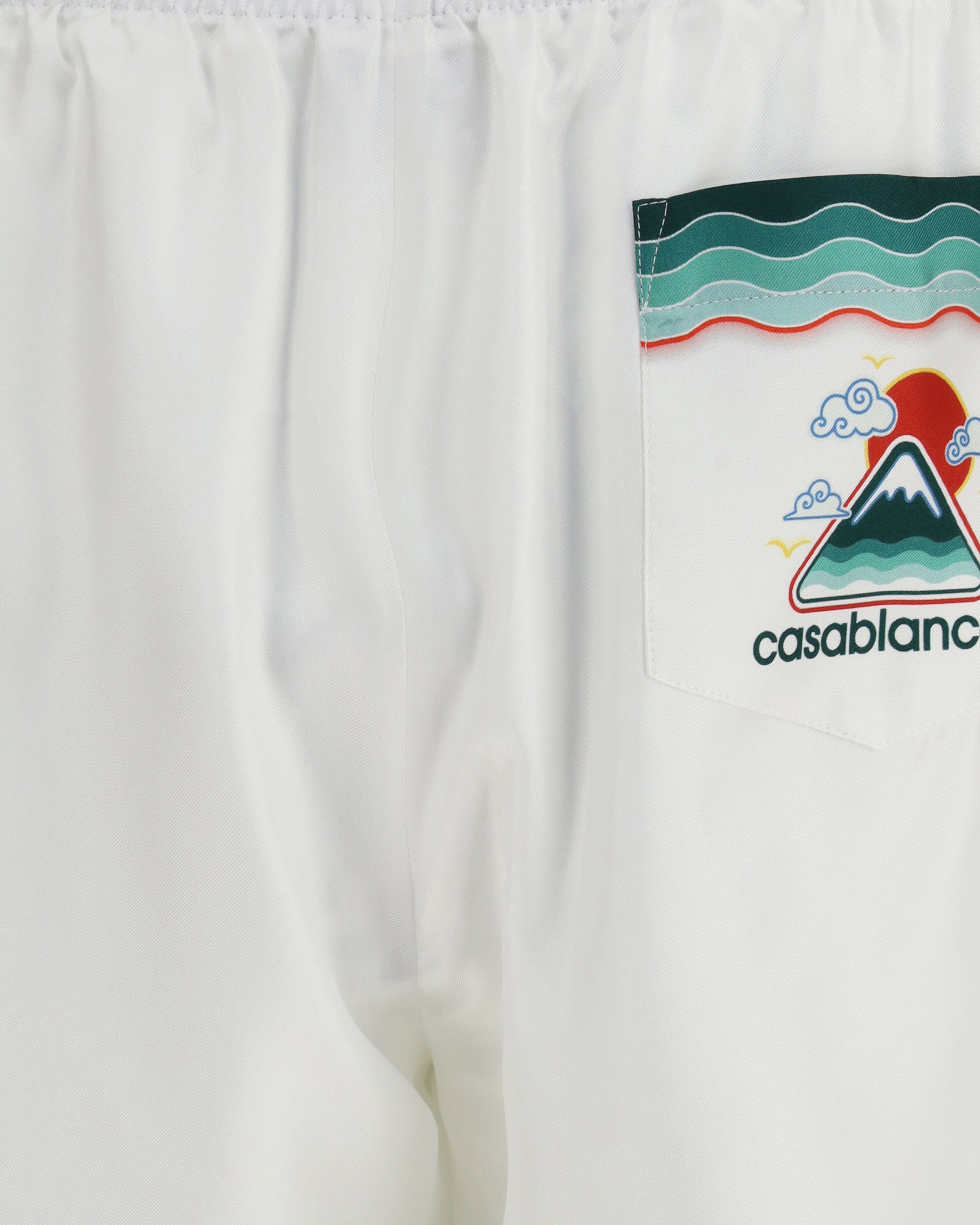 Casablanca's silk Montagne Ondulée Shorts are a print pattern inspired by fascinating Japanese iconography. The essential design, made with few strokes and colors, conveys a strong visual impact, making this garment one of the emblems of the collection. Made of silk twill, they are complemented by an elasticated waistband with drawstring, side pockets inserted into the seams, a back pocket, and striped profiles inspired by Memphis waves on the hem and back pocket.