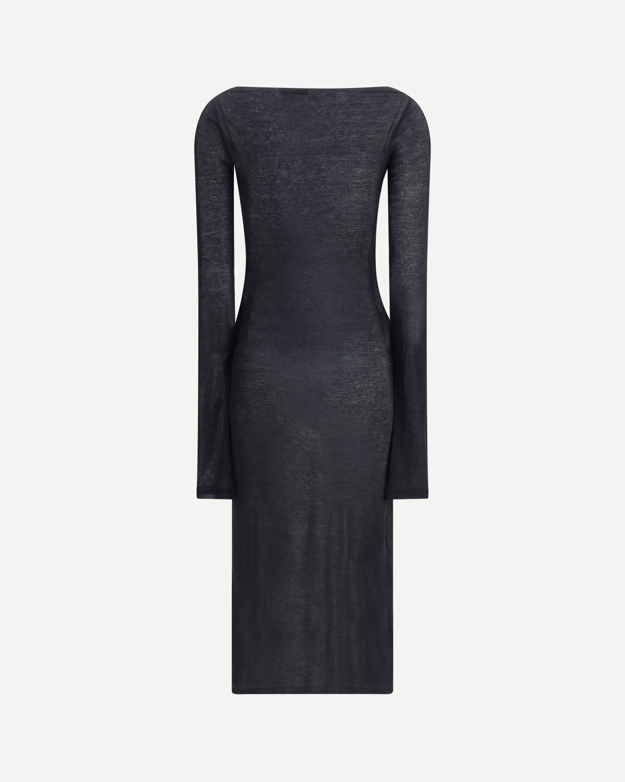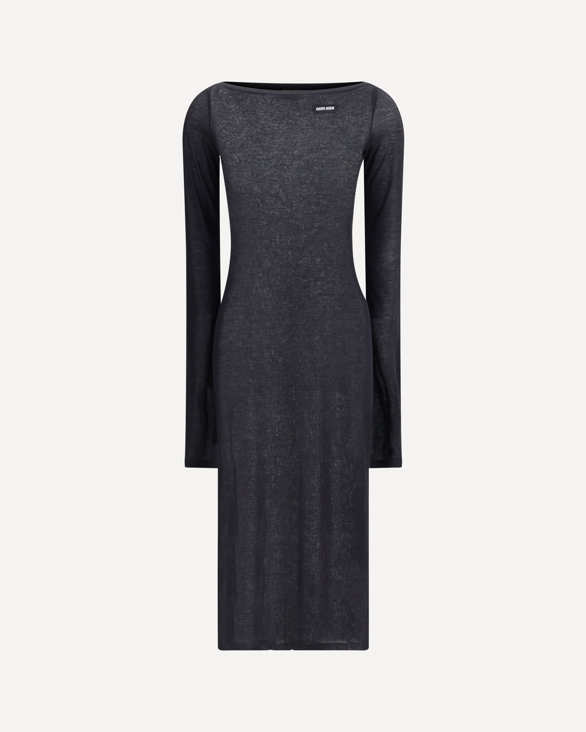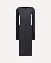 Miu Miu's Long Jersey Dress is a piece that combines comfort and sophistication. Featuring an elegant boat neckline that enhances the neckline, this dress features long sleeves for a touch of class and versatility. The stitched logo on the front adds a distinctive and discreet detail, making the dress recognizable without sacrificing understatement. Perfect for casual occasions or casual-chic evenings, it is a versatile and sophisticated piece in every woman's wardrobe.