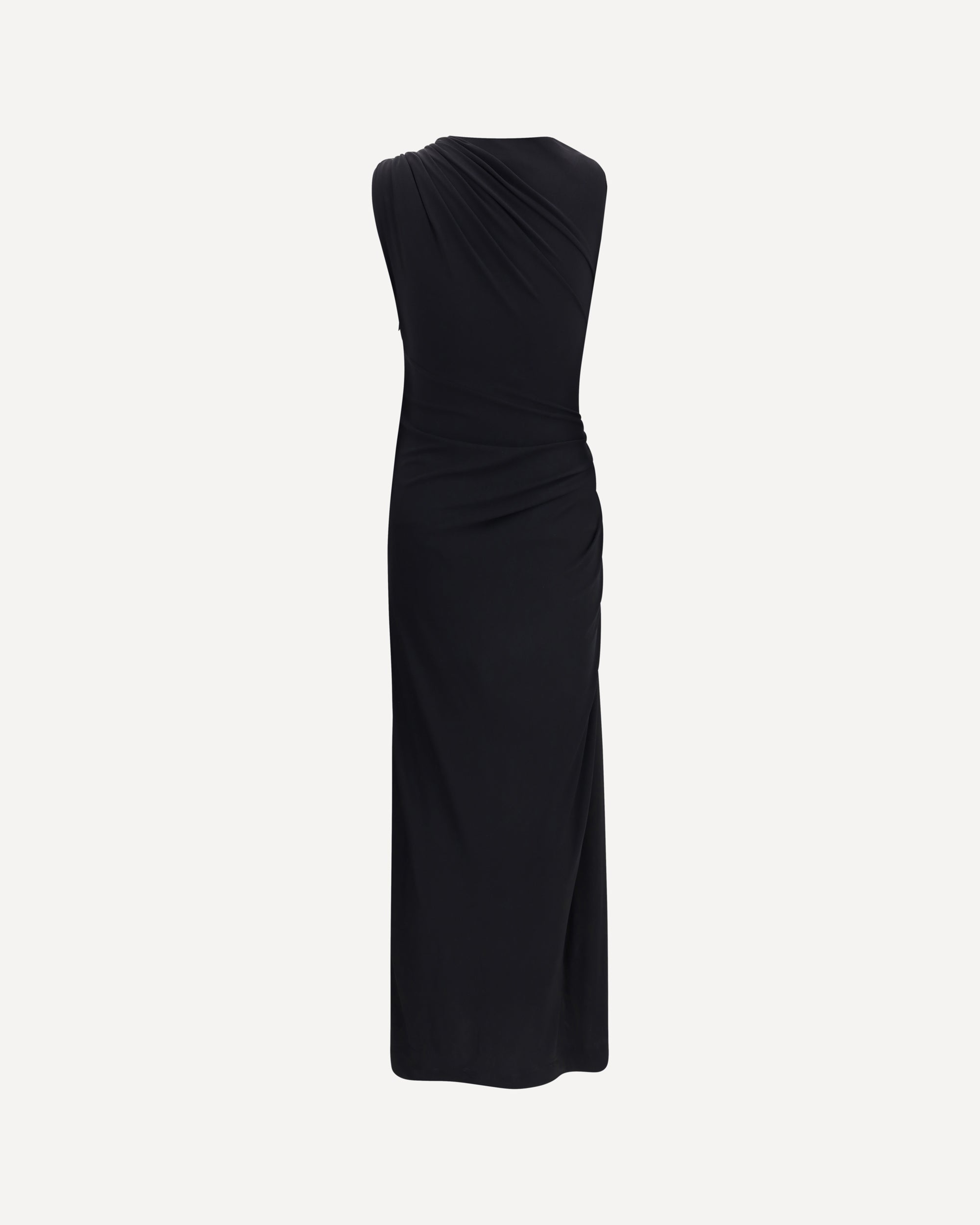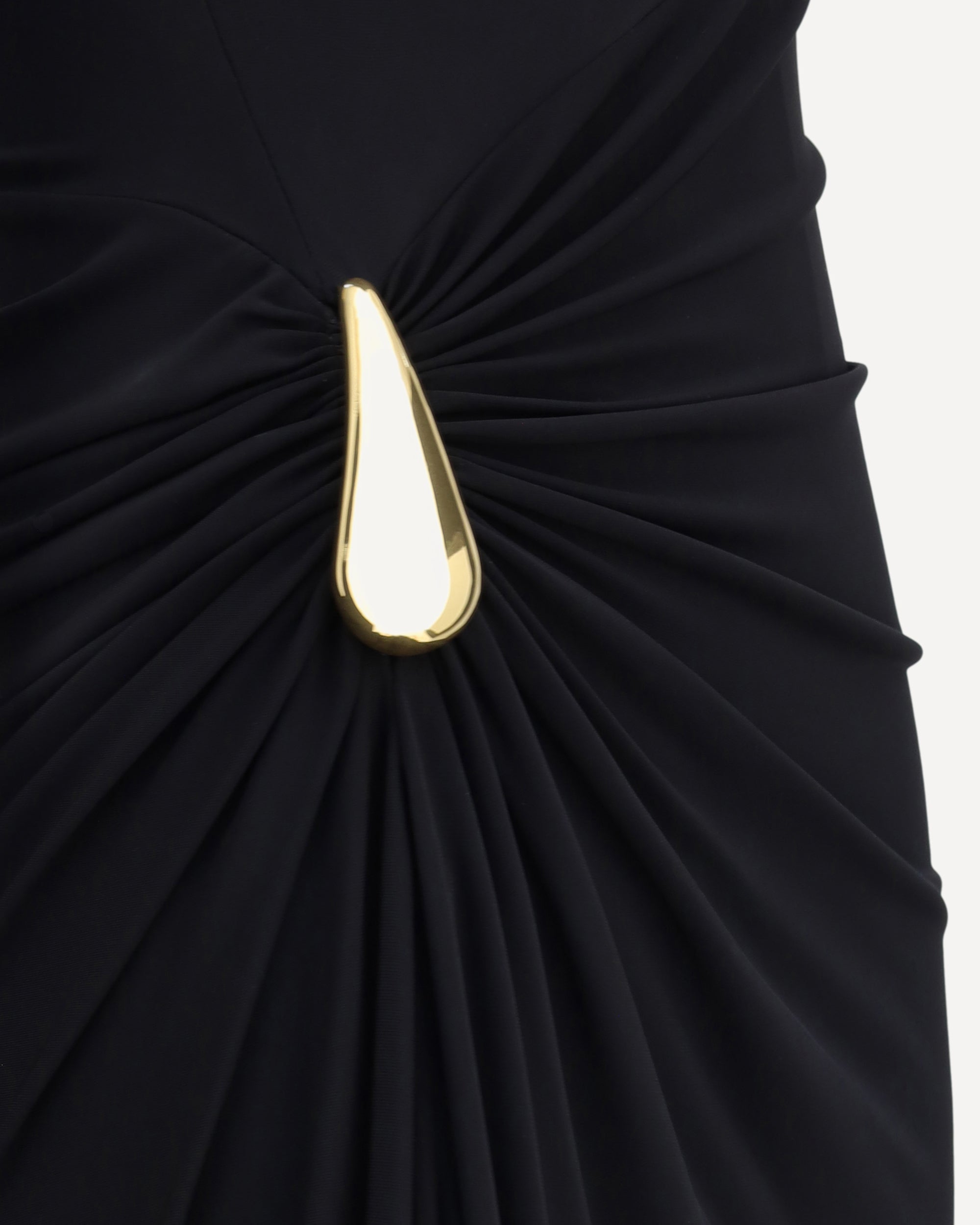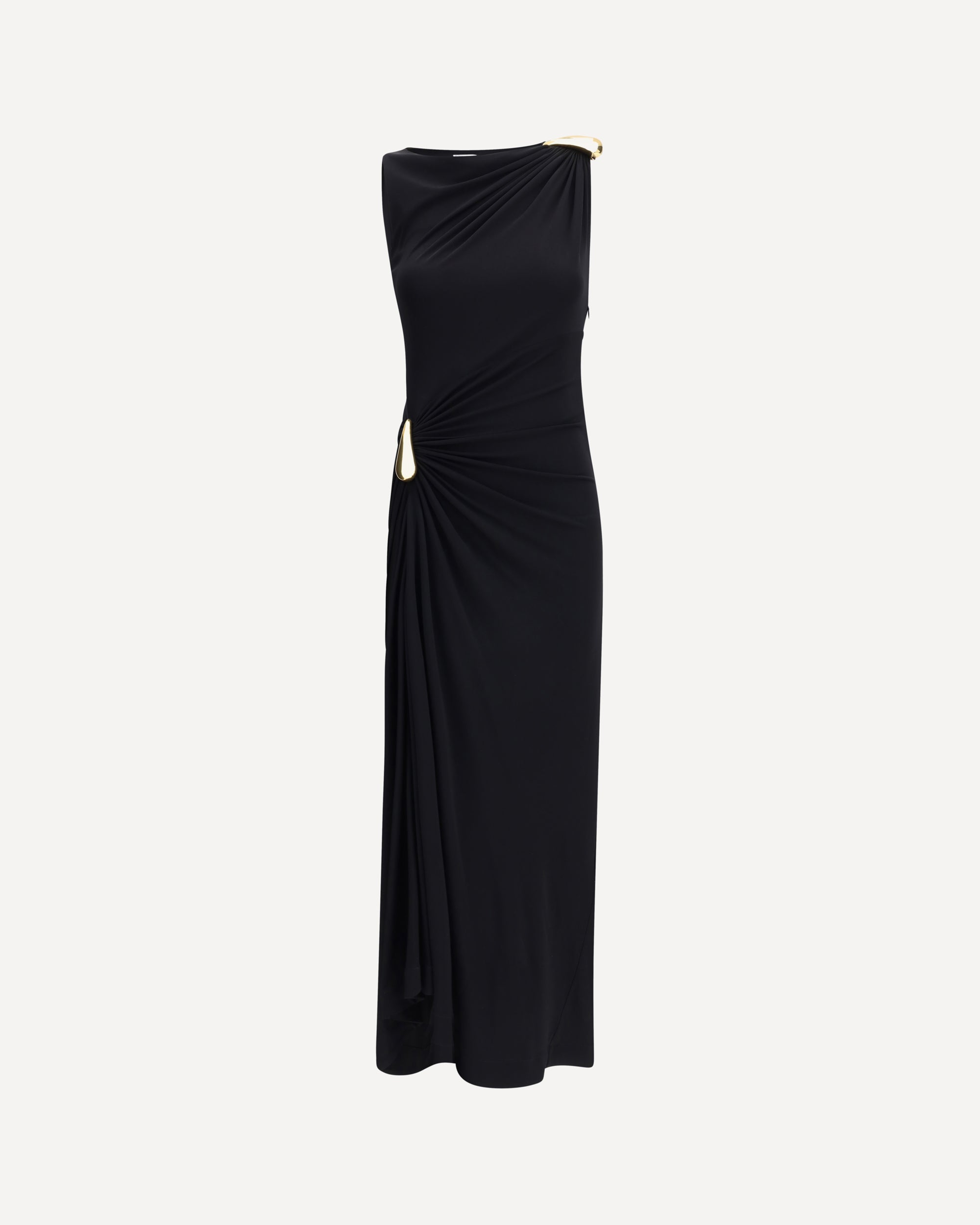 Bottega Veneta's Draped jersey Dress is a sophisticated and modern garment defined by an elegant drape enhanced by metallic details on the side and top. Featuring a round neckline and a concealed zipper closure at the hip, it is made without lining for a light, fitted fit that enhances the silhouette with essential style.