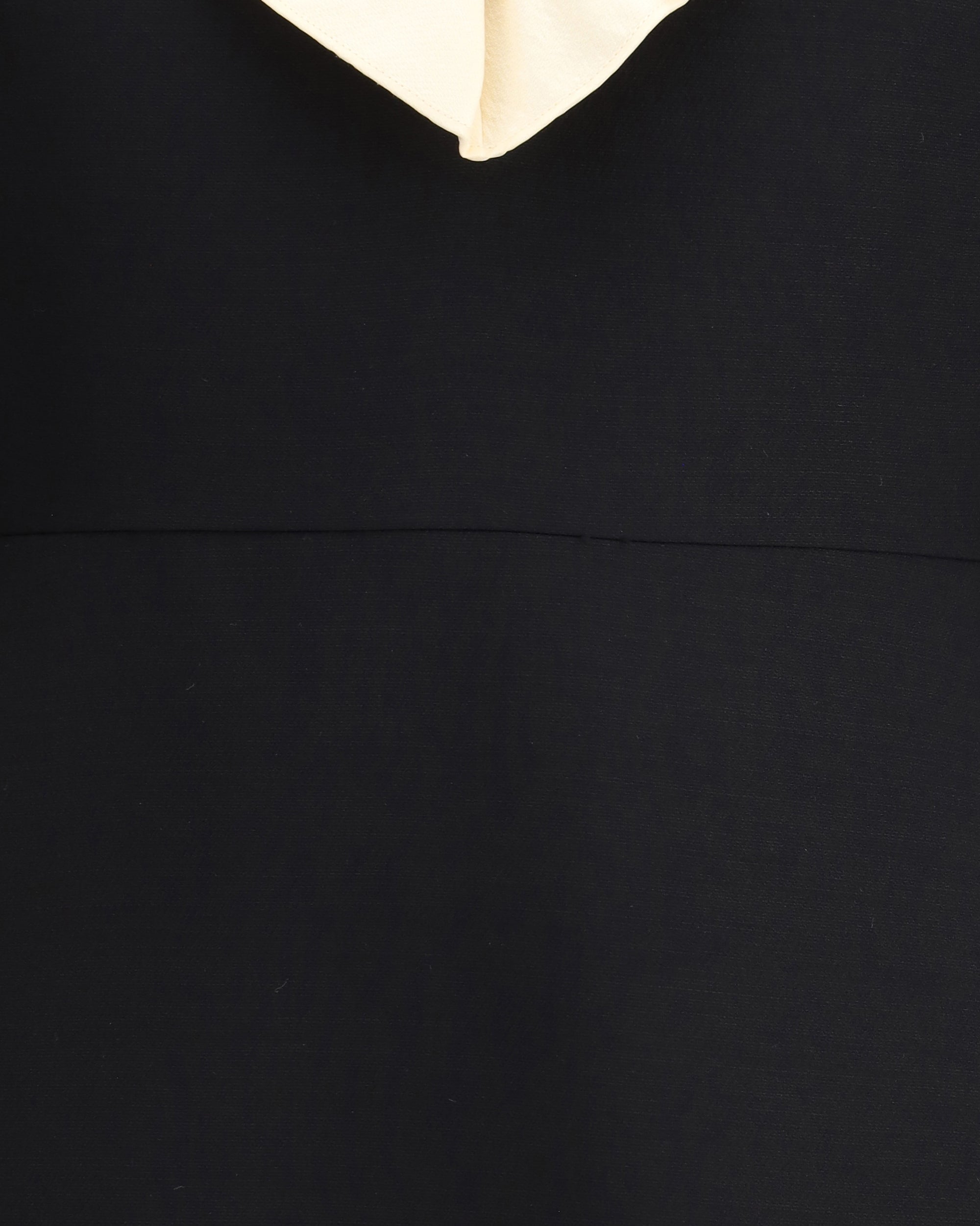 Valentino's Wool and Silk Short Dress features a deep V-neckline that enhances the silhouette. The concealed back zipper closure keeps the design clean and elegant, while the three-quarter sleeves are embellished with a delicate voile detail that lends lightness and sophistication to the garment.