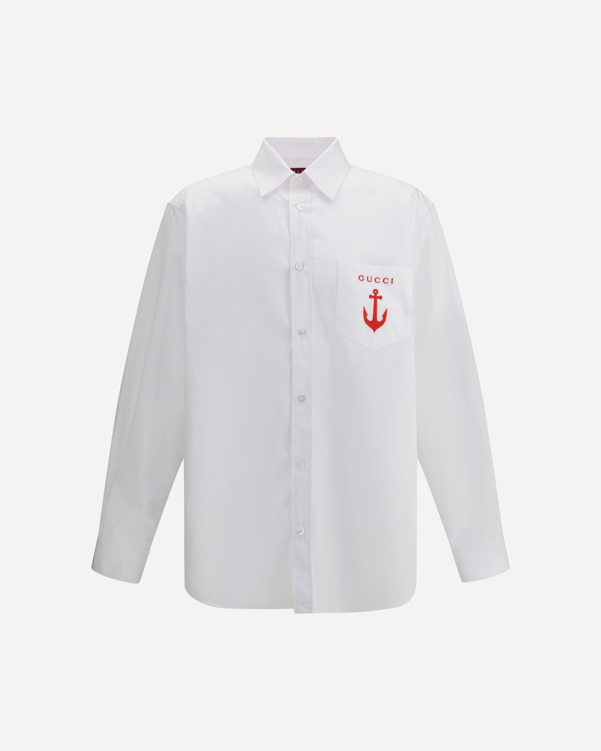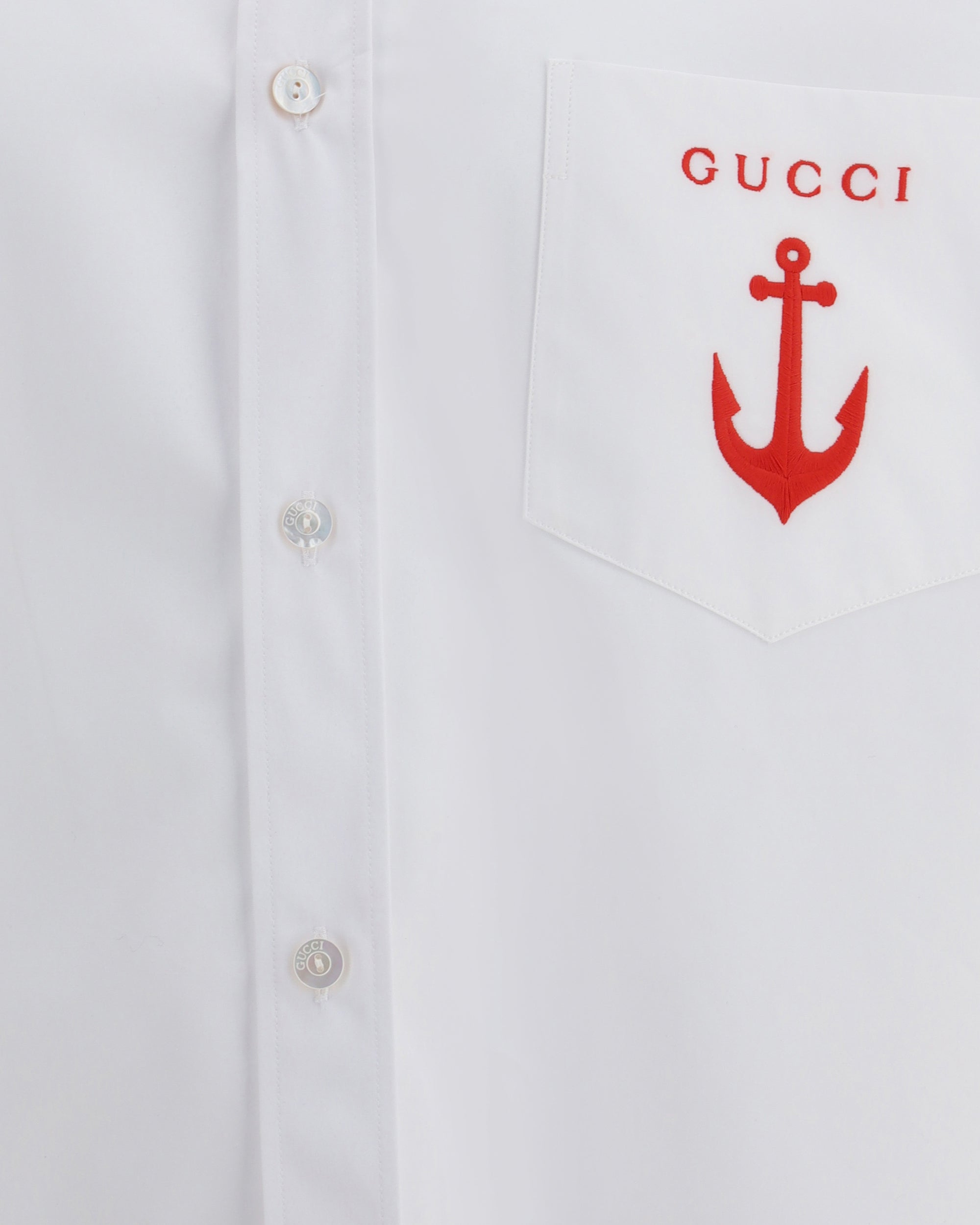 Gucci's cotton Shirt is a sophisticated and versatile piece, ideal for adding a touch of class to your everyday wardrobe. With its classic collar and front button closure, this shirt follows a simple and elegant line. The distinctive detail is the patch pocket on the front, embellished with the signature stitched detail, which adds an element of understated sophistication. Made of soft, high-quality cotton, this shirt is perfect for creating both formal and casual looks, thanks to its versatility and the unmistakable elegance of the Gucci brand.