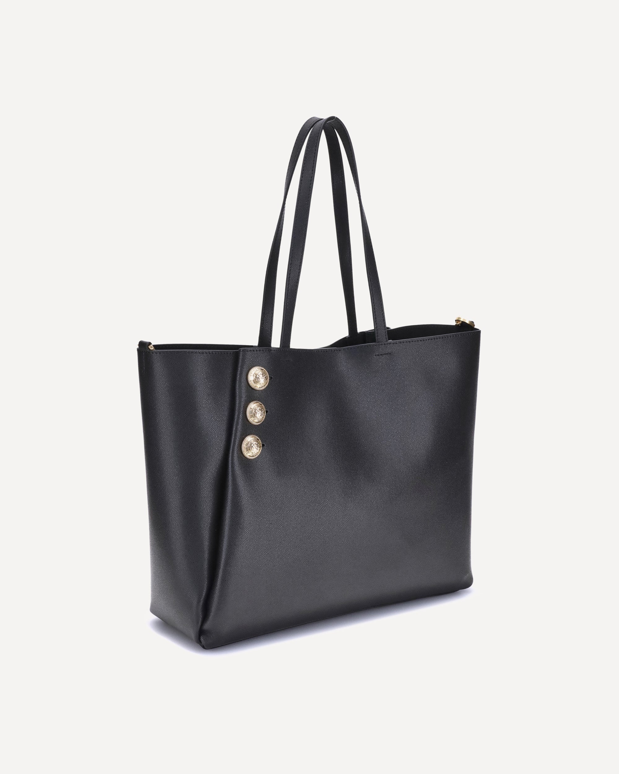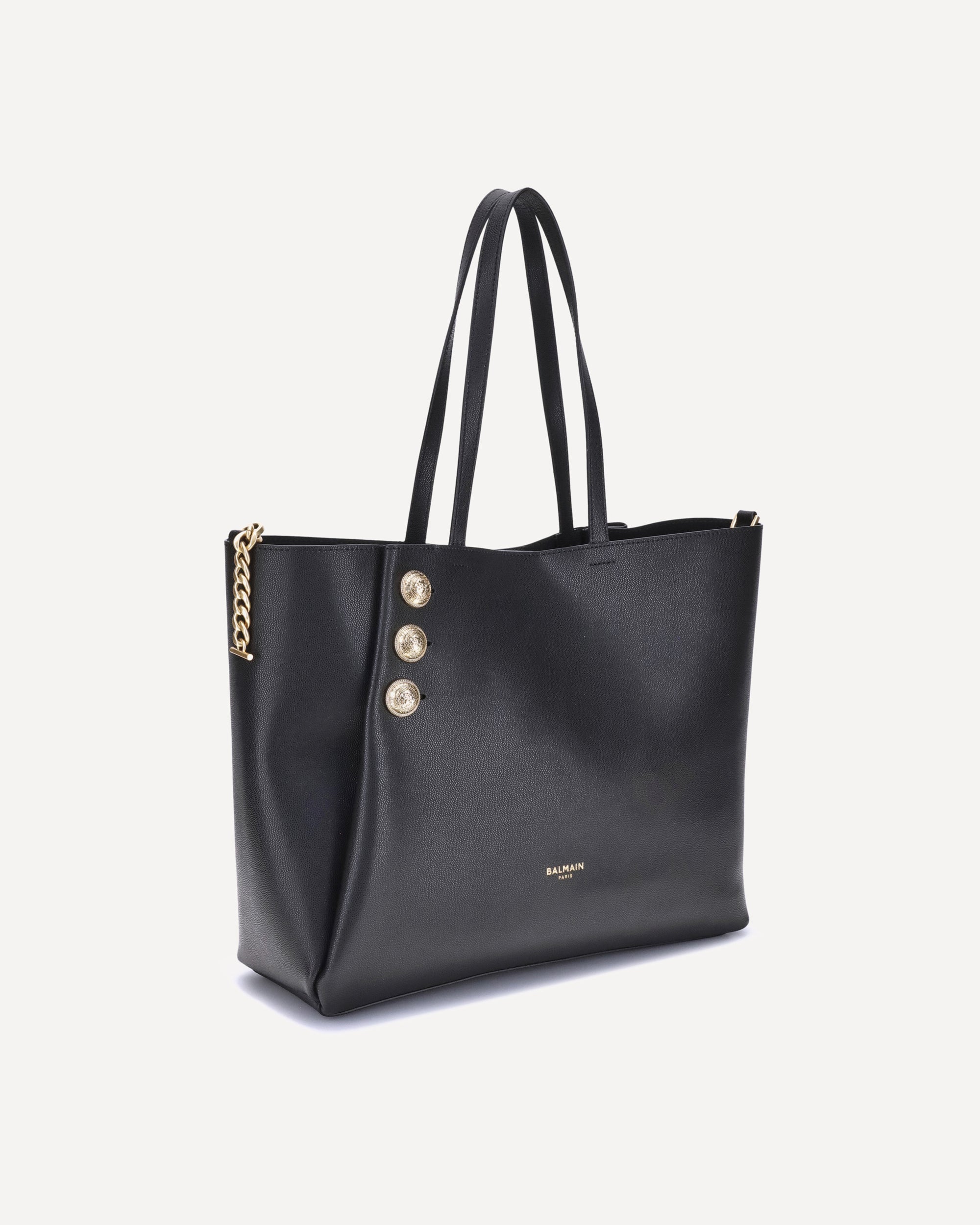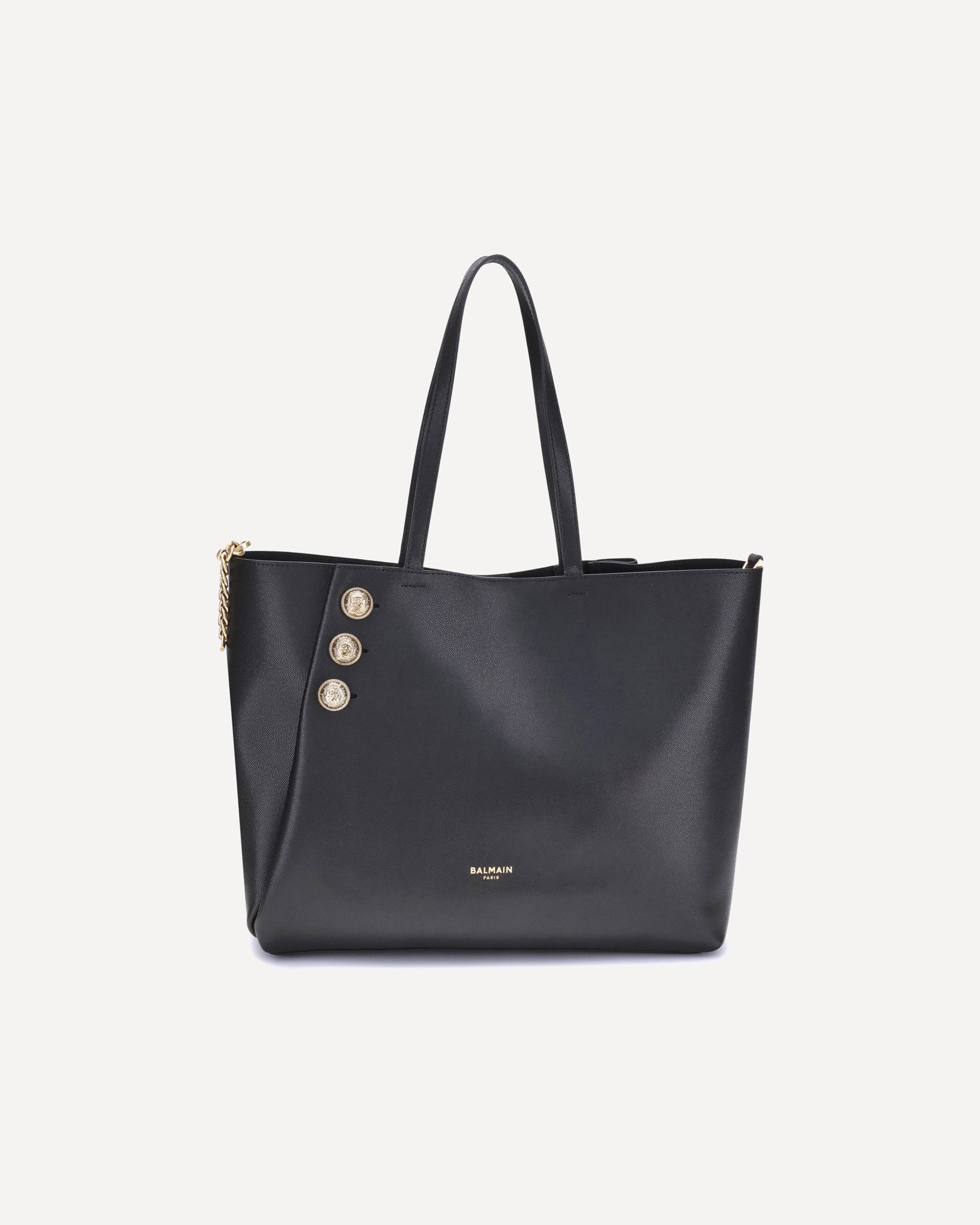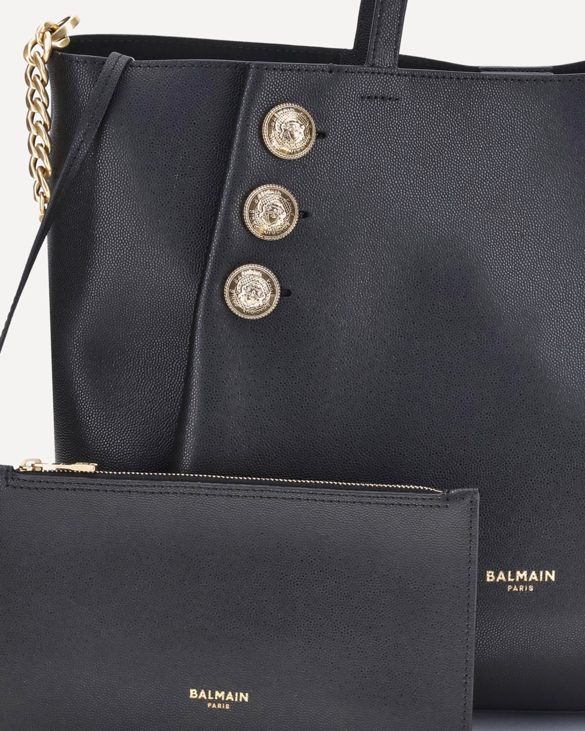 Balmain's Emblème leather Tote Bag has a structured and elegant design. Equipped with two flat top handles, it features a trompe-l'œil magnetic button closure, enriched with three decorative gold metal "Coin" buttons on both front and back. The sides are embellished with a chain closure and pin detail. Inside, a single compartment houses a removable zippered leather pouch, ideal for keeping essentials close at hand. The golden Balmain logo and the iconic monogram press-stamped on the front complete the design with a distinctive and sophisticated touch.