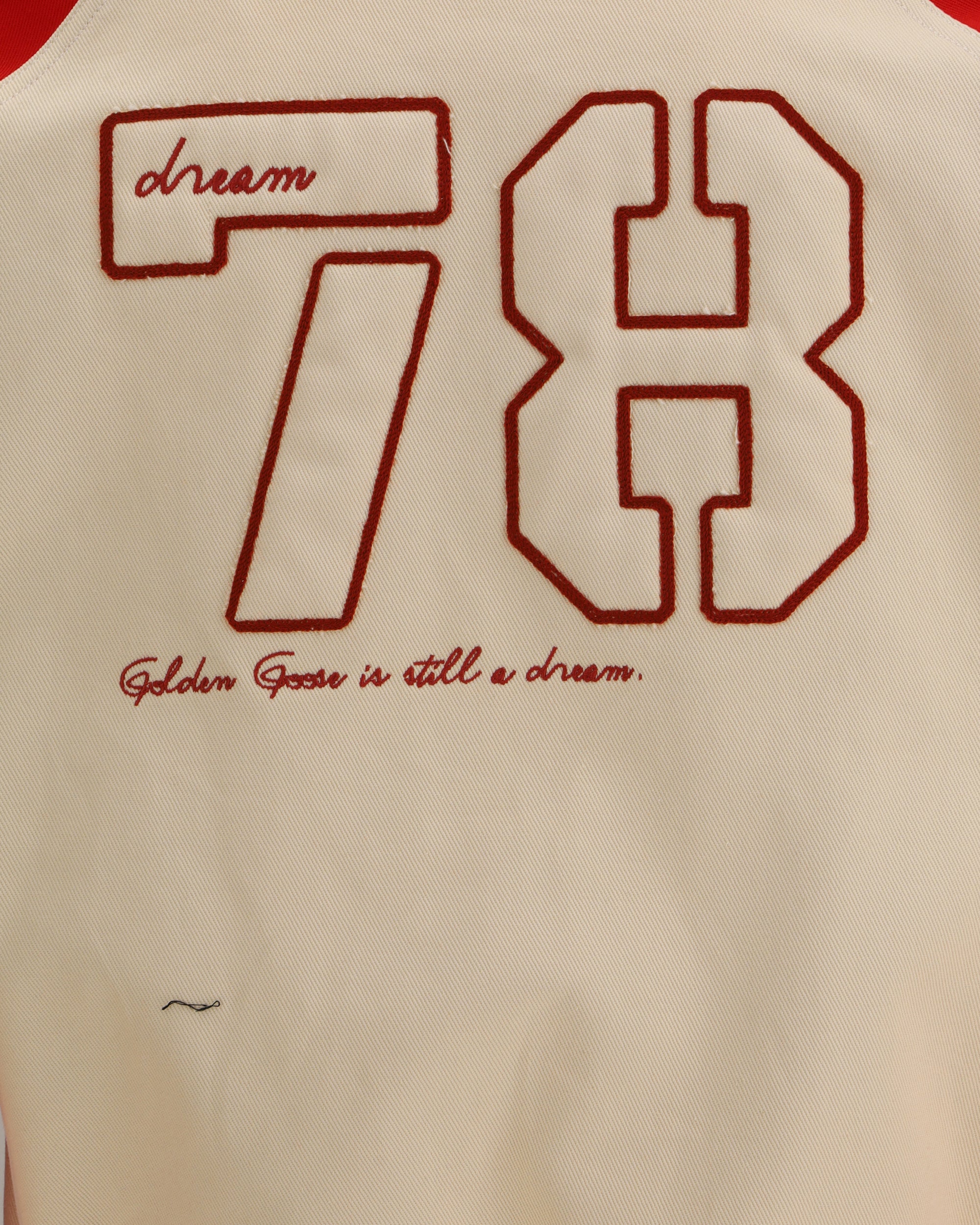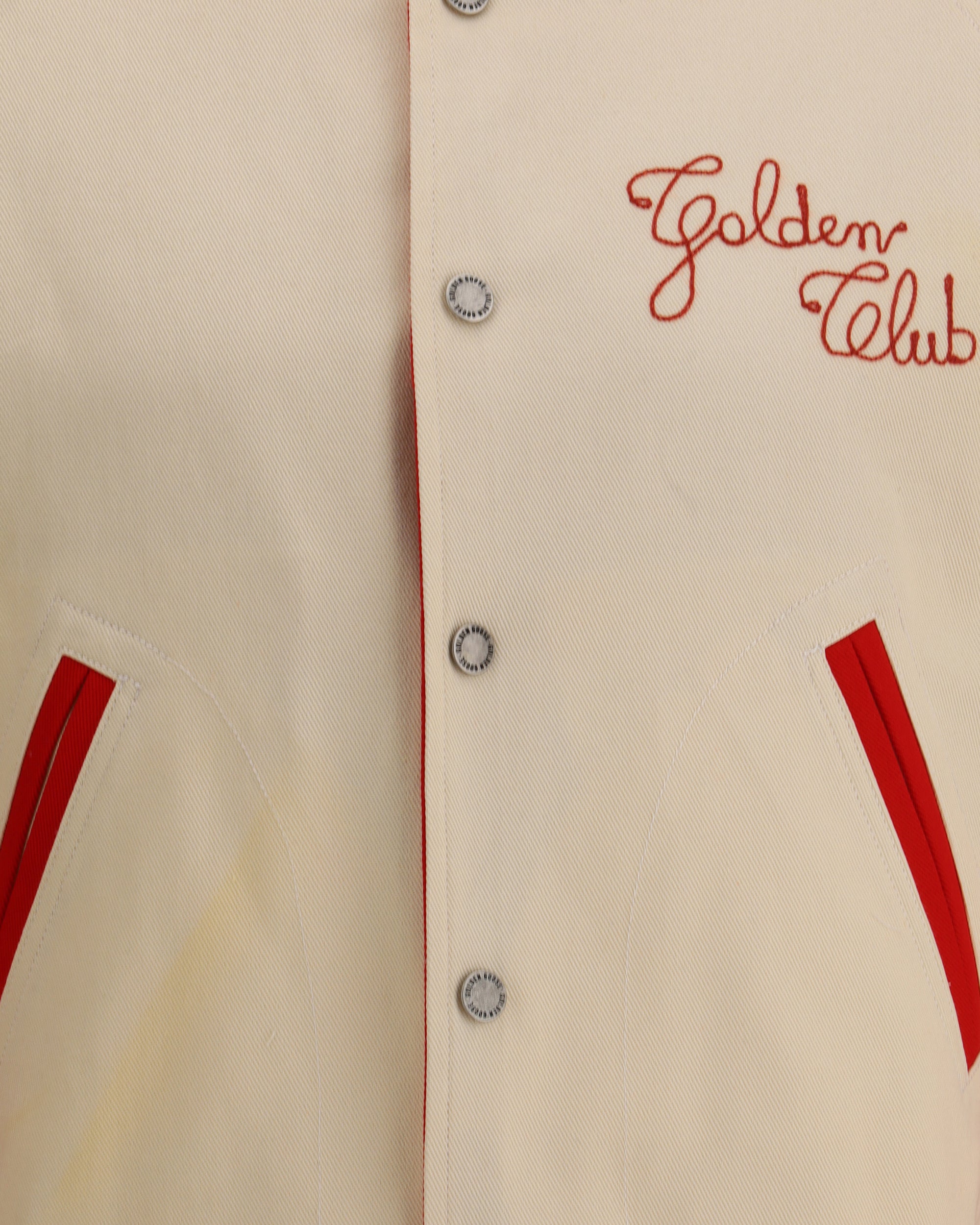 Golden Goose's Embroidered bomber Jacket is a sporty and stylish piece that combines comfort with distinctive details. With a ribbed plush collar, hem and cuffs, it provides a comfortable and casual fit. The front snap button closure and two side welt pockets add functionality to the design. The iconic embroidered logo on the front and back lends an exclusive and recognizable touch, making this jacket perfect for an urban, edgy look.