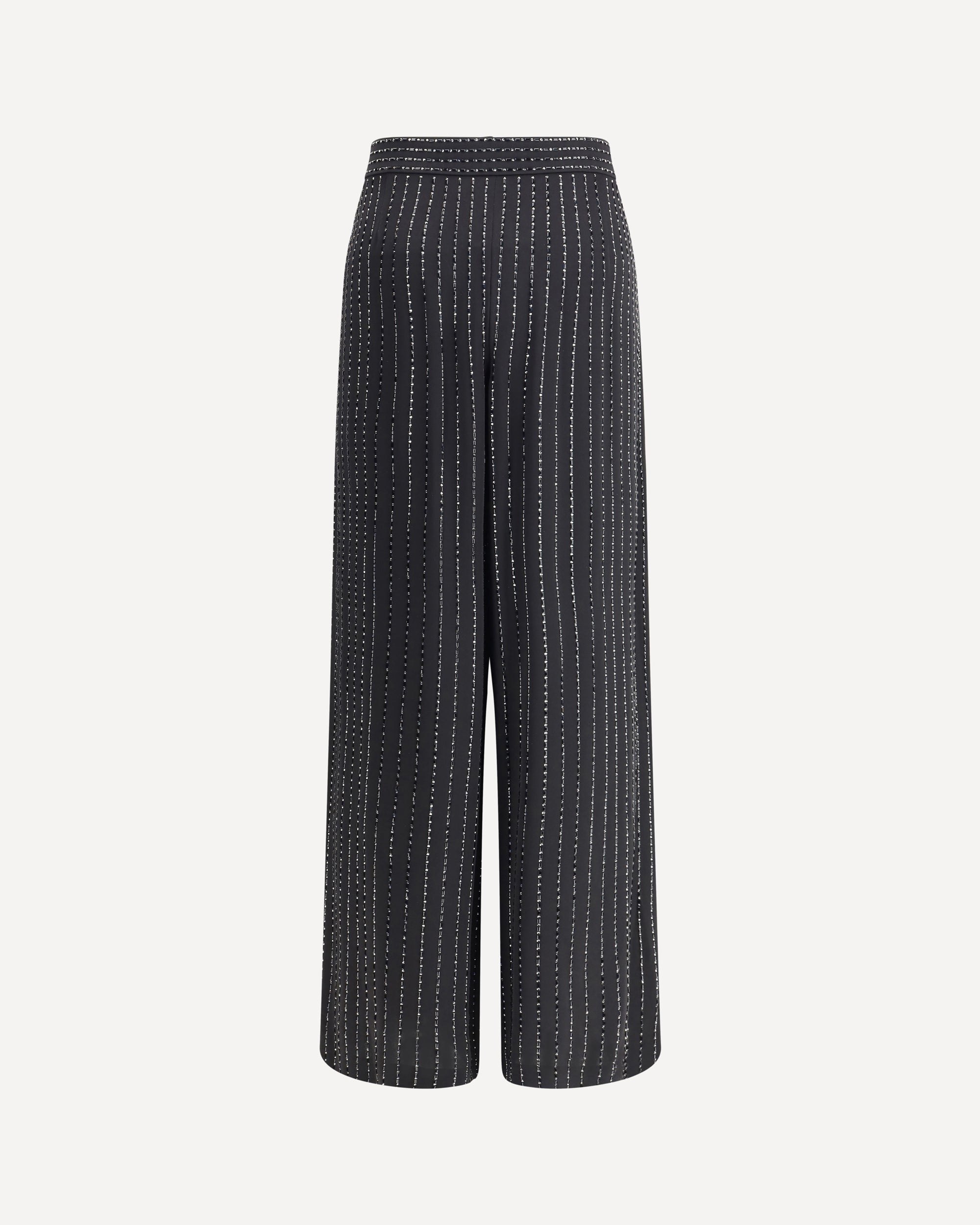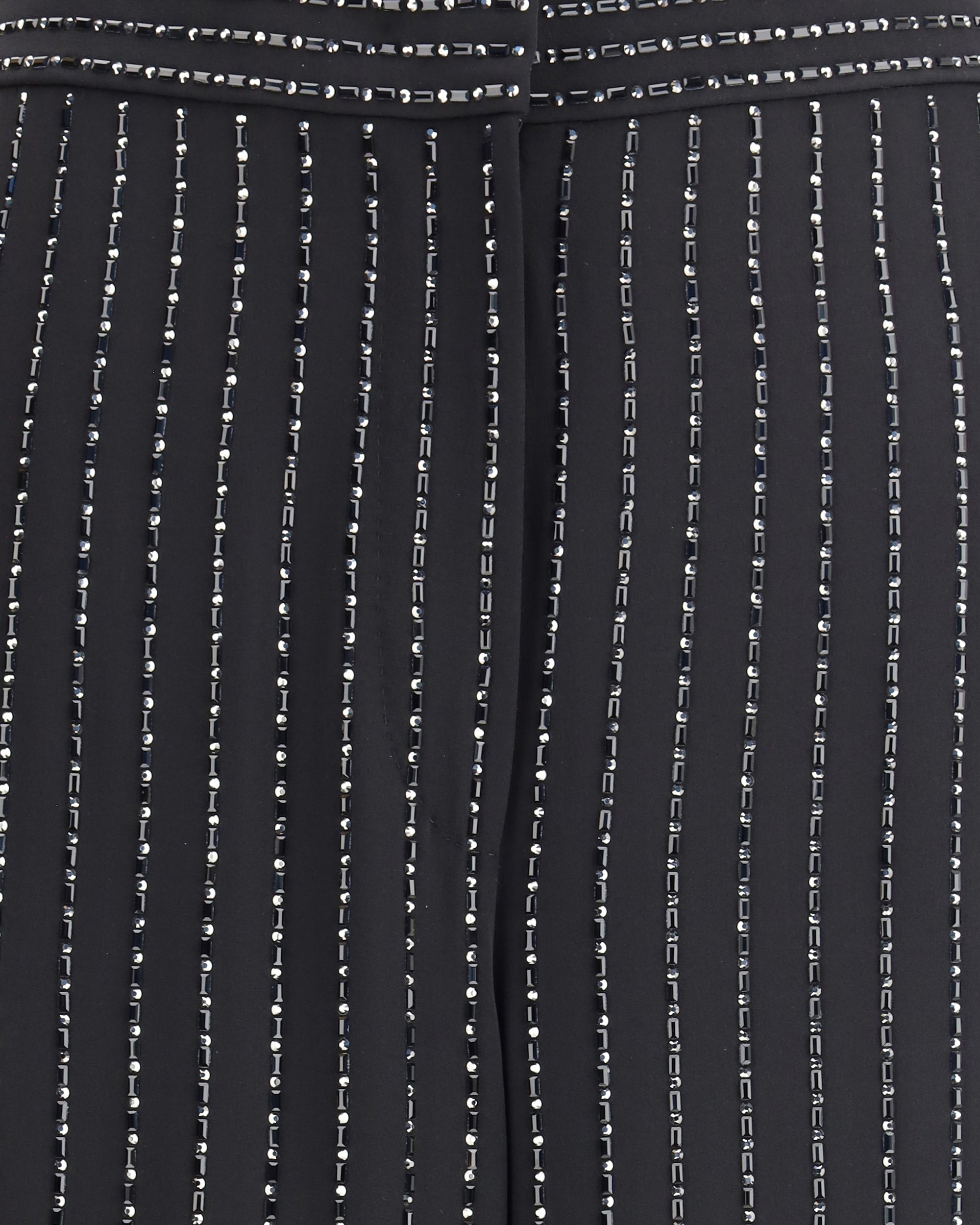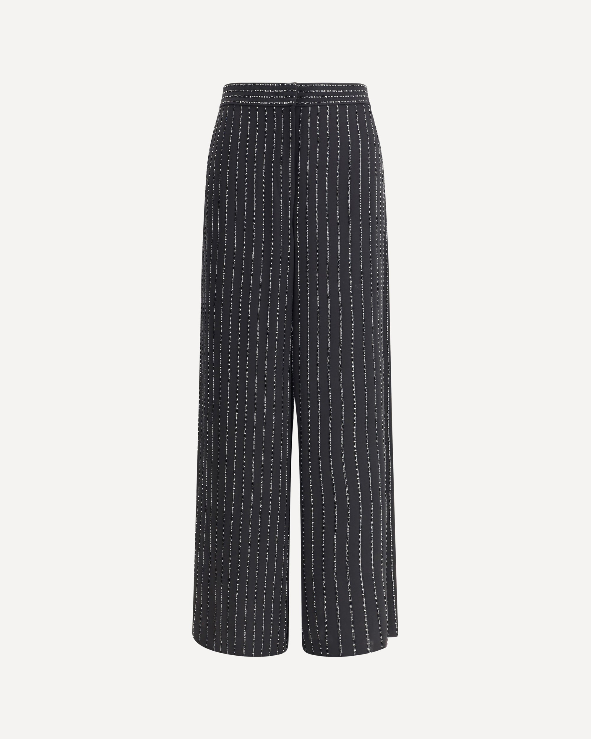 Giorgio Armani's wide-leg silk Pants stand out for their elegant flowing lines and refined details. Featuring a smooth waistband, concealed fastening, and side pockets, they are embellished with rich, tone-on-tone embroidery made with baguettes and sequins, creating a luminous pinstripe pattern, lending the garment a touch of glamour and sophistication.