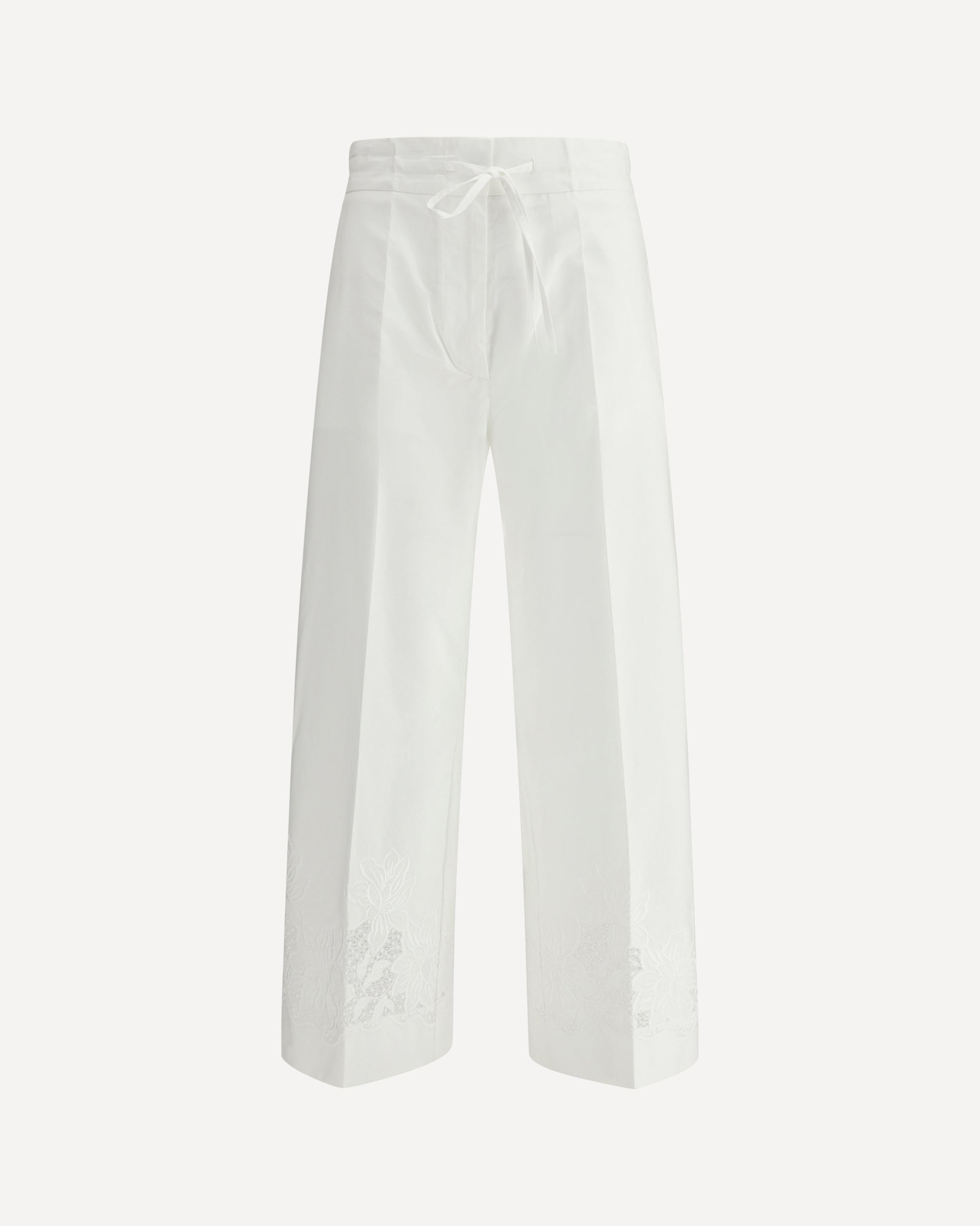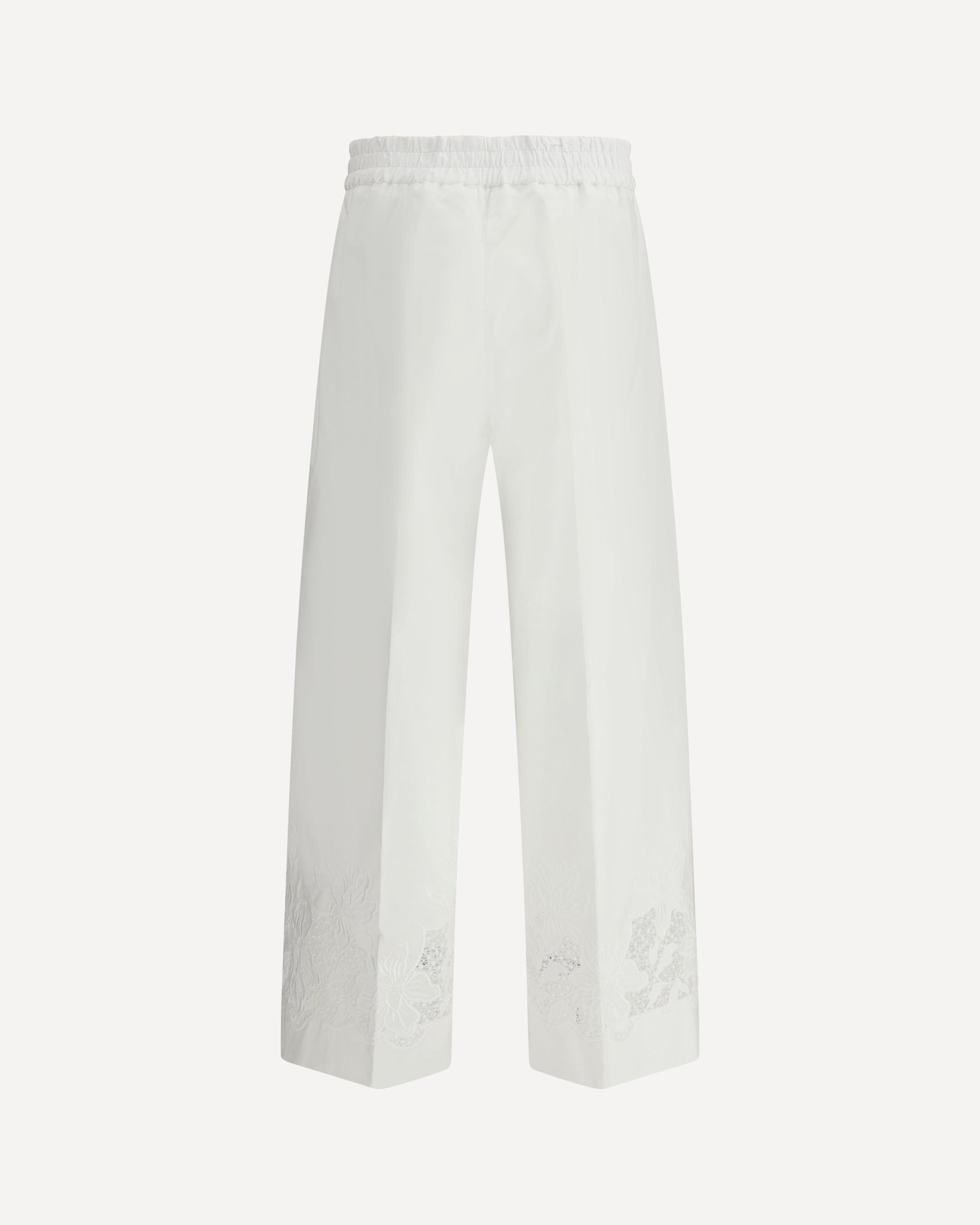 The P.A.R.O.S.H. cotton Pants are an elegant and versatile garment, combining comfort and style. The elasticated waistband on the back ensures a comfortable and adjustable fit, while the two side welt pockets add a practical and refined touch. The wide leg gives a fluid and relaxed silhouette, perfect for a casual-chic look. The floral embroidery on the bottom gives a touch of originality and femininity to the garment, creating a delicate and sophisticated contrast. These trousers are ideal for a spring or summer outfit, which expresses elegance with a touch of freshness.