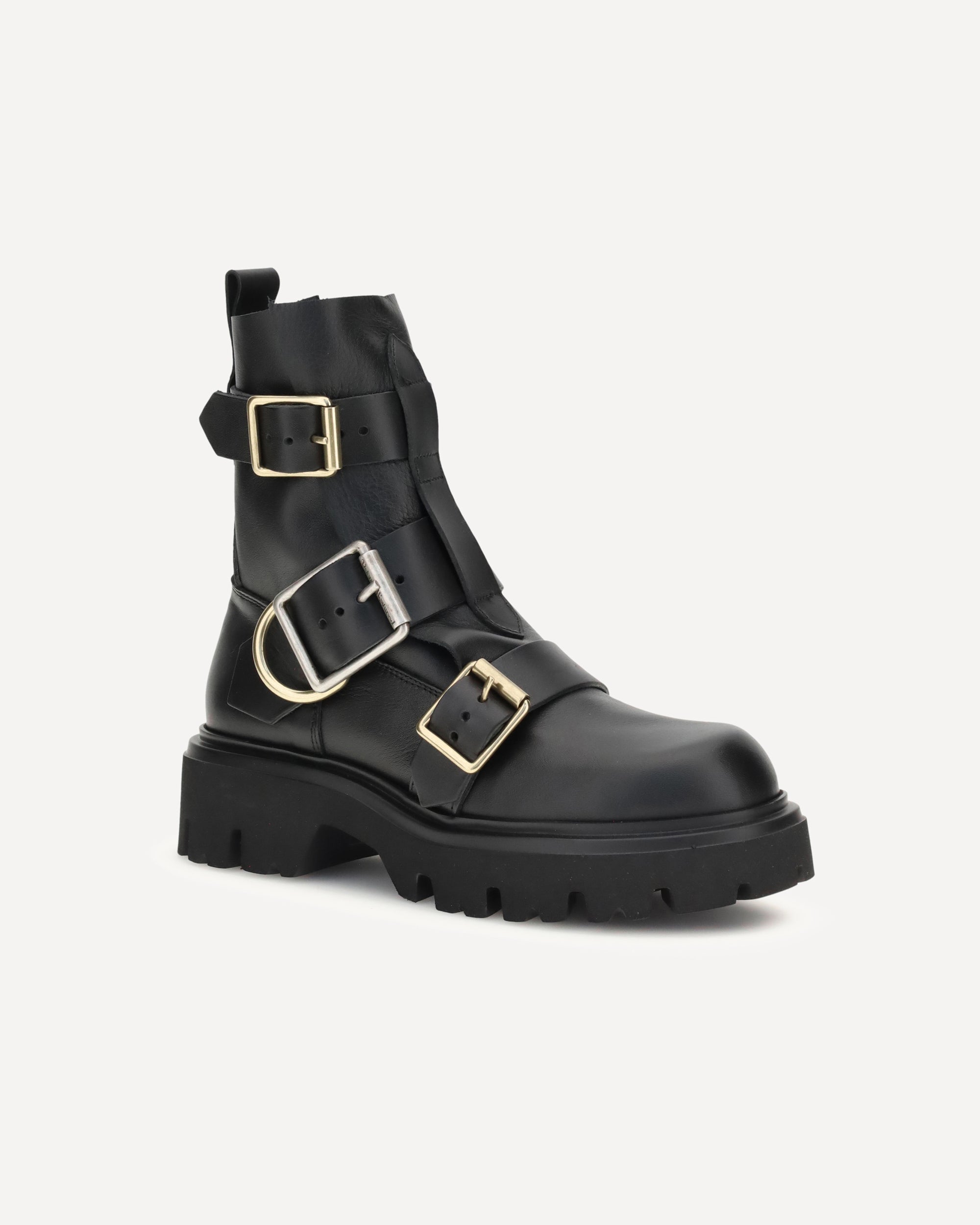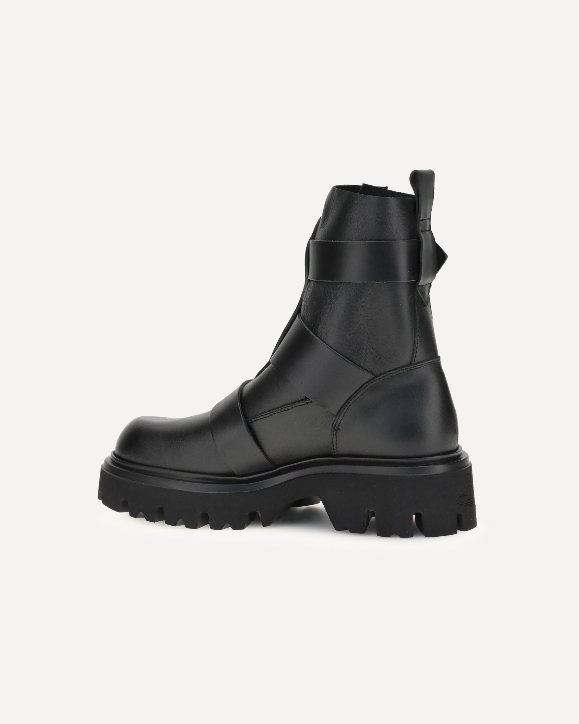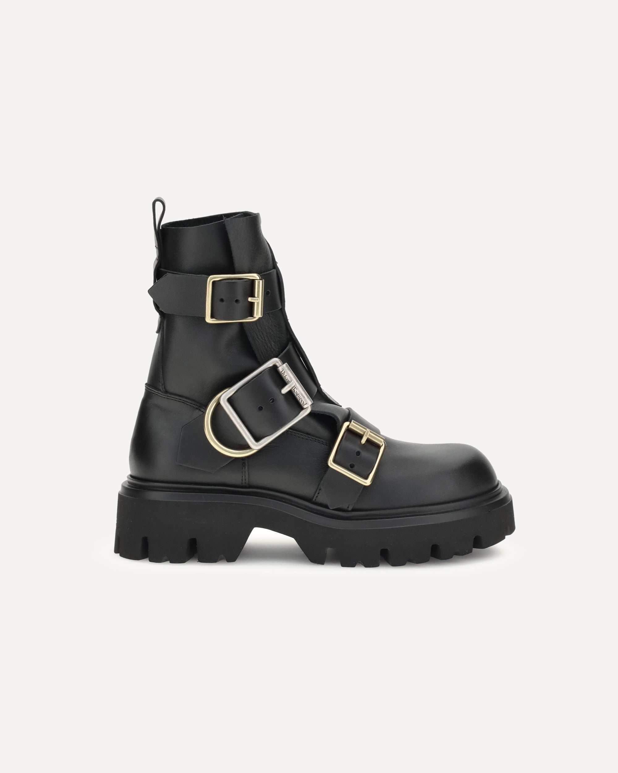 Vivienne Westwood's Empire Ankle Boots reinterpret military style with a bold and provocative aesthetic. Made of waxed leather with a glossy finish, they feature buckled straps inspired by the world of bondage and fetish, distinctive elements of the Maison's design language. The ankle-length model is complemented by a rounded toe, slip-on sole, tone-on-tone stitching and mixed-metal details for a bold look with a strong visual impact.