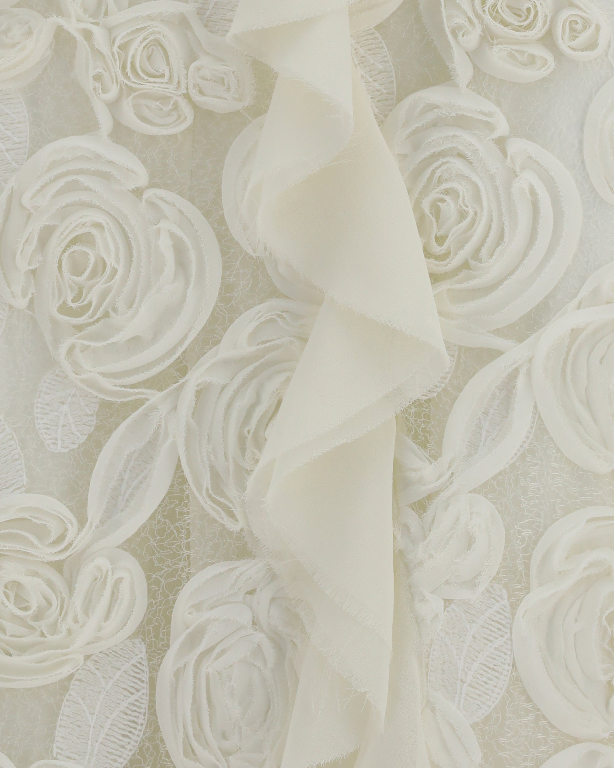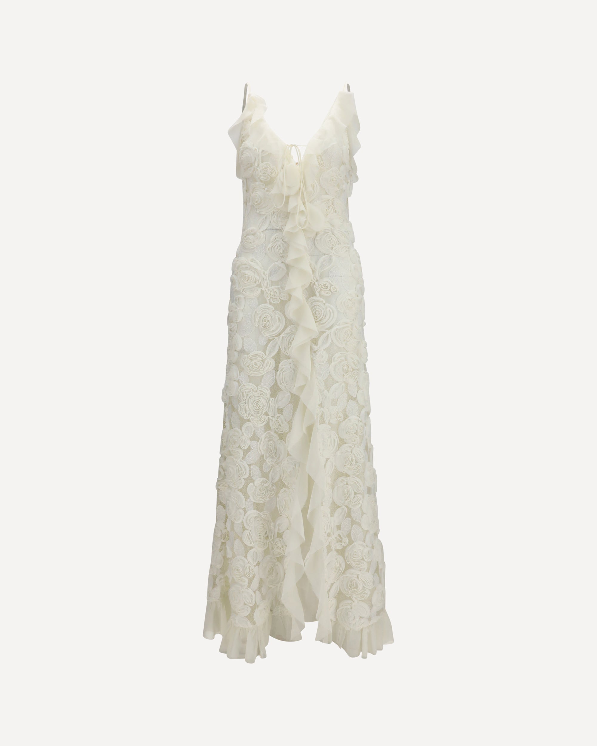 The long evening Dress by Nissa expresses elegance and sensuality through a refined and contemporary design. Thin straps and a V neckline enhance the silhouette, while front ruching adds movement and femininity. The three dimensional fabric with tulle roses creates a striking effect, enhanced by the semi transparent design and the front maxi slit that elongates the figure with a seductive touch.