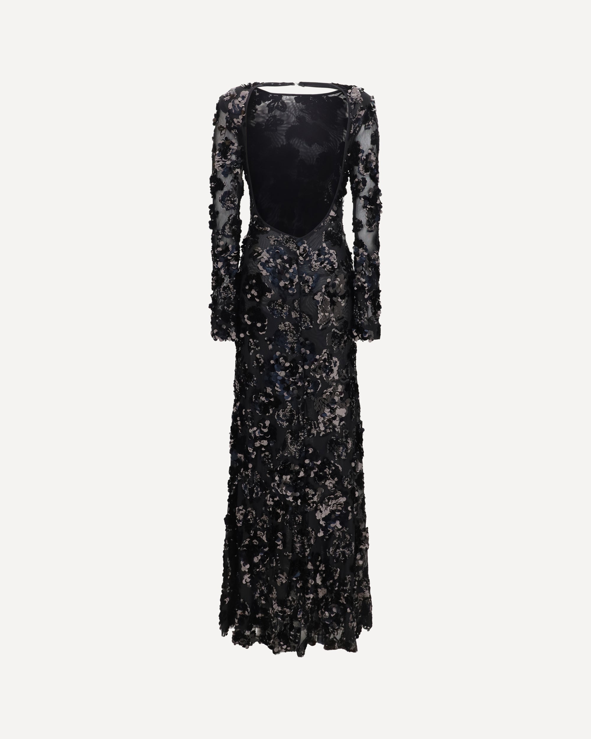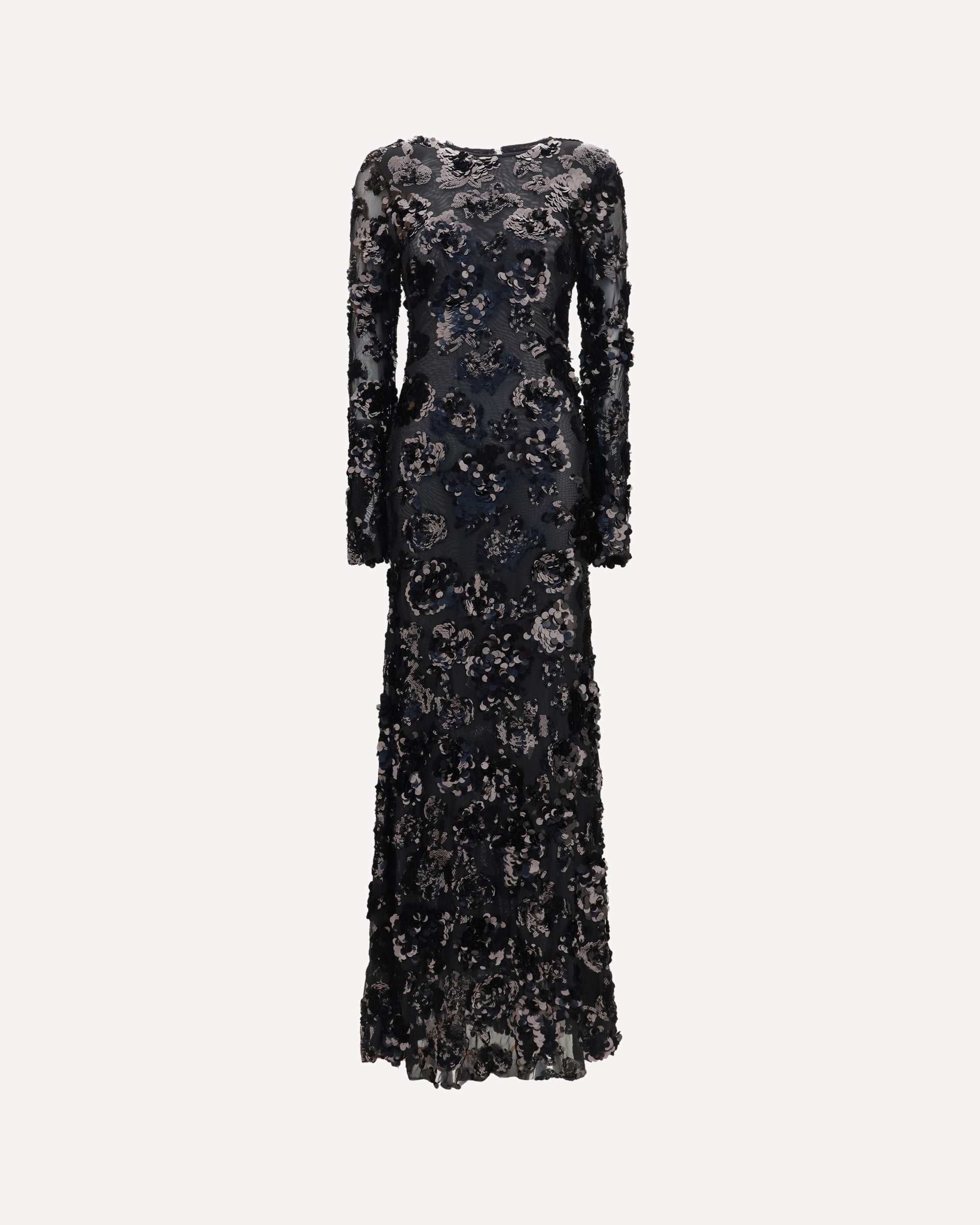 The long tulle Dress with sequins by Nissa is an elegant and statement Dress, crafted from tulle and embellished with sequins and special applications. The design features 3D floral fabric that adds depth and refinement. The model is full-length, with long sleeves and a high neckline for a sophisticated touch. The open back neckline creates a sensual and elegant contrast. Perfect for special occasions and standout looks.