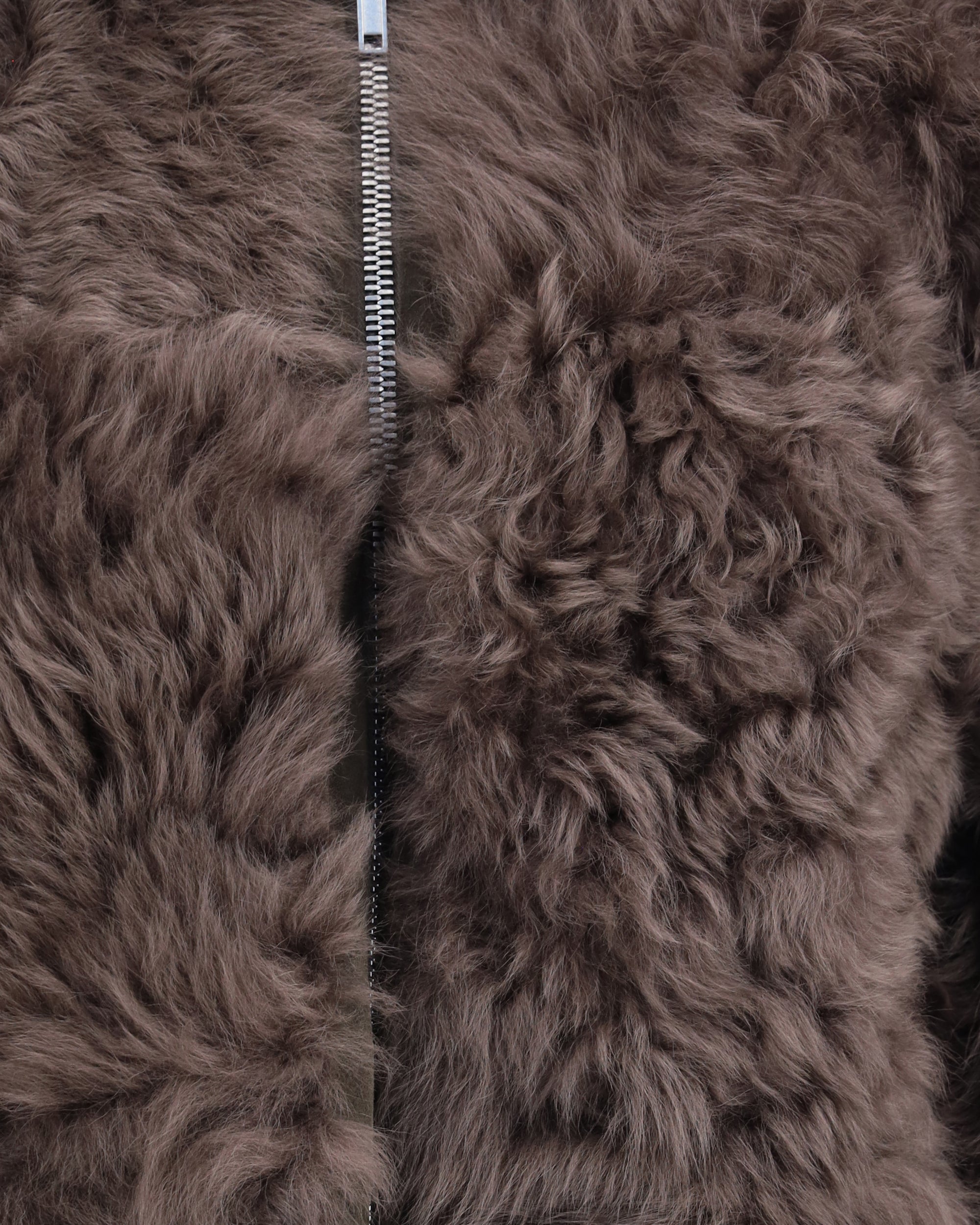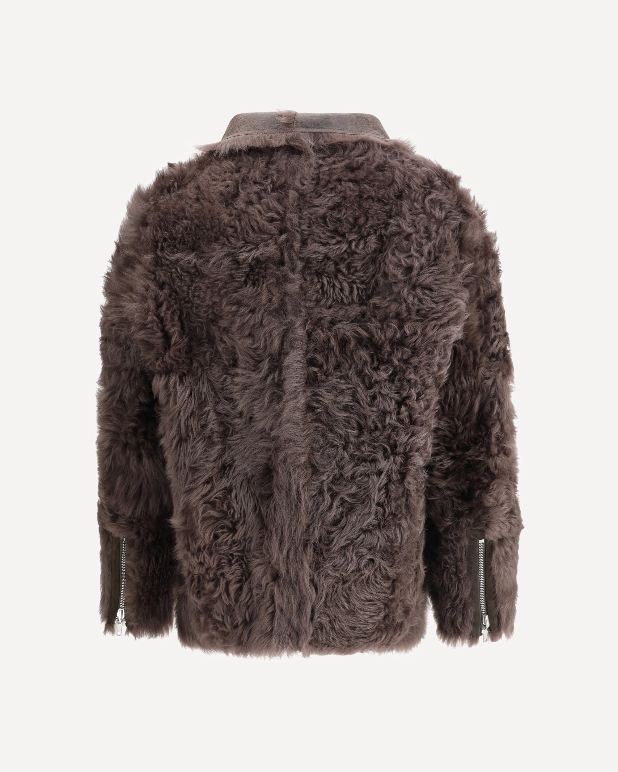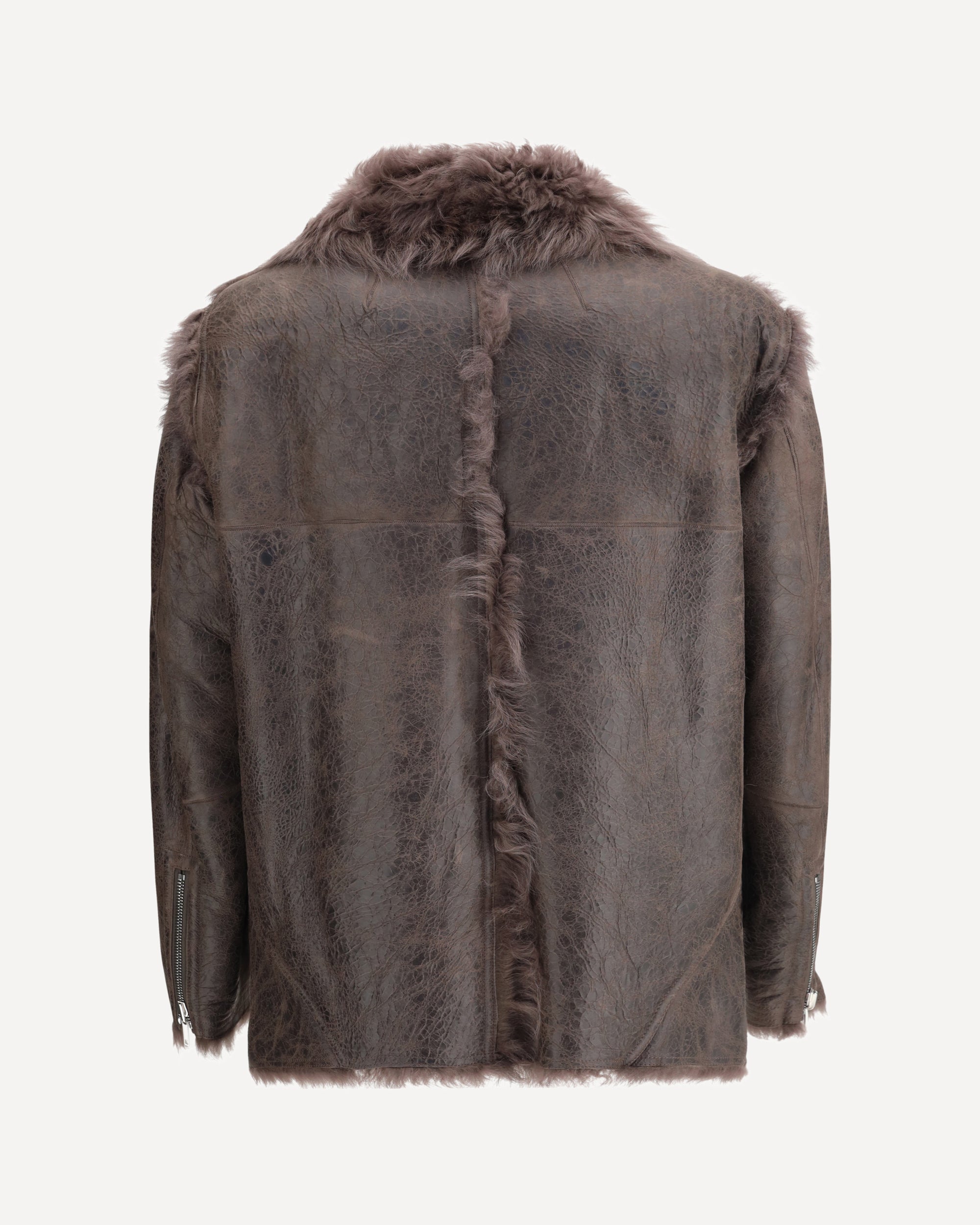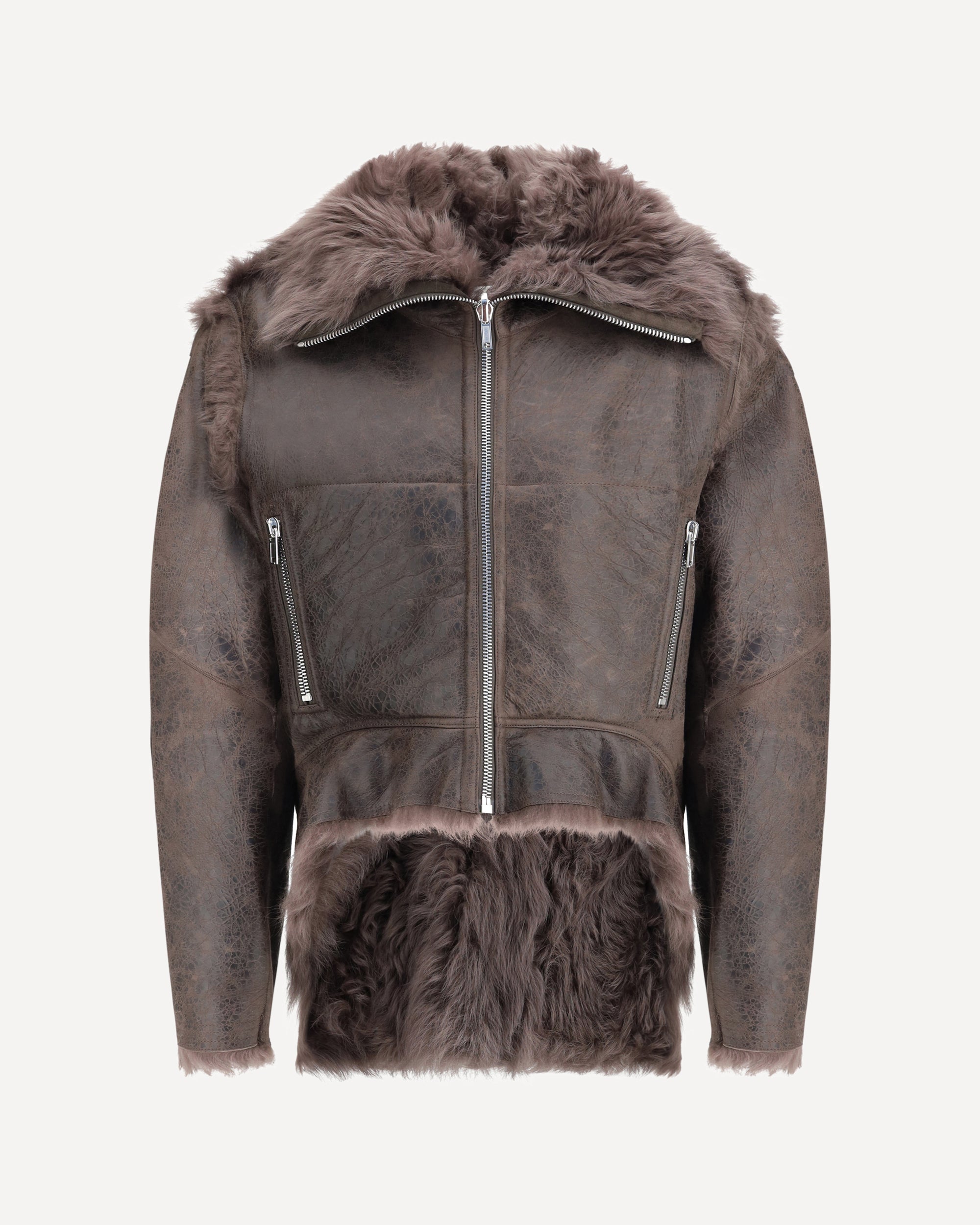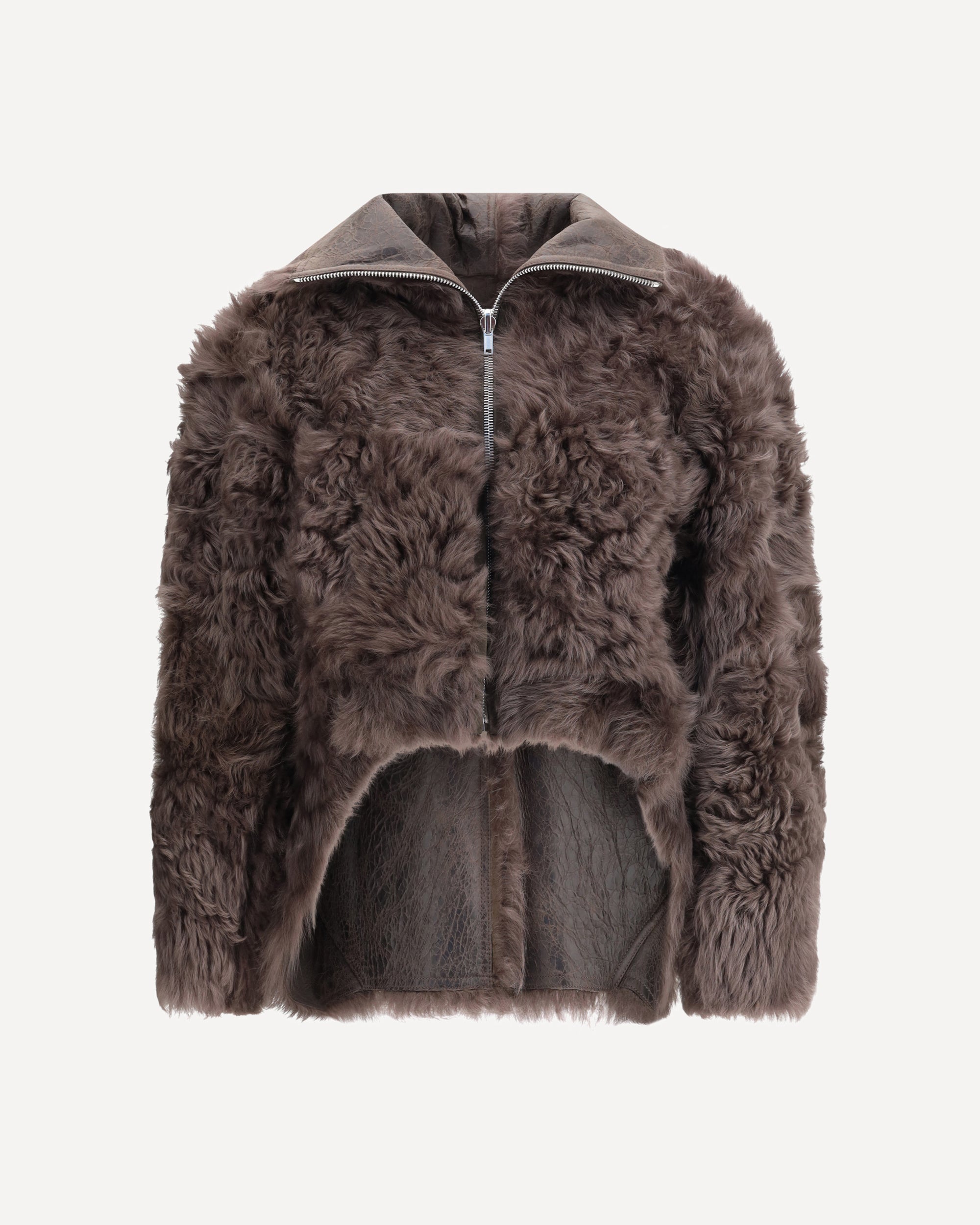 The Exploder Shearling Jacket by Rick Owens is cropped at the front and longer at the back, featuring long sleeves with zippered cuffs and a central front zipper that can be worn open or closed, creating a wide lapel. The curved hem ends in side points and includes zippered side pockets. Fully reversible, it has soft, long, curly fur on the inside.