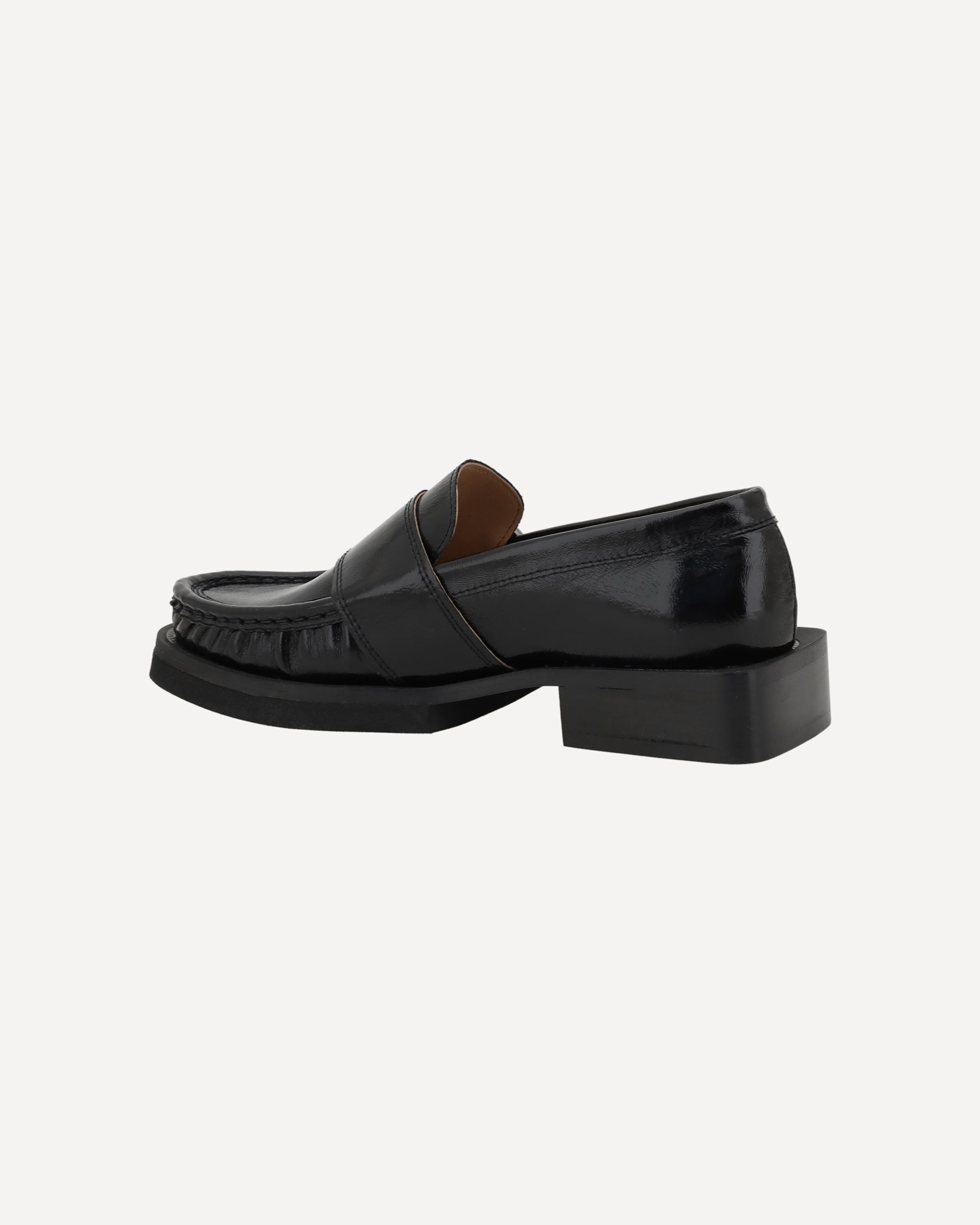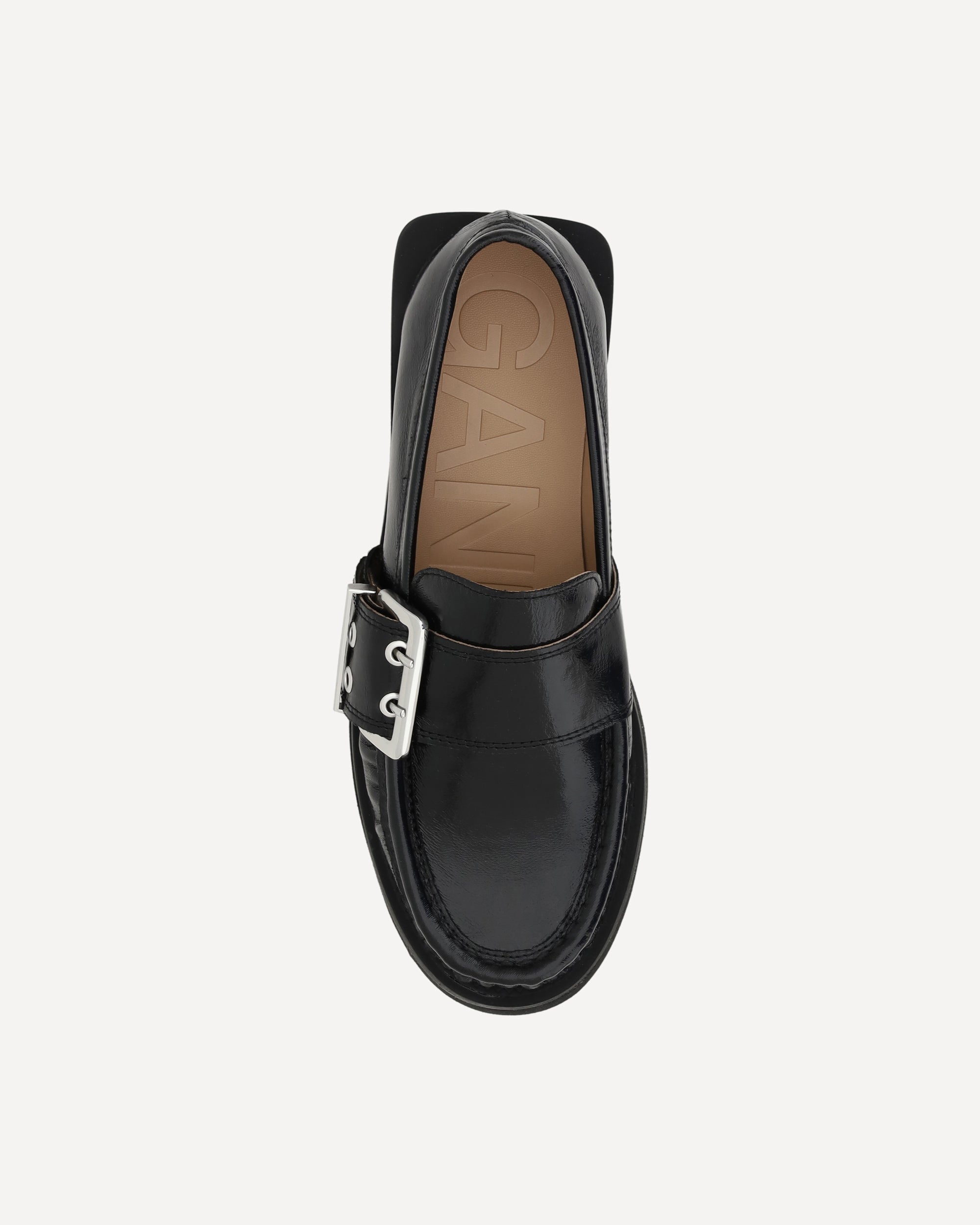 Feminine Buckle Loafers by Ganni, round toe, block heel, platform sole, buckle-embellished leather front tray, logo-embellished press-studded insole, shiny leather design.