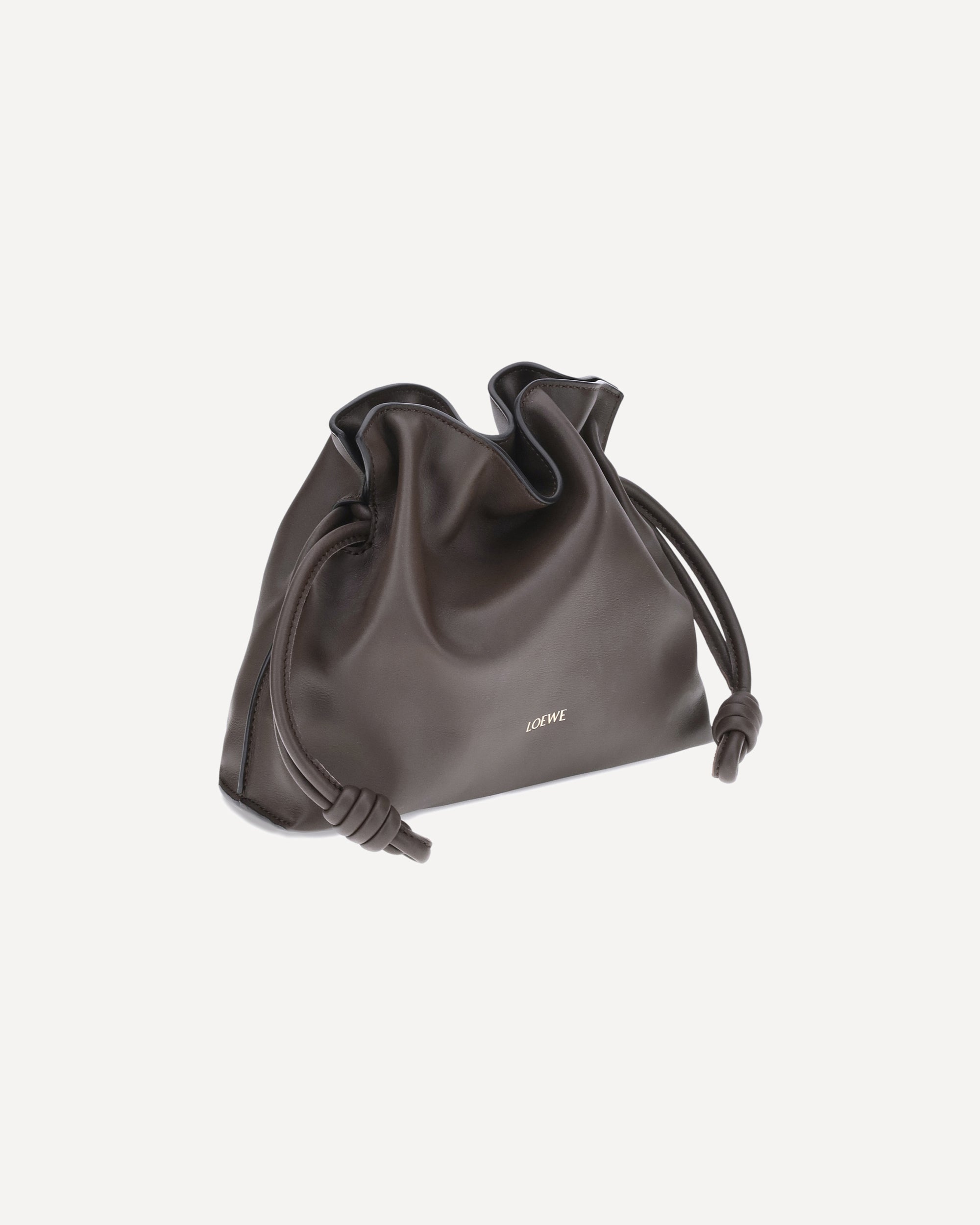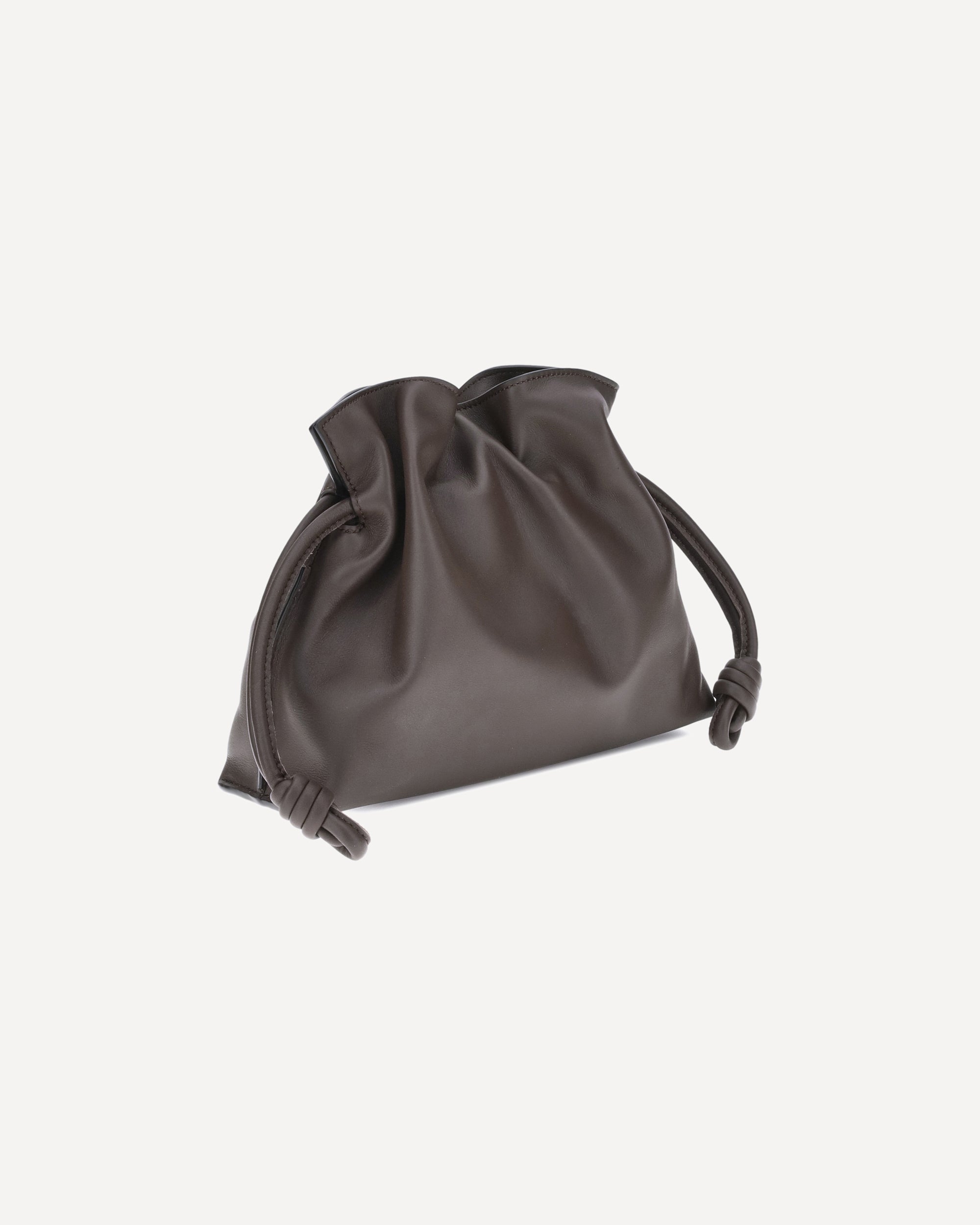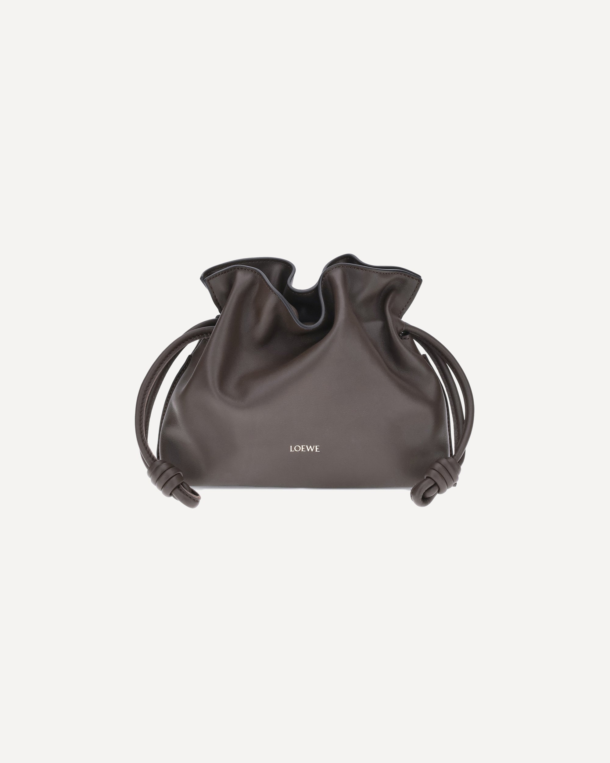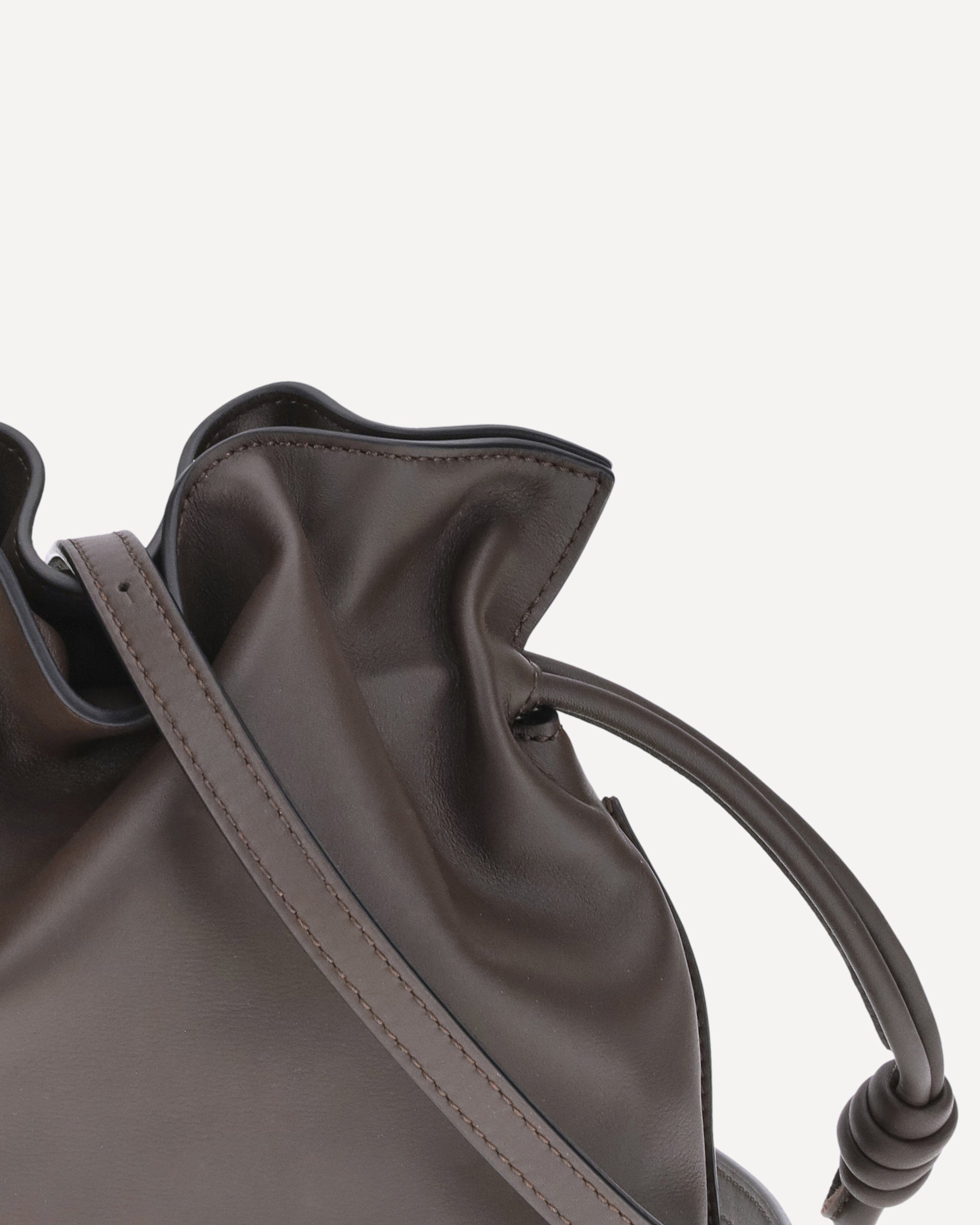The Loewe Flamenco mini leather Pouch Bag features a magnetic top closure, enriched by a drawstring with the characteristic spiral leather knots, which enhance its distinctive design. The flat leather shoulder strap is removable and adjustable, offering versatility in use. The iconic logo of the brand is pressure-printed on the front, adding an elegant touch. The interior is a single compartment, perfect for carrying essentials. A sophisticated and practical accessory, perfect for any occasion.