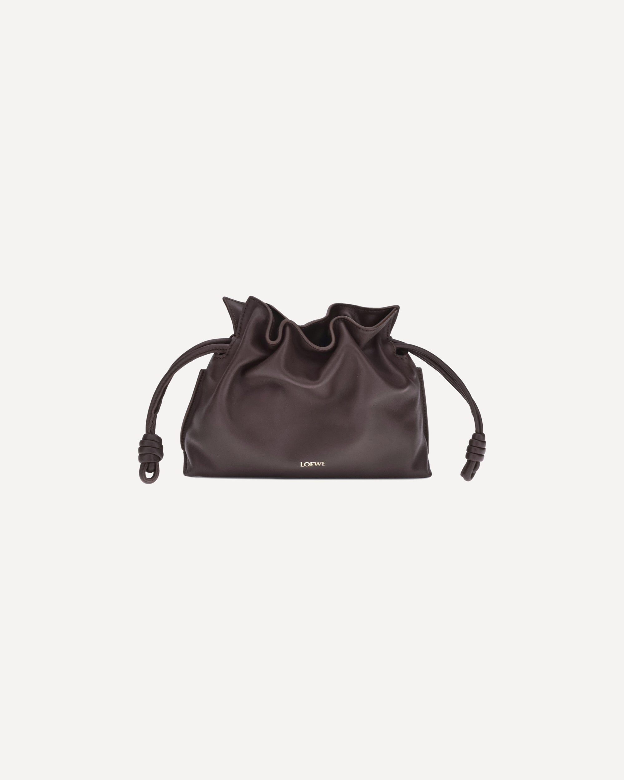 The Loewe Flamenco mini leather Pouch Bag features a magnetic top closure, enriched by a drawstring with the characteristic spiral leather knots, which enhance its distinctive design. The flat leather shoulder strap is removable and adjustable, offering versatility in use. The iconic logo of the brand is pressure-printed on the front, adding an elegant touch. The interior is a single compartment, perfect for carrying essentials. A sophisticated and practical accessory, perfect for any occasion.